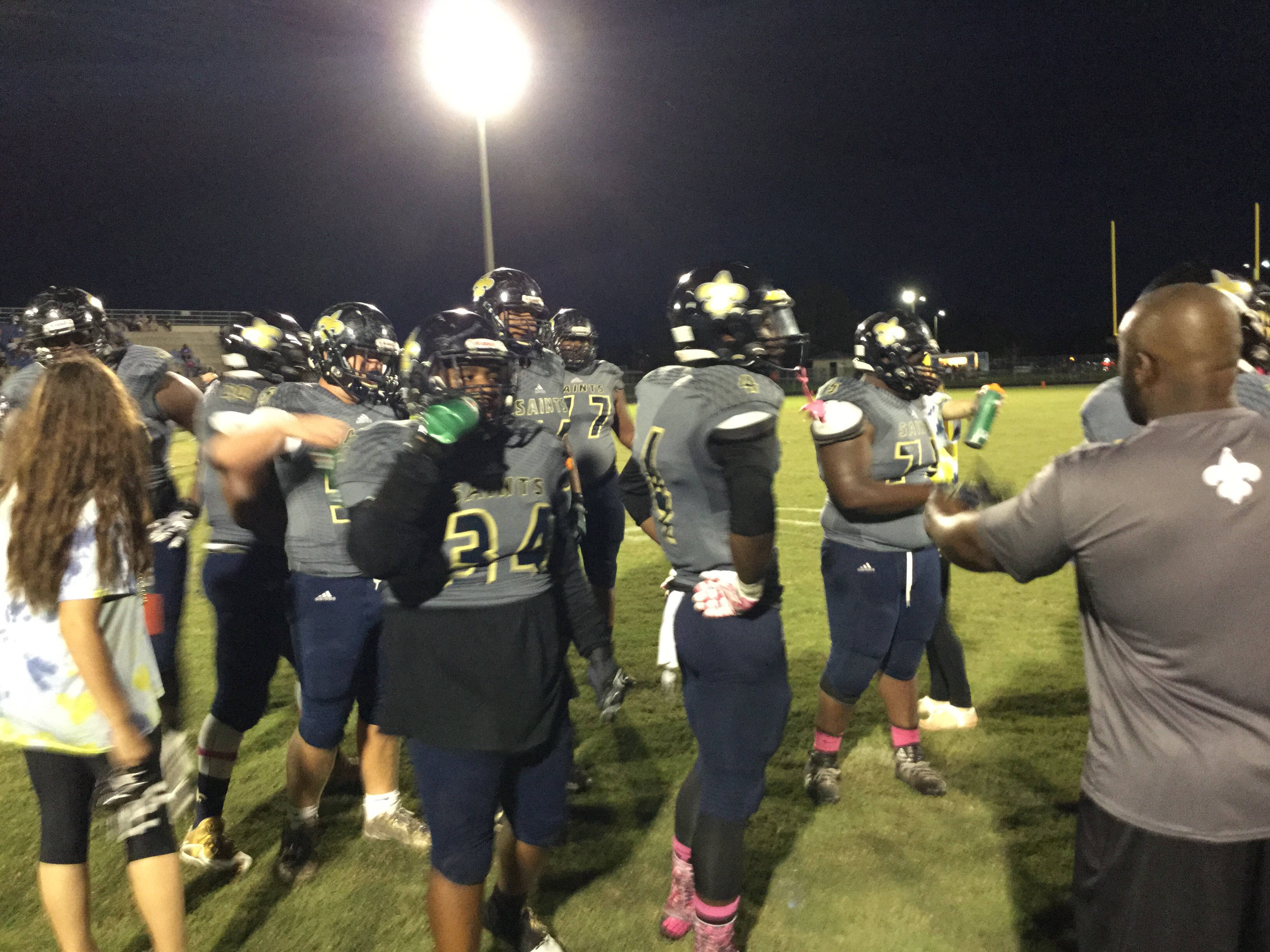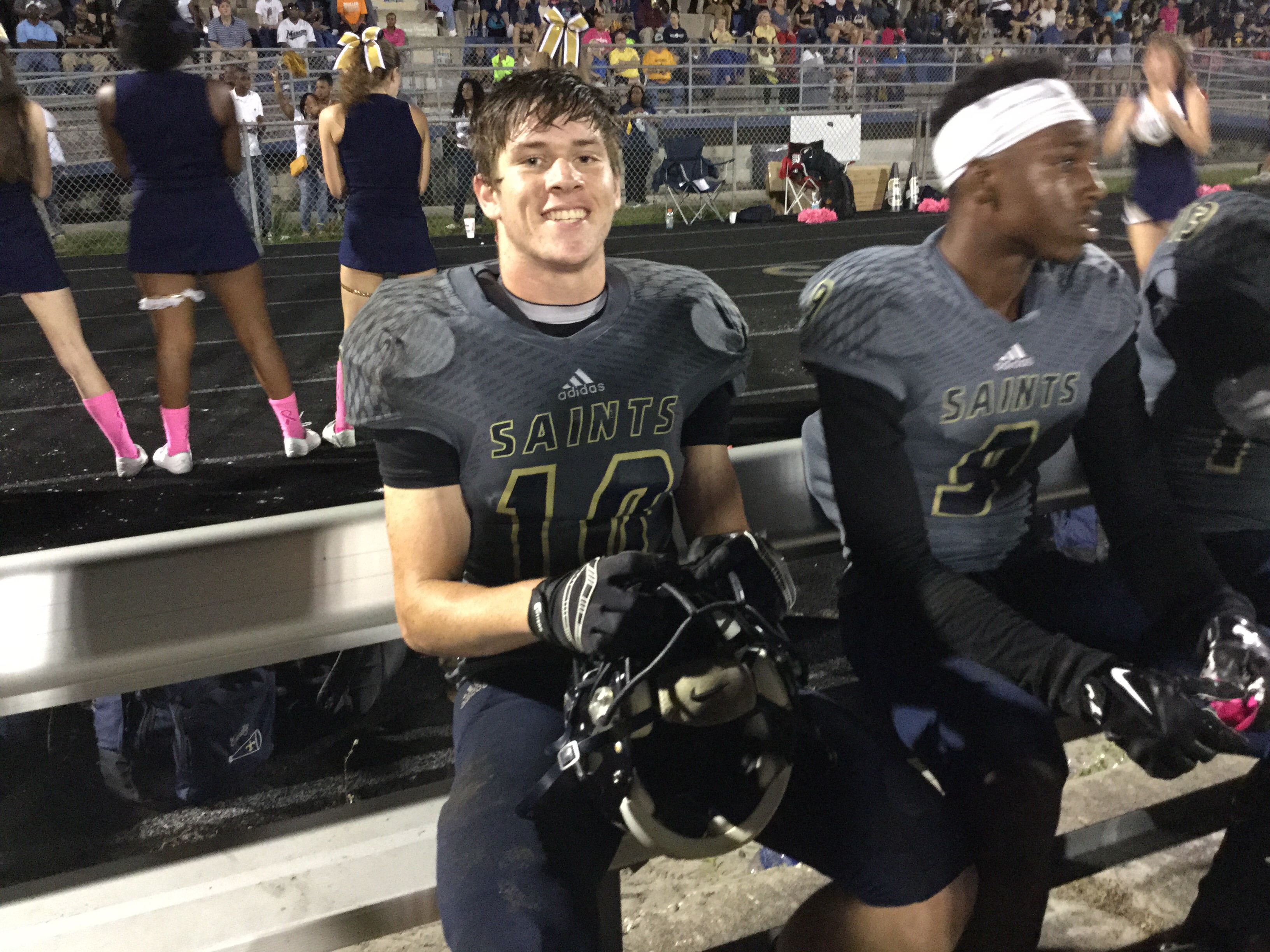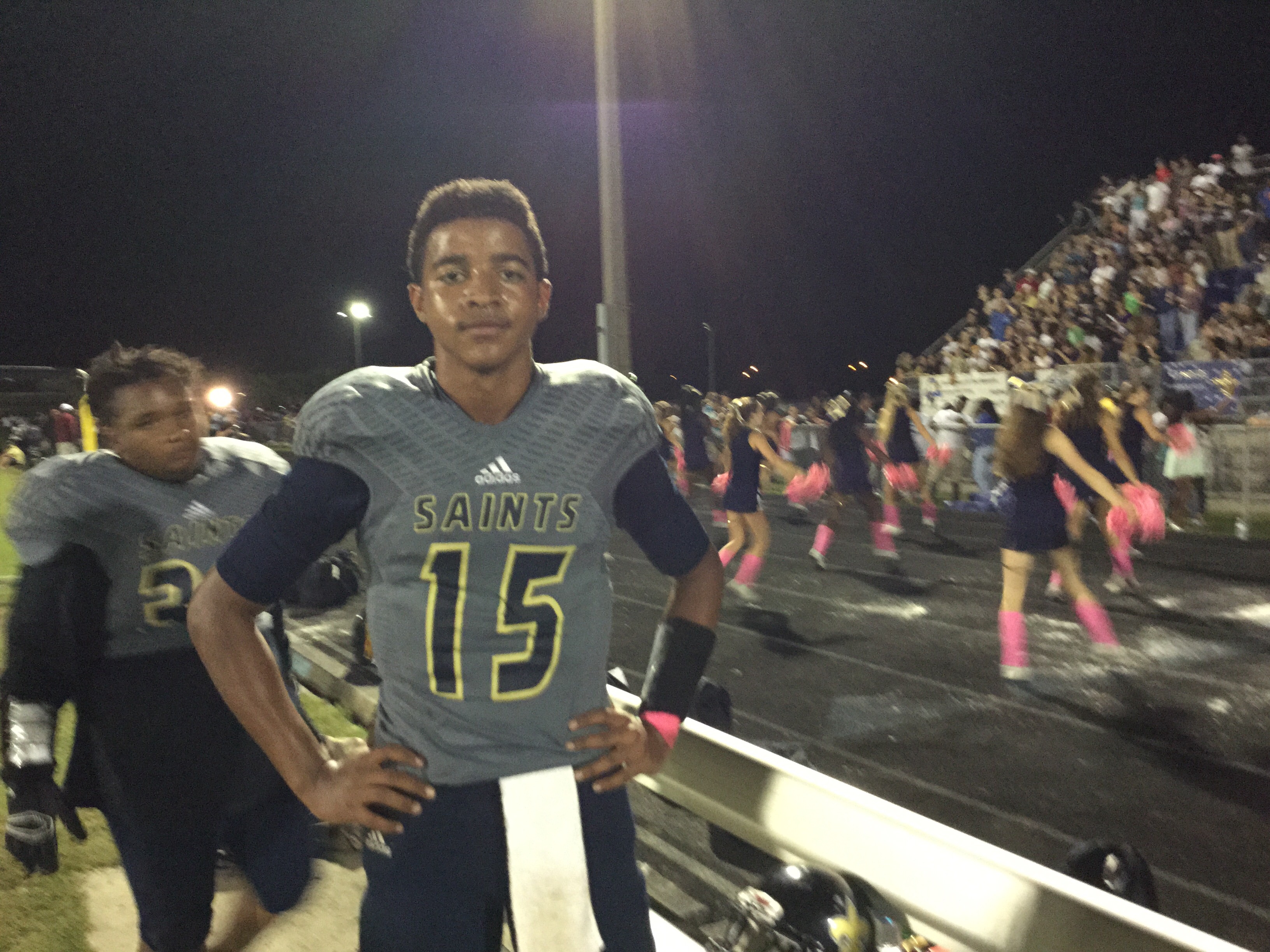 Sandalwood was without starting Quarterback Eli Peters who suffered an ankle injury last week. He did not dress for this game. That meant Sophmore Quarterback Kyle Smith got the nod for the Saints. It took Smith some time to get acclimated to the speed of the game but he would settle down and strike first for the Saints. Smith hooked up with WR RZ McCorker on a 45 yard pass to put the Saints up 7-0.