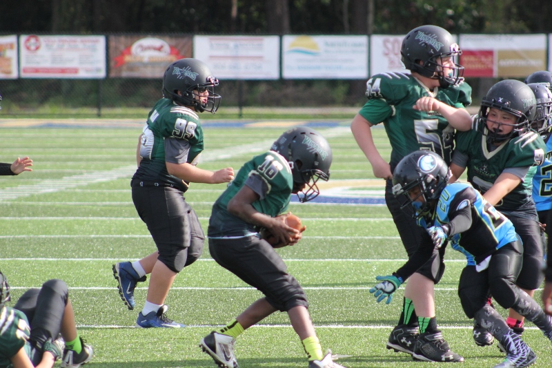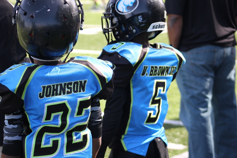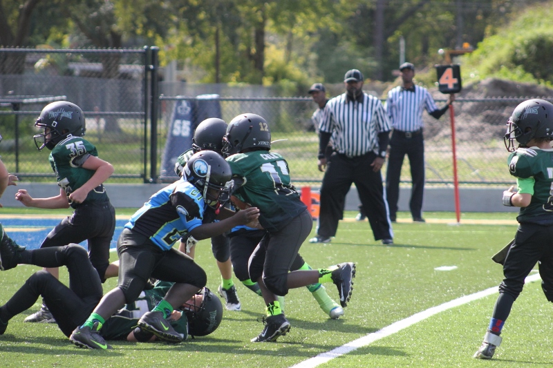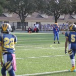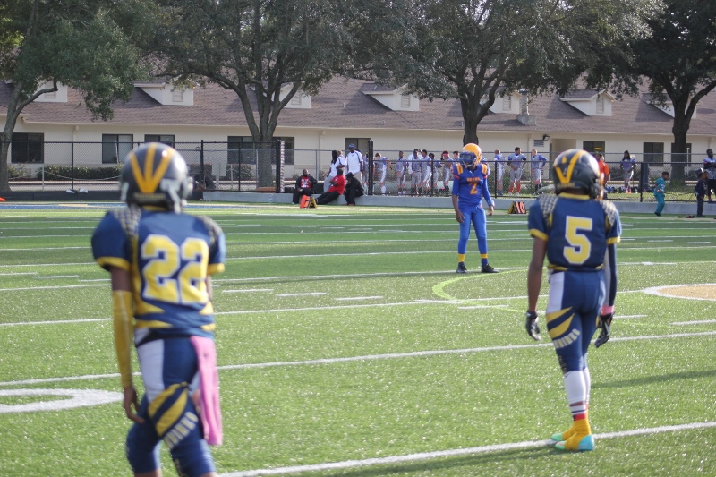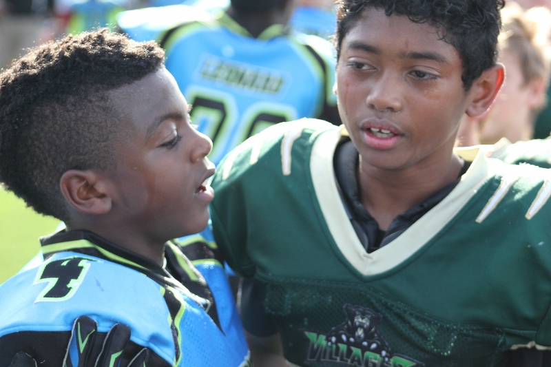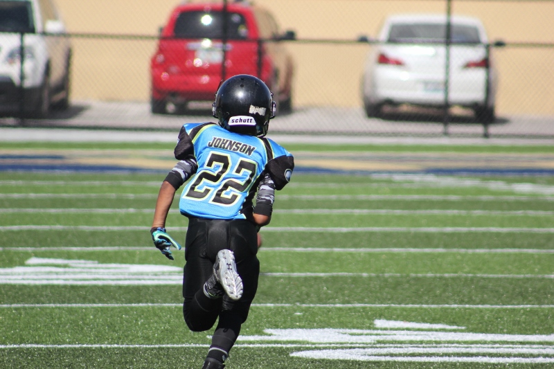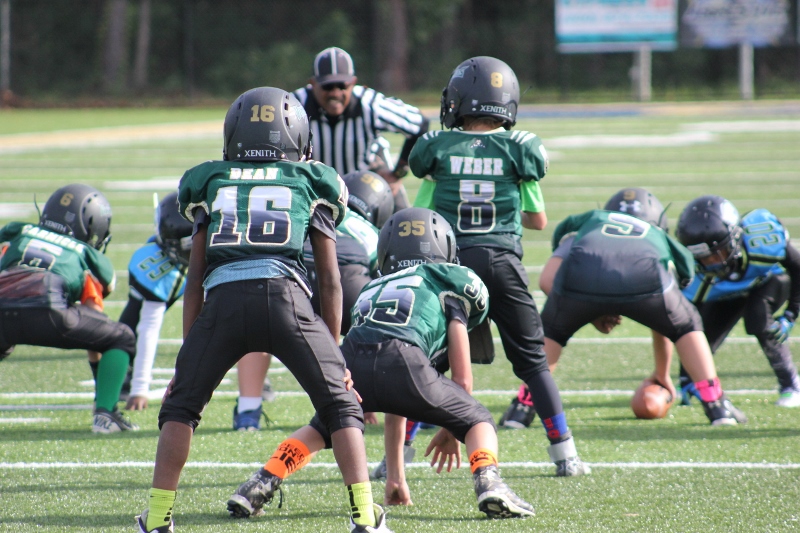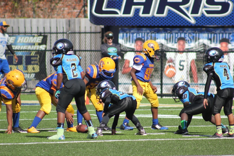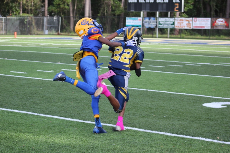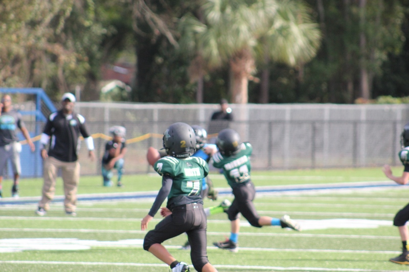 The 10U Panthers rolled out their baby blue Mustang GT with a V8 under the hood. But Villages sported a shiny green Camaro Z28 equipped with a V8 themselves and both were ready to roll! The Blue Mustang was in the form of Gainesville’s starting tailback #4 Isaiah Donaldson. He came out of the starting line smoking giving his Panthers an early lead. Gainesville pounded the ball off tackle and hit the edge several times behind their massive offensive line. It worked to perfection as they built a halftime lead.