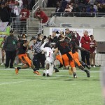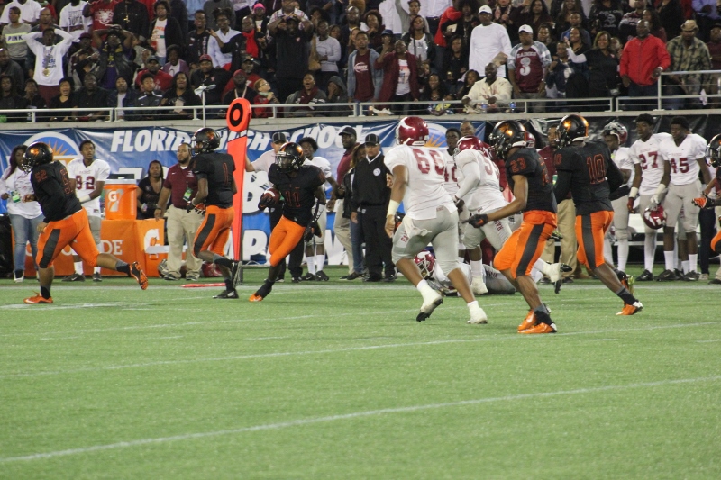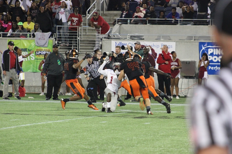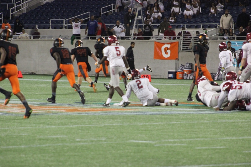 was like groundhog day in the 90’s classic film with Bill Murray, and judgment day in the terminator movies . It seemed like it would never end, and after it happened you wished it had never come. In the fourth, the Tornado’s Darrius Scott caught a touchdown pass from Richardson to make it 22-16 after #2 Raymon Flander’s 2 point conversion. But Dalvin Storey would make an incredible catch, thrown by Debiase for the Raines TD, putting them back up 23-22. Some experts during the game questioned why the Vikings did not utilize Storey and the other tall wide receivers of the Vikings. That thought was echoed by a fan in casual conversation as I pumped gas outside the Citrus bowl.Instead of Raines playing pitch and catch Booker T did.