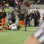 The fourth quarter nightmare was not over. On Raine’s next possession, QB Augie Debiase dropped back and his pass was deflected as it released his hands. The ball bounce behind the line of scrimmage and was scooped up by #44 Brandon Tobar. Tobar raced down the left sideline eluding the Raines would be tackler to leap into the endzone as the Miami crowd yelled “wooooha”.