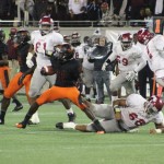 Alex Rutledge of Raines shredded the Tornadoes defense all night. They couldn’t stop him in the game. He hit them with speed, power, agility, and heart. In fact the entire Raines rushing attack could not be stopped. But one play in the fourth quarter would sum up the entire game for the Vikings. #1 Bishop Bonnet received the hand off deep in his own territory and hit the corner around the left side. He would cut back and break several tackles as he crossed midfield carrying tacklers. But then disaster struck as Booker T’s Marquis Decius stripped the ball from Bonnet’s tight grasp and the ball bounced into the hands of #11 Myron Morris. Morris would return the fumble 75 yards for the score leaping into the end zone to the Miami crowd’s yelled of “Wooooha!” Booker T led 36-23.