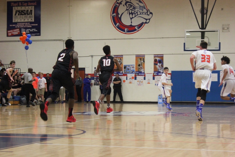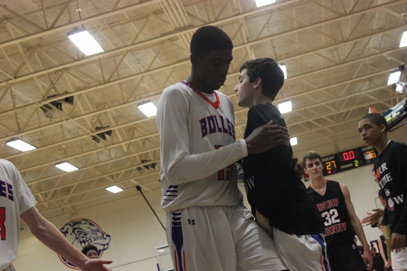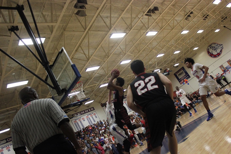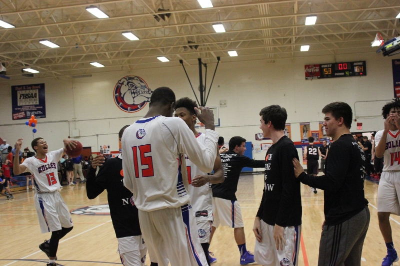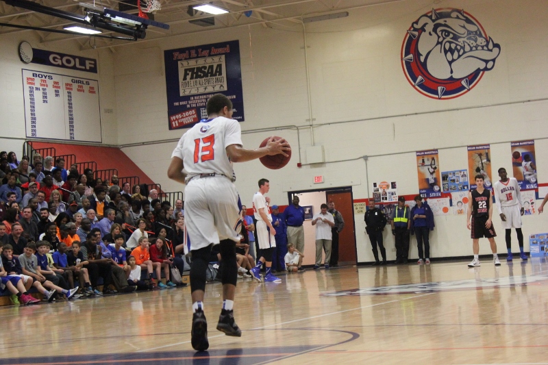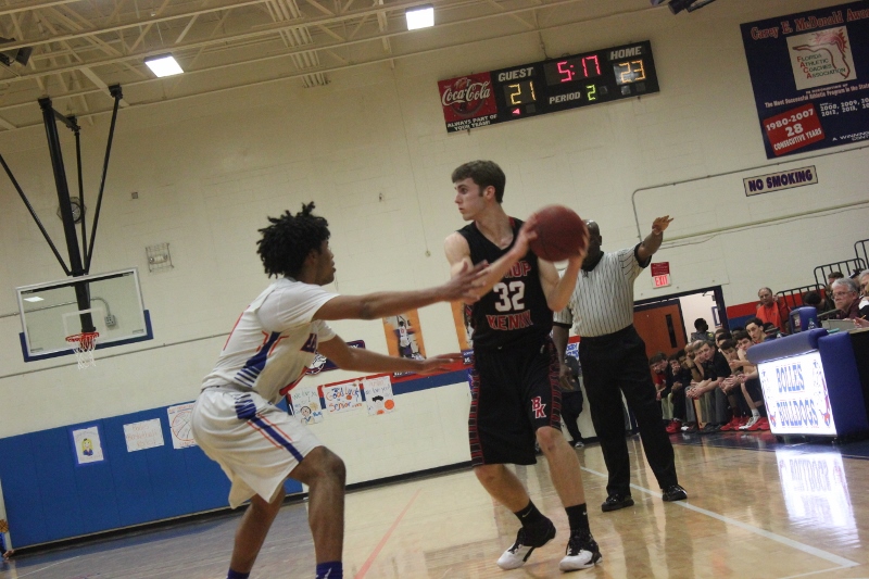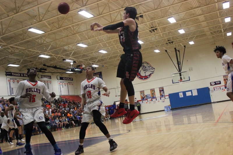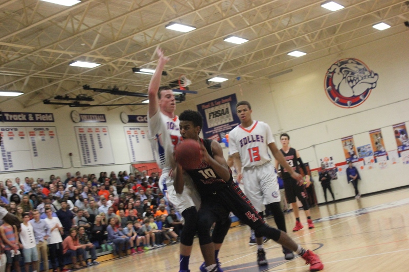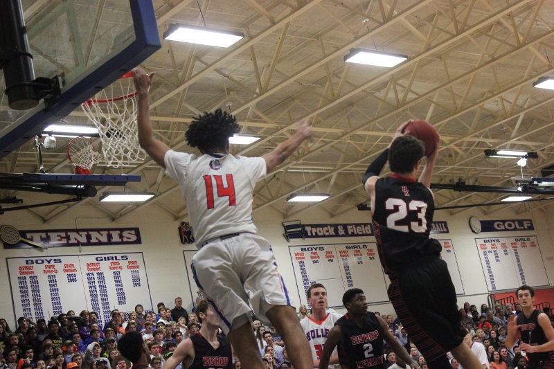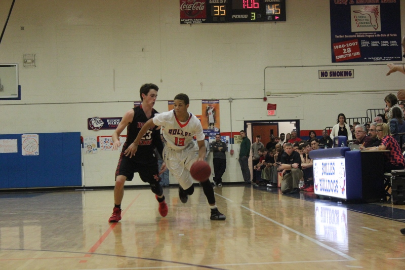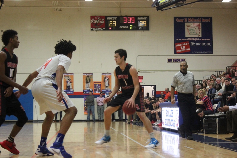 Bolles High School- Jonathan Dewane scored 19 points, and Collin Smith added 17 points as the Bolles Bulldogs defeated the Bishop Kenny 64-53 in front of an enthusiastic crowd mixed with Crusaders and Bulldogs. Bolles and Kenny went back and forth trading baskets in the beginning of the game. Bolles would lean on Dewane who led them at halftime with 13 points. Bishop Kenny was led by #1 Christian Carlyle who had 10 points at the half. He would finish with 19 points as well. Carlyle slashed to the basket hard but finished shots with soft floaters. Dewane would convert offensive rebound layups, and hit shots from mid range. These two performances would have both teams playing at high levels, but Bolles would lead 36-27.