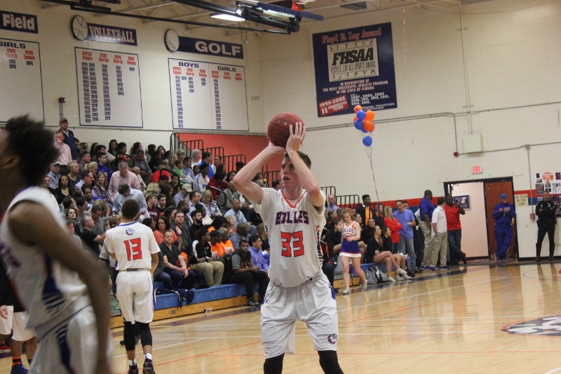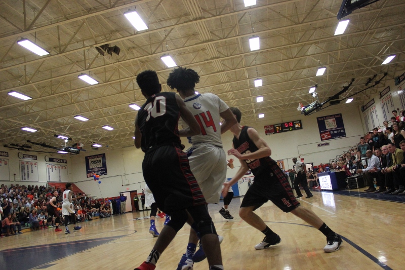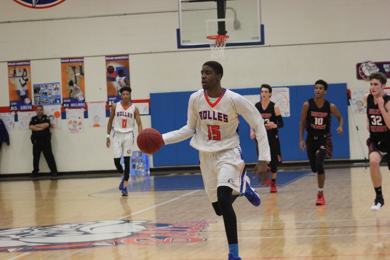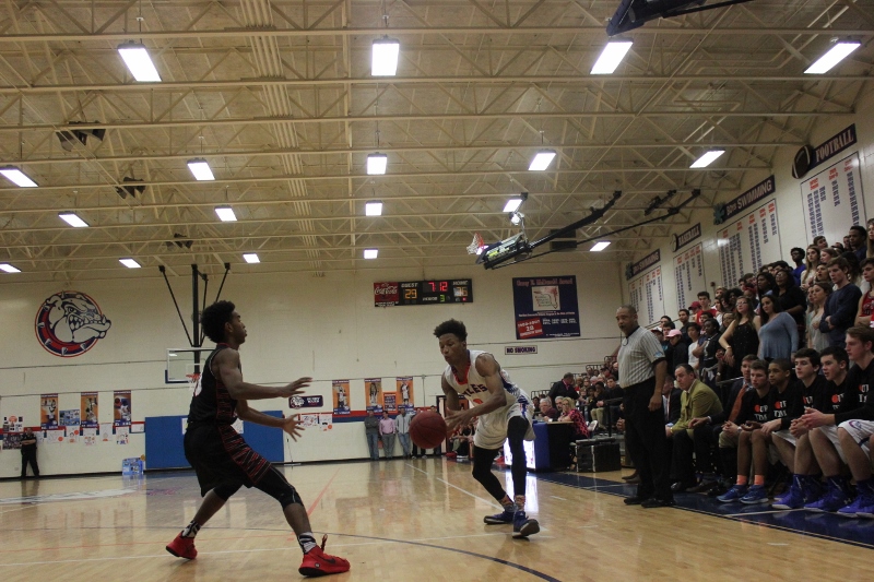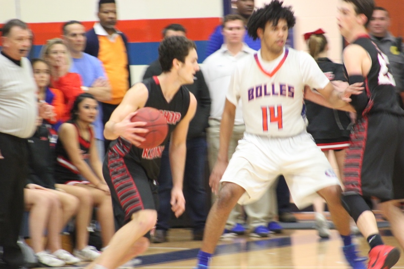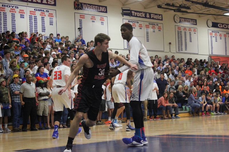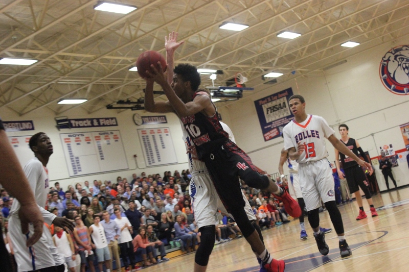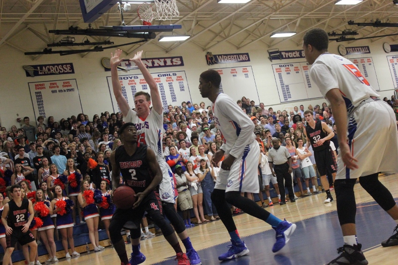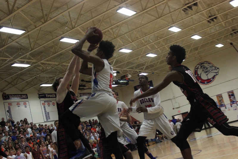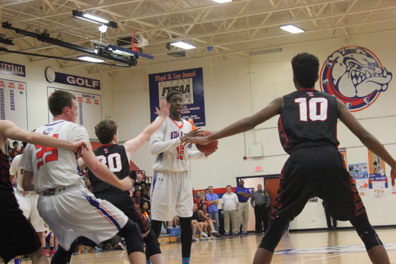 Bolles High School- Jonathan Dewane scored 19 points, and Collin Smith added 17 points as the Bolles Bulldogs defeated the Bishop Kenny 64-53 in front of an enthusiastic crowd mixed with Crusaders and Bulldogs. Bolles and Kenny went back and forth trading baskets in the beginning of the game. Bolles would lean on Dewane who led them at halftime with 13 points. Bishop Kenny was led by #1 Christian Carlyle who had 10 points at the half. He would finish with 19 points as well. Carlyle slashed to the basket hard but finished shots with soft floaters. Dewane would convert offensive rebound layups, and hit shots from mid range. These two performances would have both teams playing at high levels, but Bolles would lead 36-27.