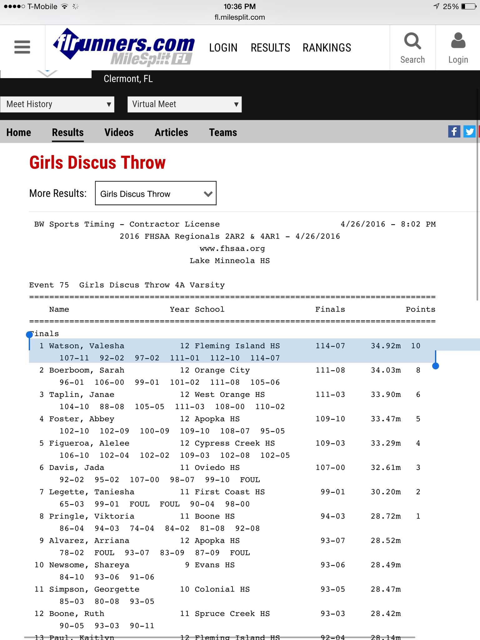 Fleming Island’s Valesha Watson did something quite remarkable today. A feat not many if not anyone has accomplished before. Valesha is a member of the Fleming Island track & field team. The team competed at Lake Minneola High School in Clermont Florida ( near Orlando) today , where Watson participated in the District 4A Girl’s discus throw competion. After six attempts, Watson tossed an impressive 114-07 in the finals besting the closest competitor who threw a 111-08. Watson’s throw was good enough to win the State Regional Finals, and advance her to the state finals.