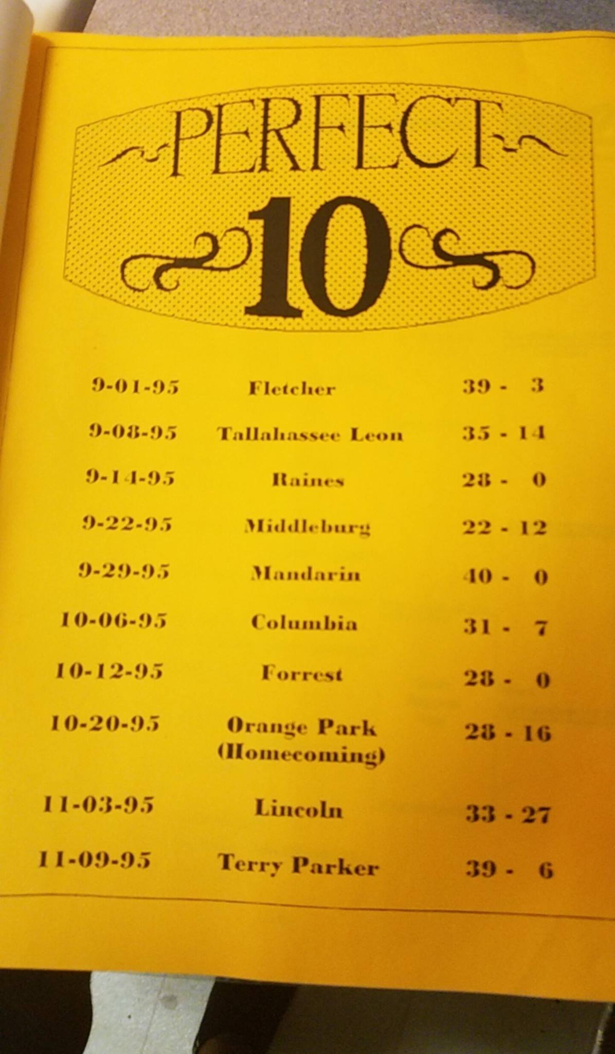 I must agree those are some compelling arguments Corey. But instead of mentioning Florida’s Mr Football Sandalwood’s Frankie Franklin again, I had to dig a little deeper than records and players who went to college. Lets look at match ups and districts. Sandalwood in 1995 played in the 6A classification which is equivalent to 8A today, the largest classification. But unlike today or even 2005, in the 90’s your biggest athletes and toughest schools were mostly in 6A. The districts were a murders row of competition. Lake City Columbia, Tallahassee Lincoln, Middleburg, Mandarin, Orange Park, Tallahassee Leon, every week it was a playoff game. In fact St. Augustine was a brief member of the 6A classification in the 90’s replacing Middleburg from 1997 to 1998. How did they fare you ask??? Well they finished in the bottom half of their district with two losses to… yup.. you guessed it, Sandalwood. So my question is… how can they beat one of the best team’s in our area’s history in this bracket, when they couldn’t even beat them when they were in the same district?