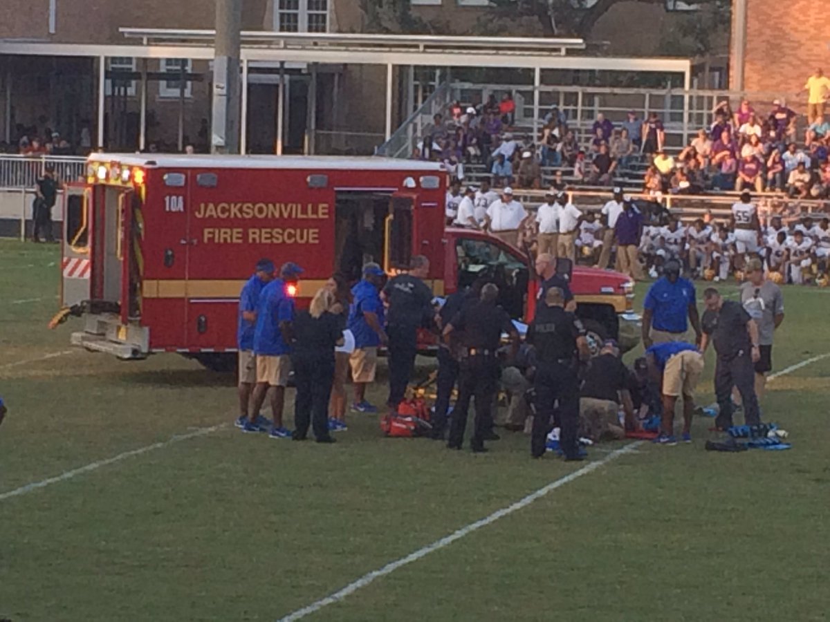 The quiet and stunned crowd watched as the trainers and paramedics on the side of the field raced to Phan to access the situation. Coaches called 911 and within minutes a rescue unit from nearby McDuff station was in the stadium and was caring to Phan’s needs. After a lengthy delay, Phan’s leg was put in a air cast and transported to nearby St. Vincent Hospital.