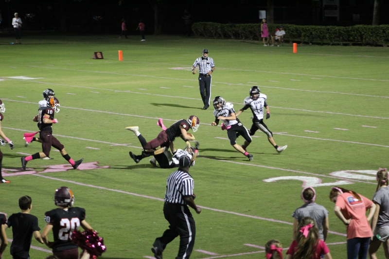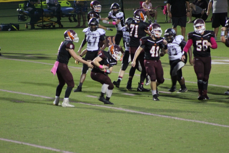 The players seemed to know this as they played with poise and concentration completing difficult plays with ease. Quarterback DJ Lampp connected with several receivers including Brett Fowler on a 53 yard catch and run for an early touchdown. Lampp closed out the first quarter with a 30 yard touchdown pass to Ethan Powell proving that the big play was in play against Duval Charter.