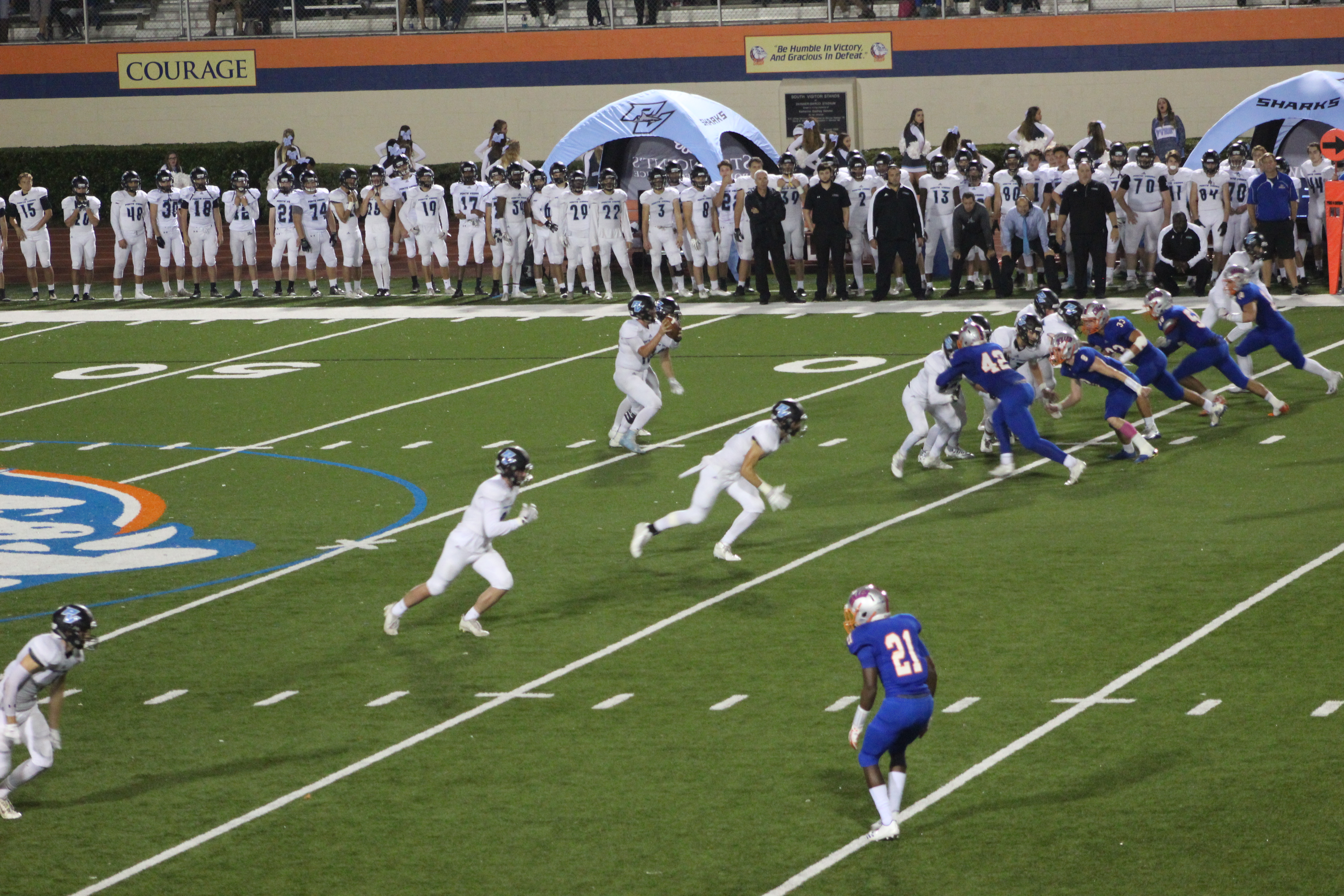 Ponte Vedra raced down the field and recovered the ball at the Bulldogs 20 yard line. Bolles would hold Ponte Vedra to a field goal, but Ponte Vedra had built a 9-0 lead early. On the next drive, Bolles would make some plays in the passing game to get them into Sharks territory, however Stepp who also plays defensive back for Ponte Vedra would intercept the Josiah Johnson pass ending a promising drive for the Bulldogs. It was a disastrous first quarter for Bolles, and the second quarter started the same when Ponte Vedra scored on its very first play. Murrah tossed his second touchdown of the game, this time to Kit Connelly and just like that Ponte Vedra led Bolles 16-0 after two quarters. The suffrage on offense didn’t end there for Bolles as on their next offensive drive they would fumble on the Sharks 29 yard line. Ponte Vedra wouldn’t turn that turnover into points, but after forcing a Bolles punt on the next drive they would capitalize. Murrah hit Stepp on a deep 40 yard pass with only 20 seconds to play in the half. A few plays later with just seconds in the half Jack Murrah would make the signature play of the game. The Quarterback dropped back and eluded one rusher, stepped up int o the pocket and eluded another rusher, rolled to his left keeping his eyes down field and hit Kyle Barker on a 10 yard touchdown pass. The play showed everything Ponte Vedra exhibited in the first half, determination, focus, and toughness. It’s why they hald a 23-0 lead on the road at halftime.
