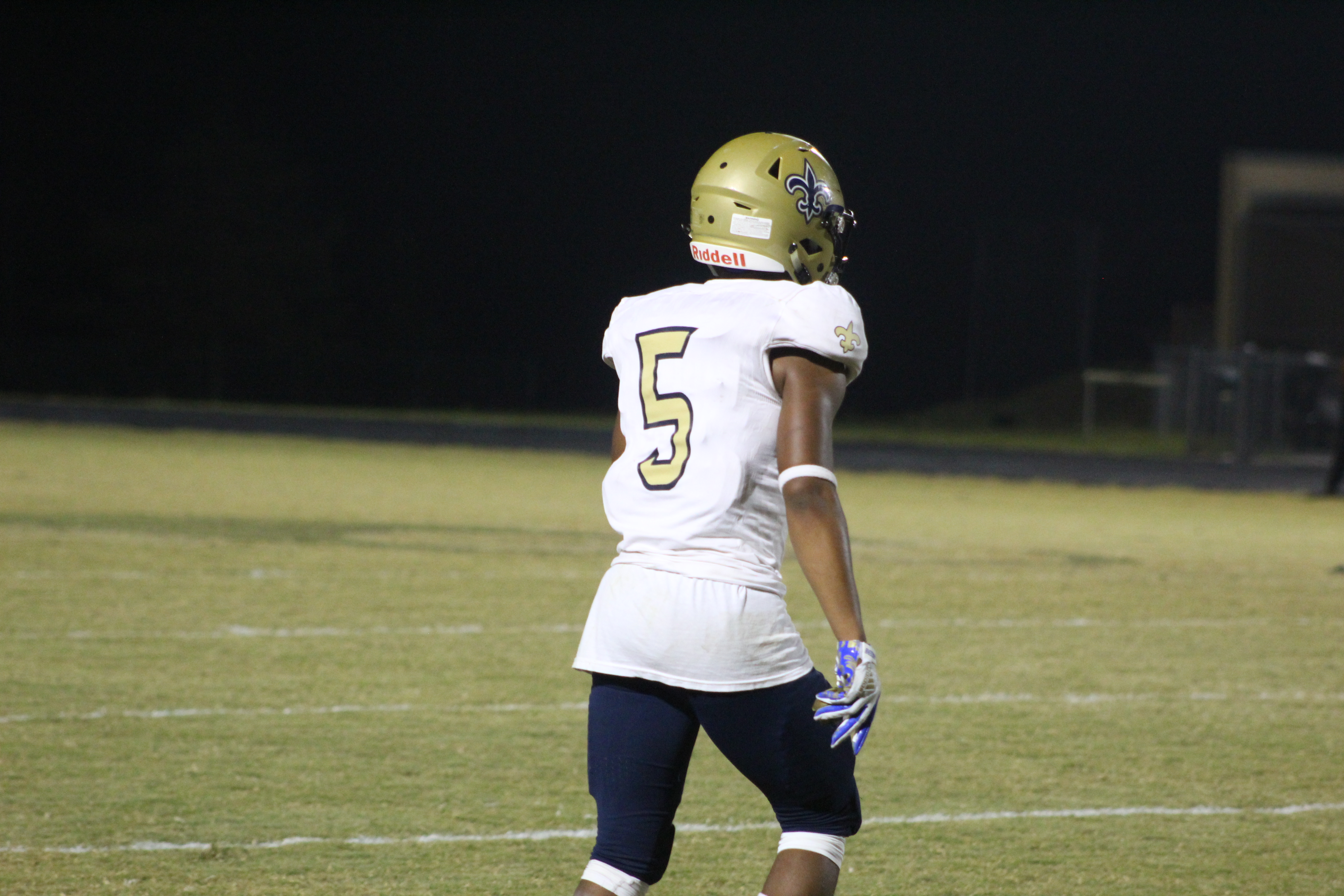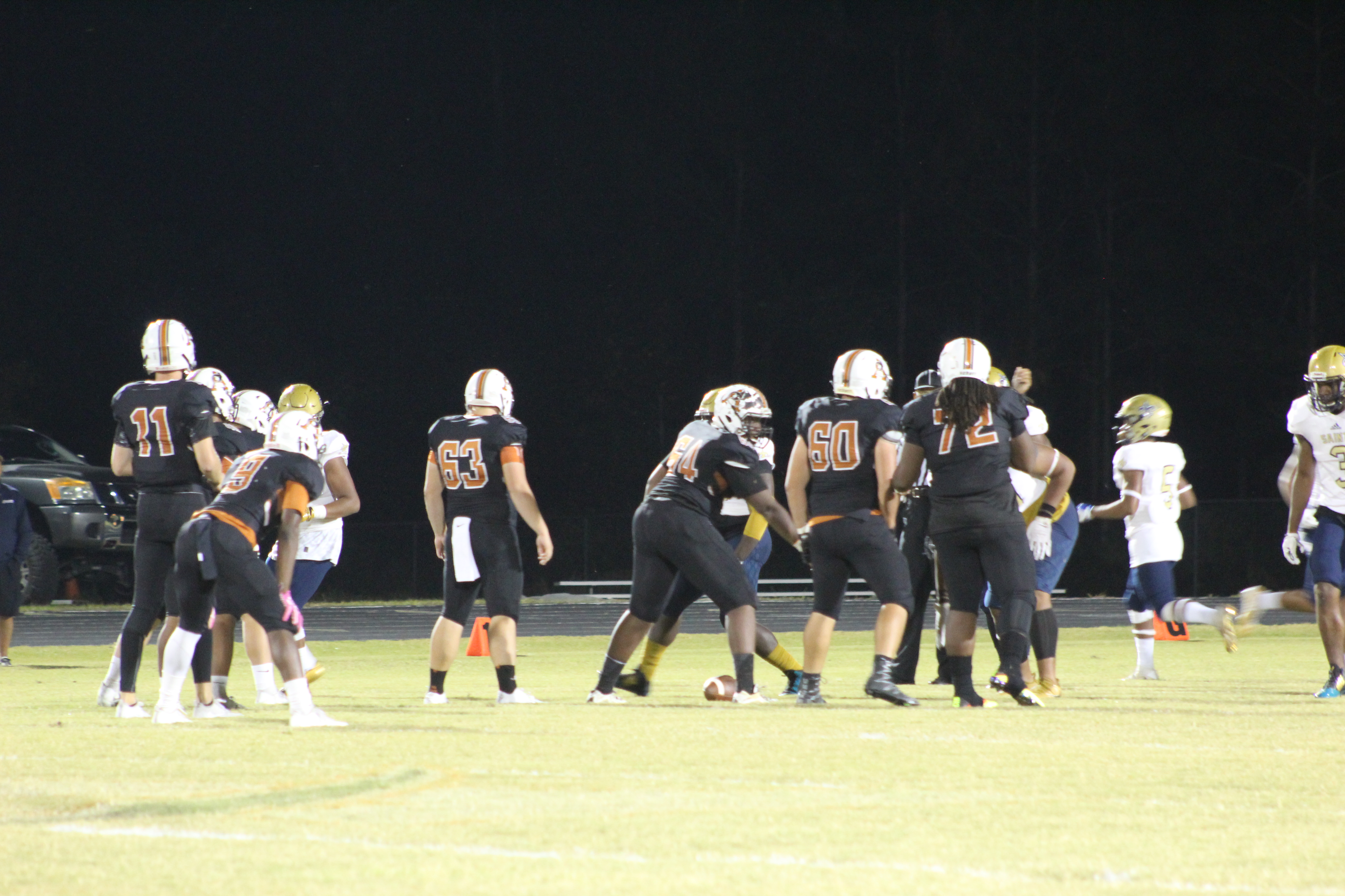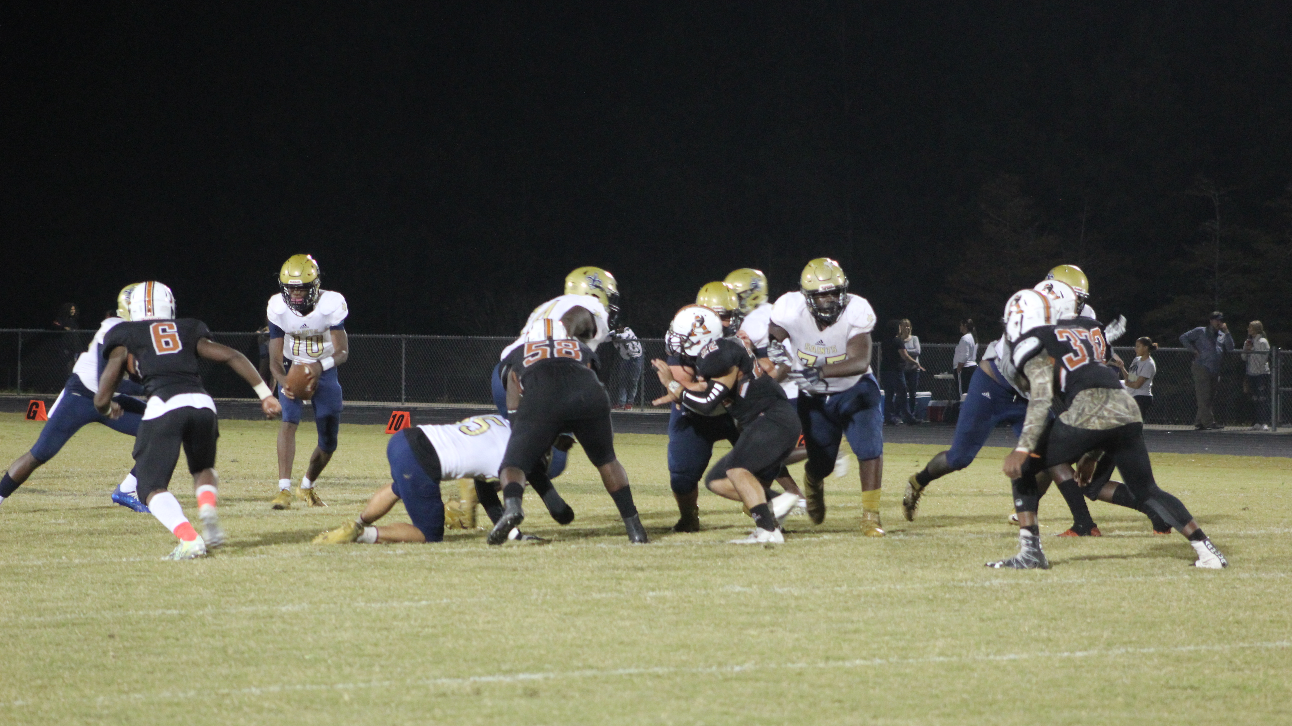 Sandalwood showed great improvement on the offensive side of the ball in their final regular season game. Saints sophomore quarterback Jeffery Sims found his big tall senior receiver Edwin Carter on several big plays down the field. Including a nice 42 yard pass which put Sandalwood deep in the Atlantic Coast red zone. Sims would cap the drive with a touchdown pass to wide receiver RZ McCorker in the corner of the left end zone, putting Sandalwood up 7-0 in the first quarter.