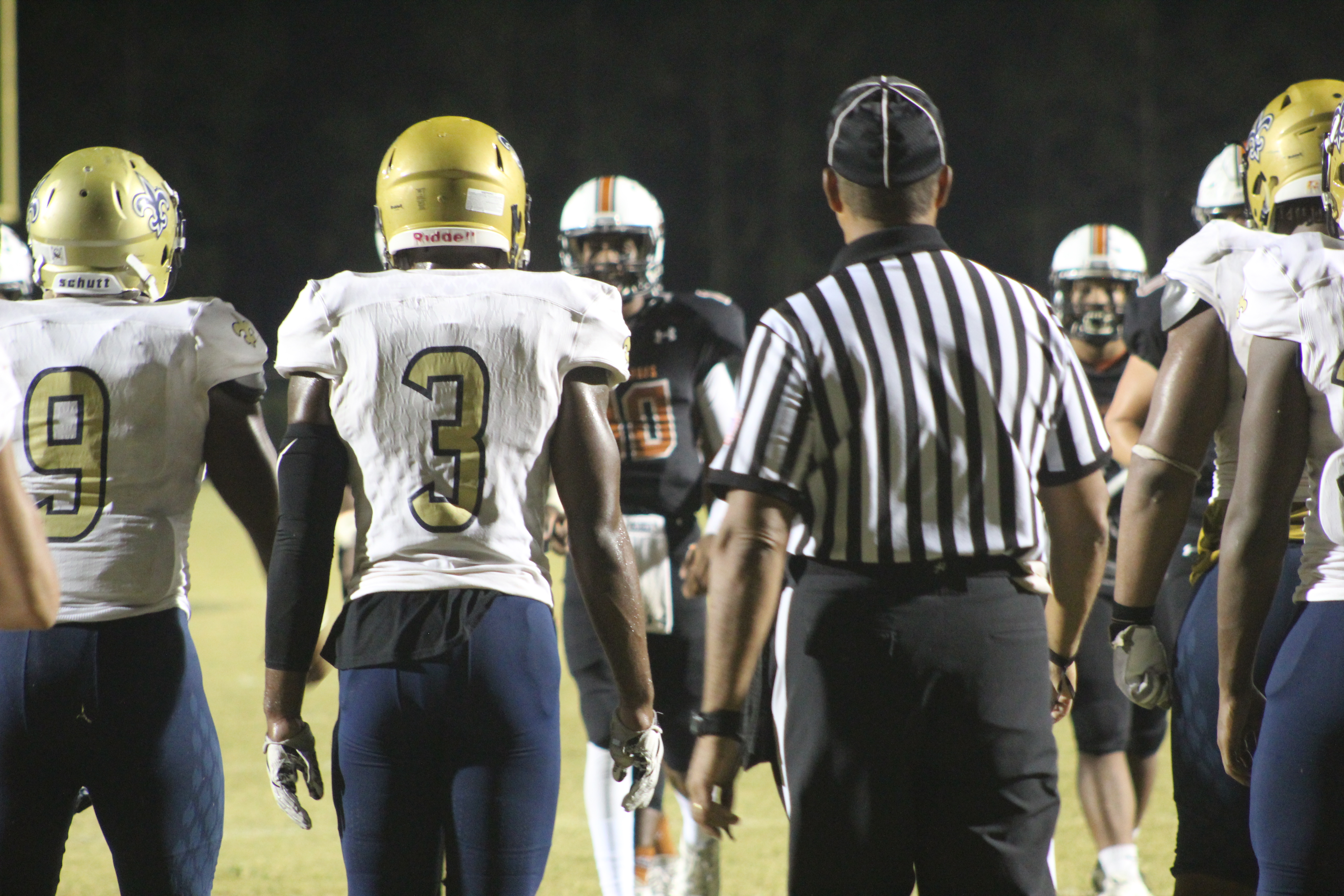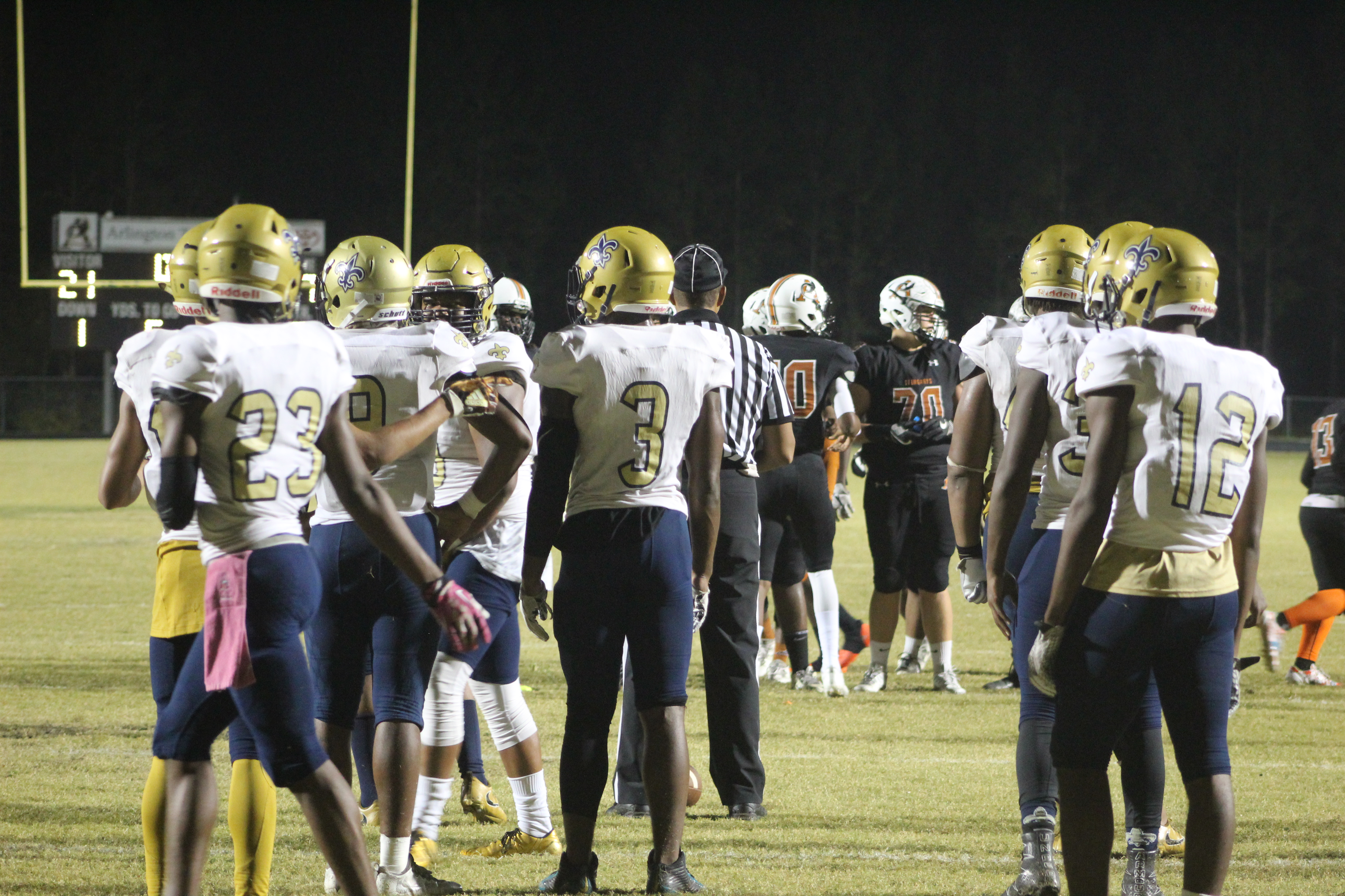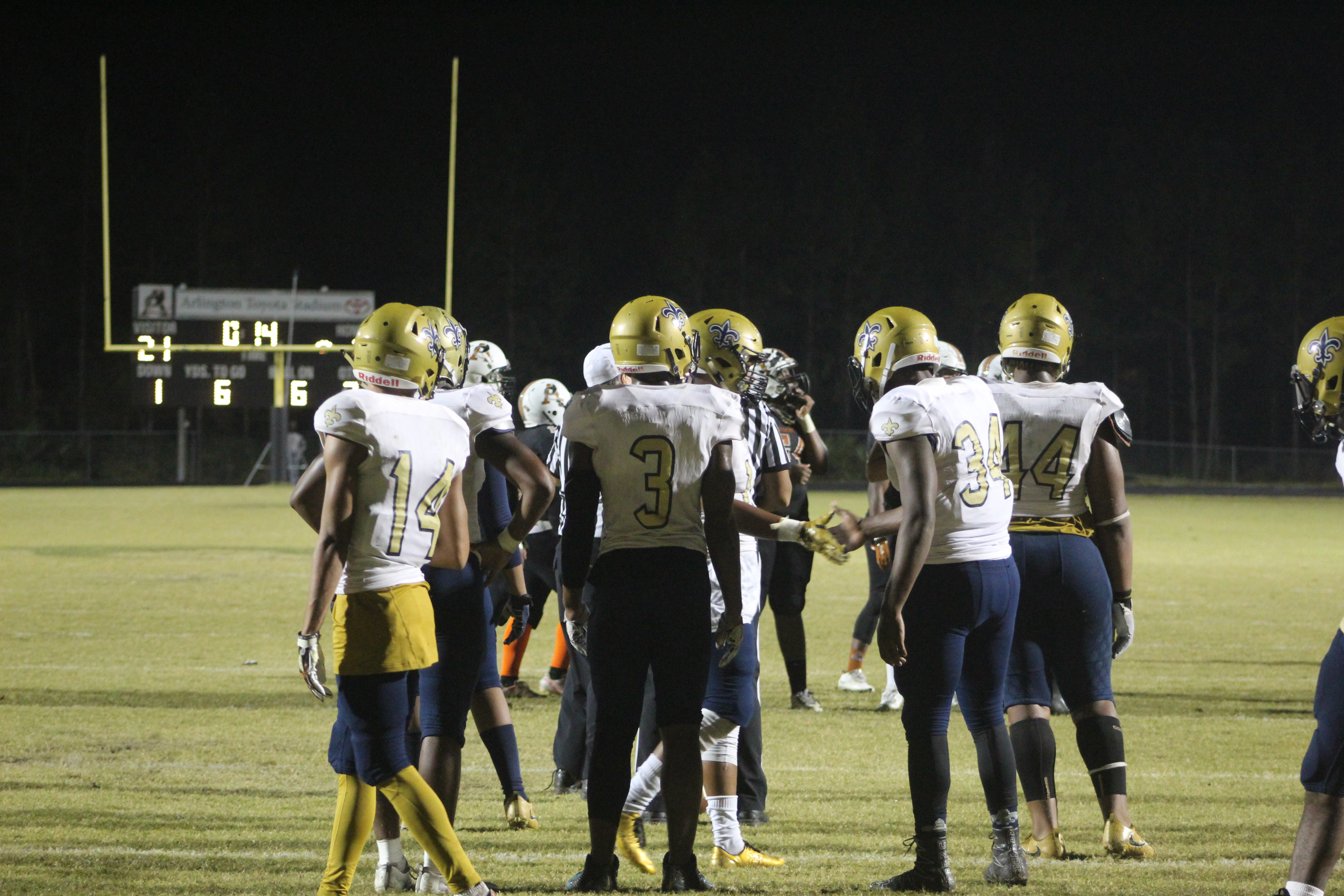 On the first play of the game, Sandalwood attempted an onsides kick. The kick bounced off the ground and as both teams scurried for the bouncing pig skin, Atlantic Coast Guard Joey Stuart remained on the ground writhing in pain. Suffering an apparent leg injury, Stuart had to be transported by ambulance to a medical center. Both teams kneeled in near silence for nearly fifteen minutes as trainers tended to the injured Stuart and EMT responders arrived. Sandalwood and Atlantic Coast would both show tremendous support for the injured senior, playing his last game on his home field.