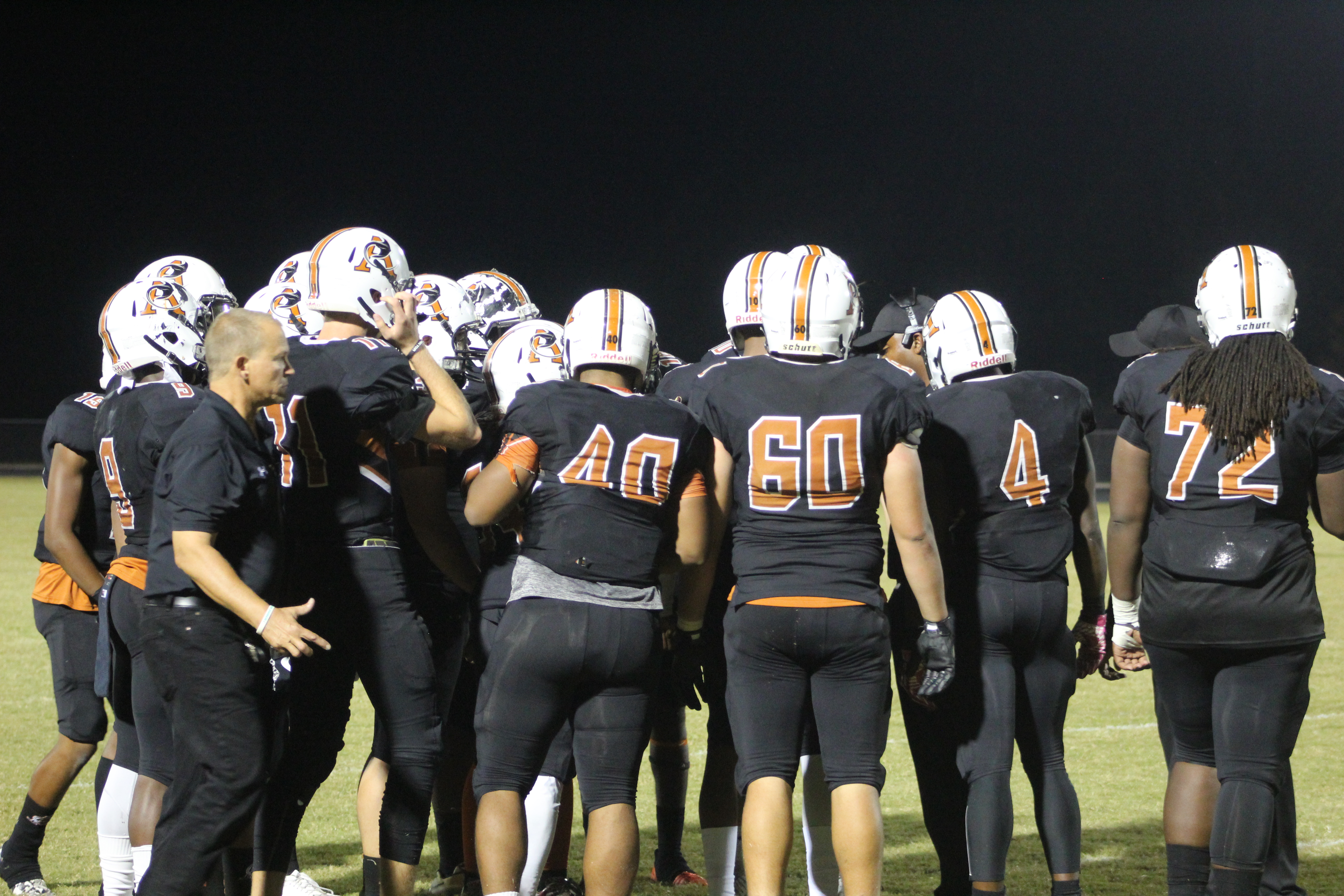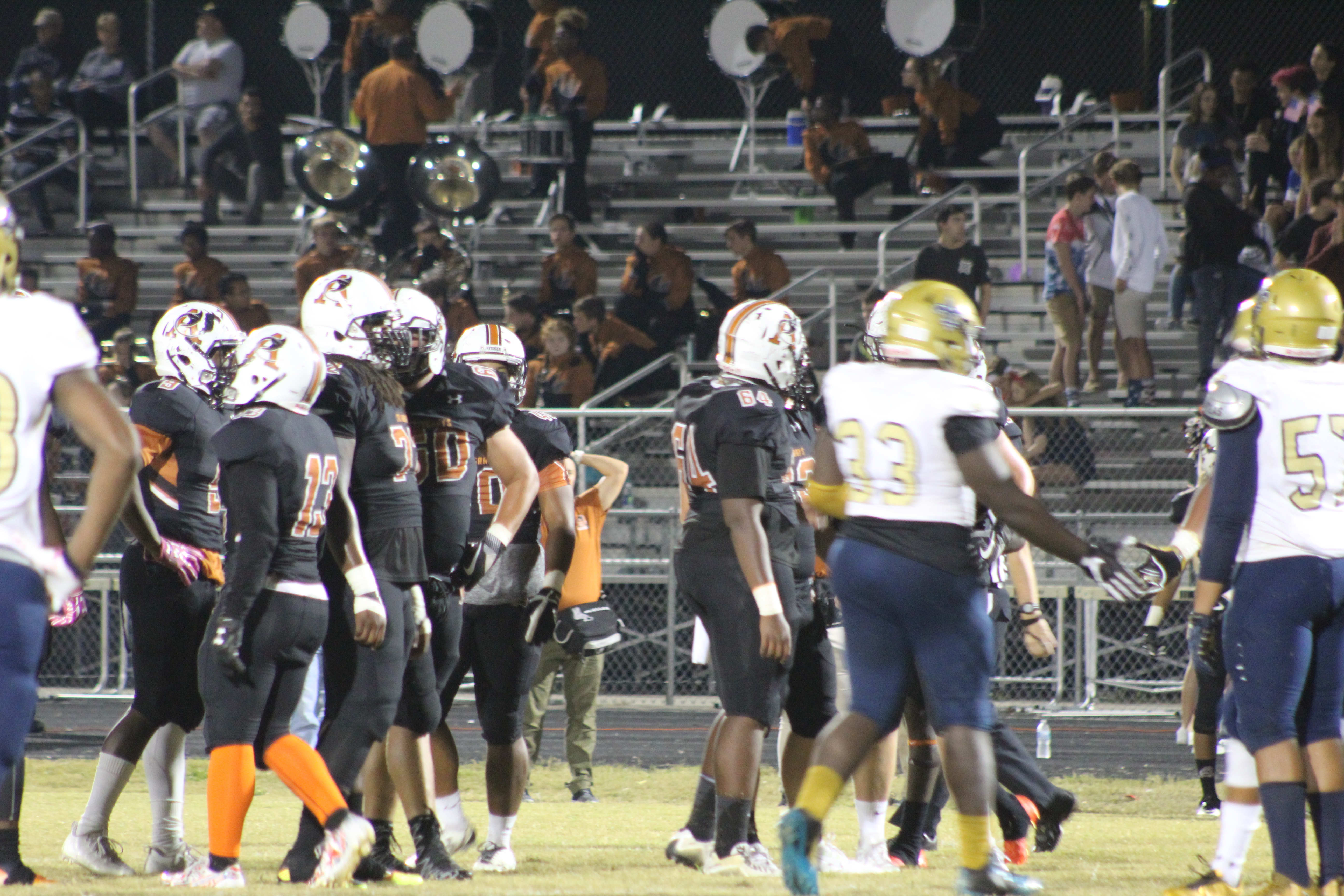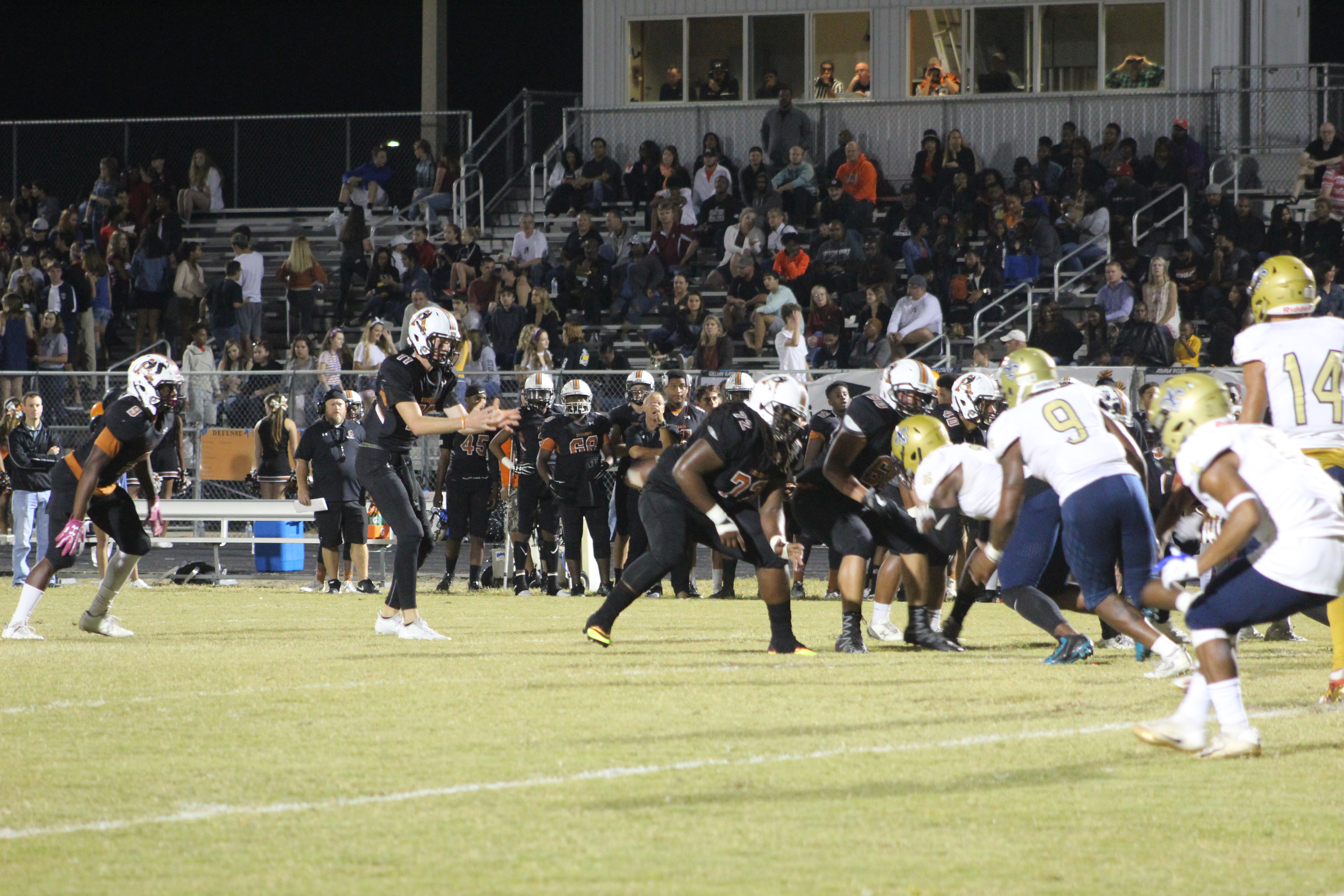 On the first play of the game, Sandalwood attempted an onsides kick. The kick bounced off the ground and as both teams scurried for the bouncing pig skin, Atlantic Coast Guard Joey Stuart remained on the ground writhing in pain. Suffering an apparent leg injury, Stuart had to be transported by ambulance to a medical center. Both teams kneeled in near silence for nearly fifteen minutes as trainers tended to the injured Stuart and EMT responders arrived. Sandalwood and Atlantic Coast would both show tremendous support for the injured senior, playing his last game on his home field.