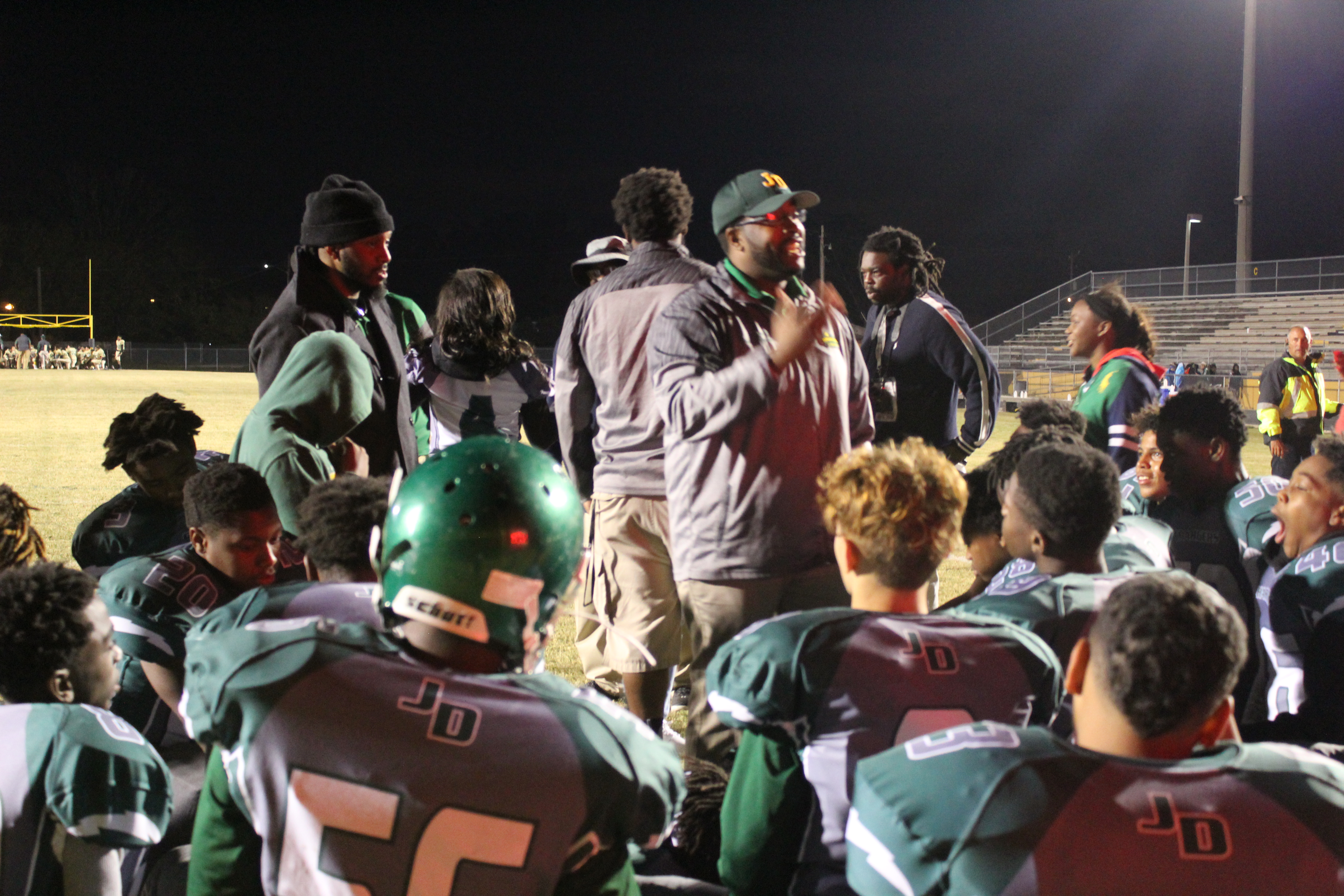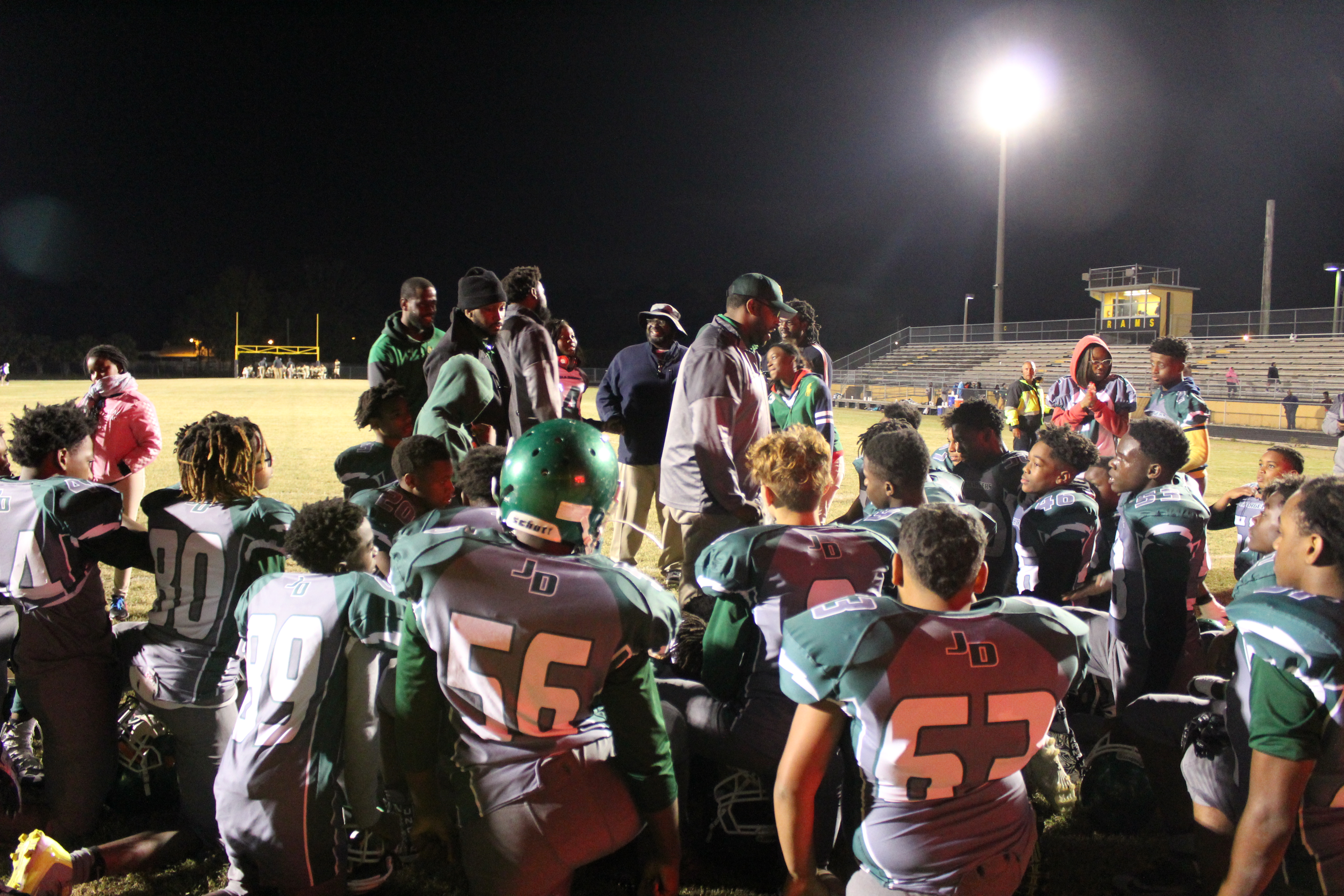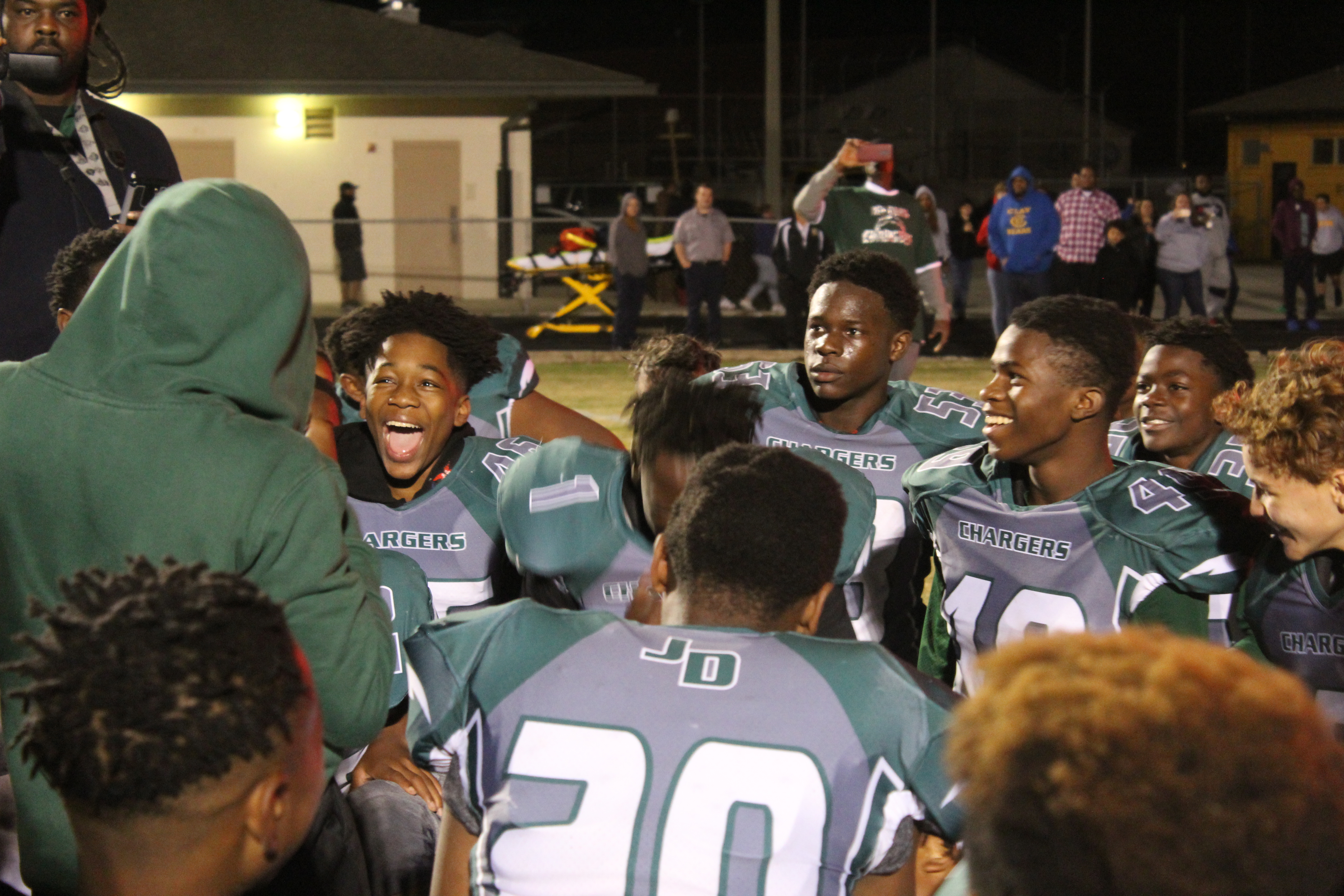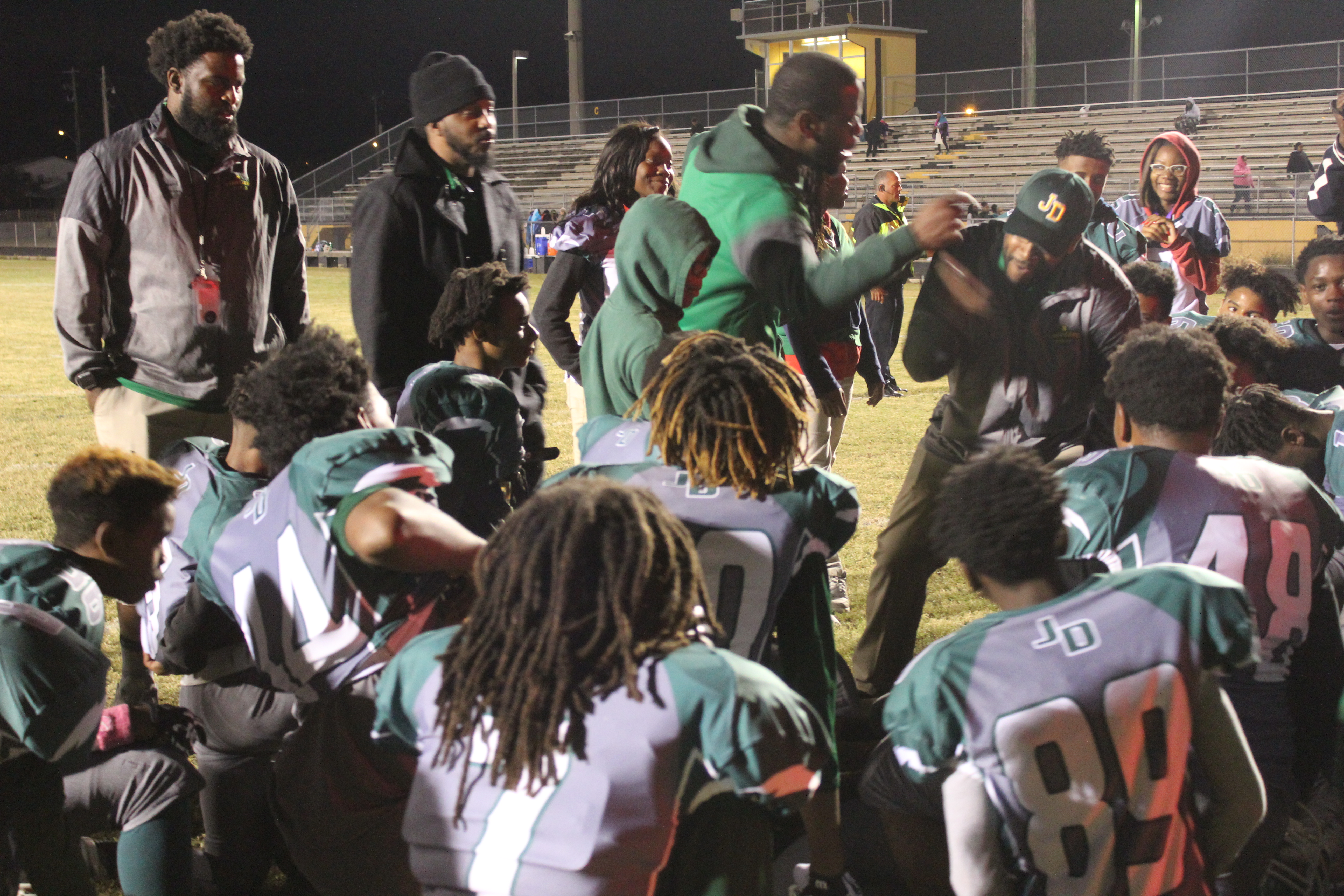 It was a bad dream for the Dragons that would quickly turn into a nightmare on their next possession. Dupont failed to get anything going on offense, and was forced to punt on fourth down. The Chargers executed a block punt and it was recovered by #1 Savion Wells who raced to the end zone to the disbelief of the crowd as Jeff Davis took a commanding 20-0 lead with four minutes left in the first quarter. A stunned Dupont sideline searched for answers, but there would be none on this night. Dupont, who had navigated an undefeated season, and possessed one of the more talented rosters in the city looked completely over matched, and they were. Even though Dupont possessed more size and length, Jeff Davis played faster, were more physical, and extremely confident, a true testament to Head Coach Reynolds and his coaching staff. Said Reynolds after the game. ” If you thought this game was physical you should see our practices. We get after it, so the players are eager to hit someone else”. This strategy seemed to work as Jeff Davis completely overwhelmed Dupont from the trenches to the secondary.