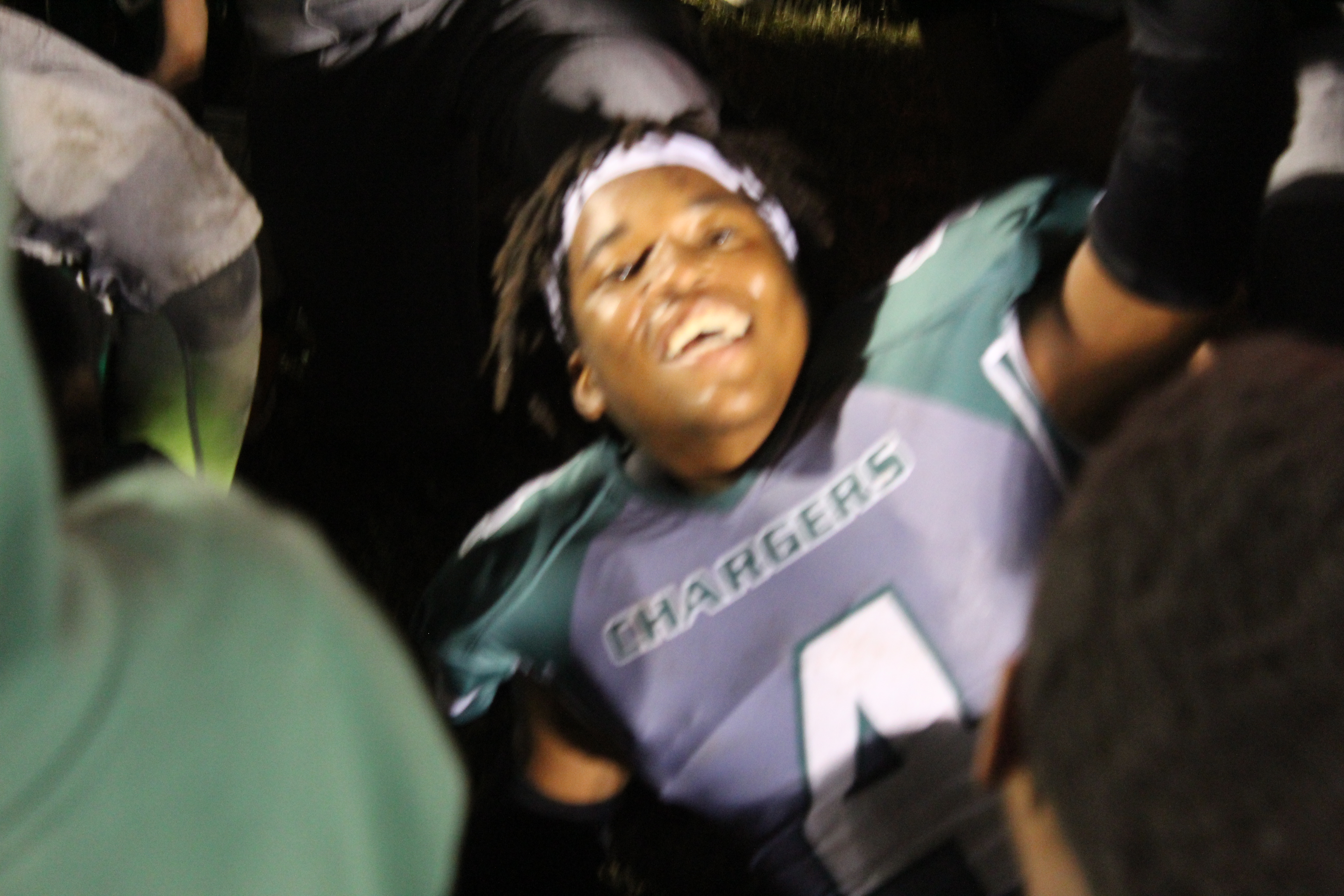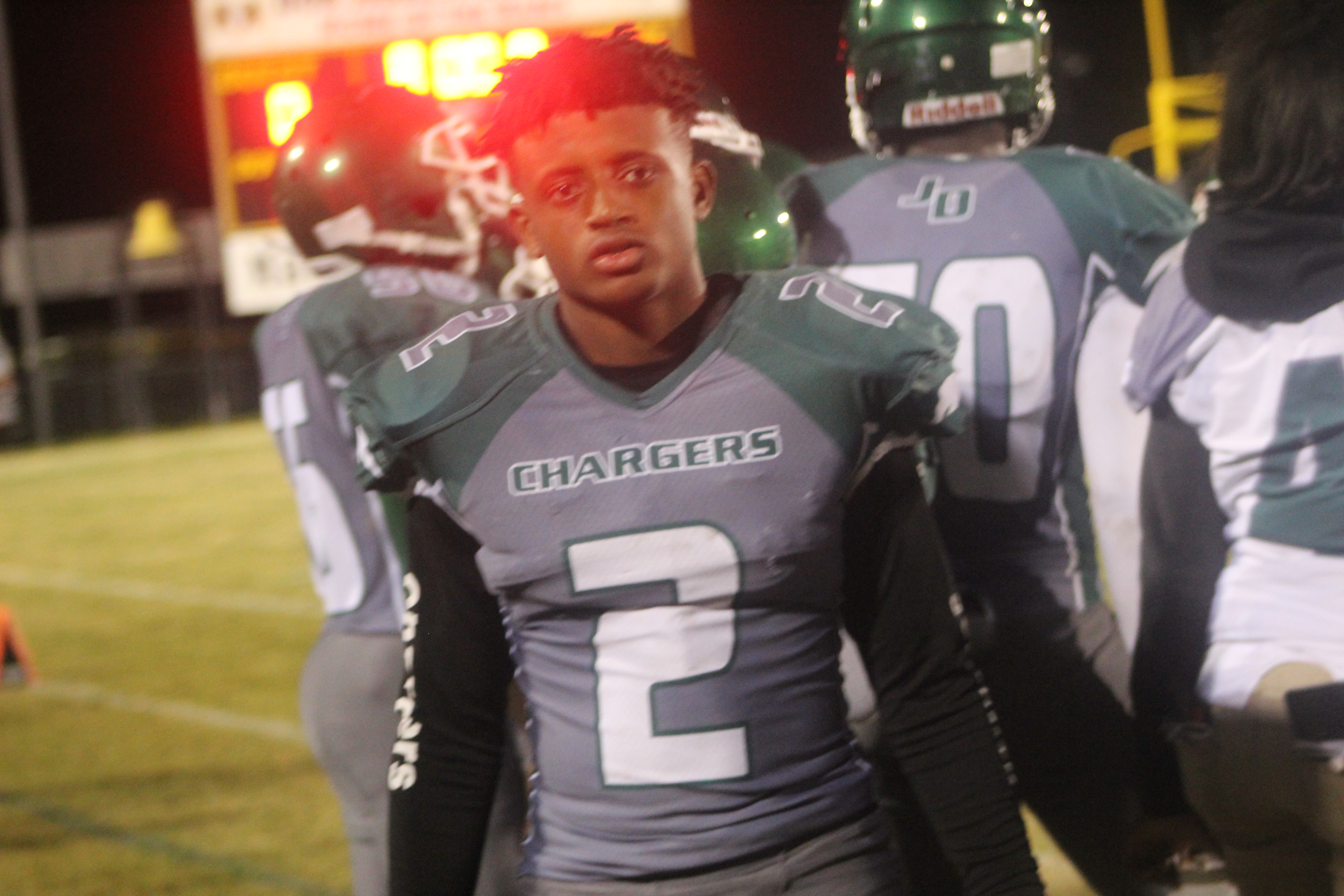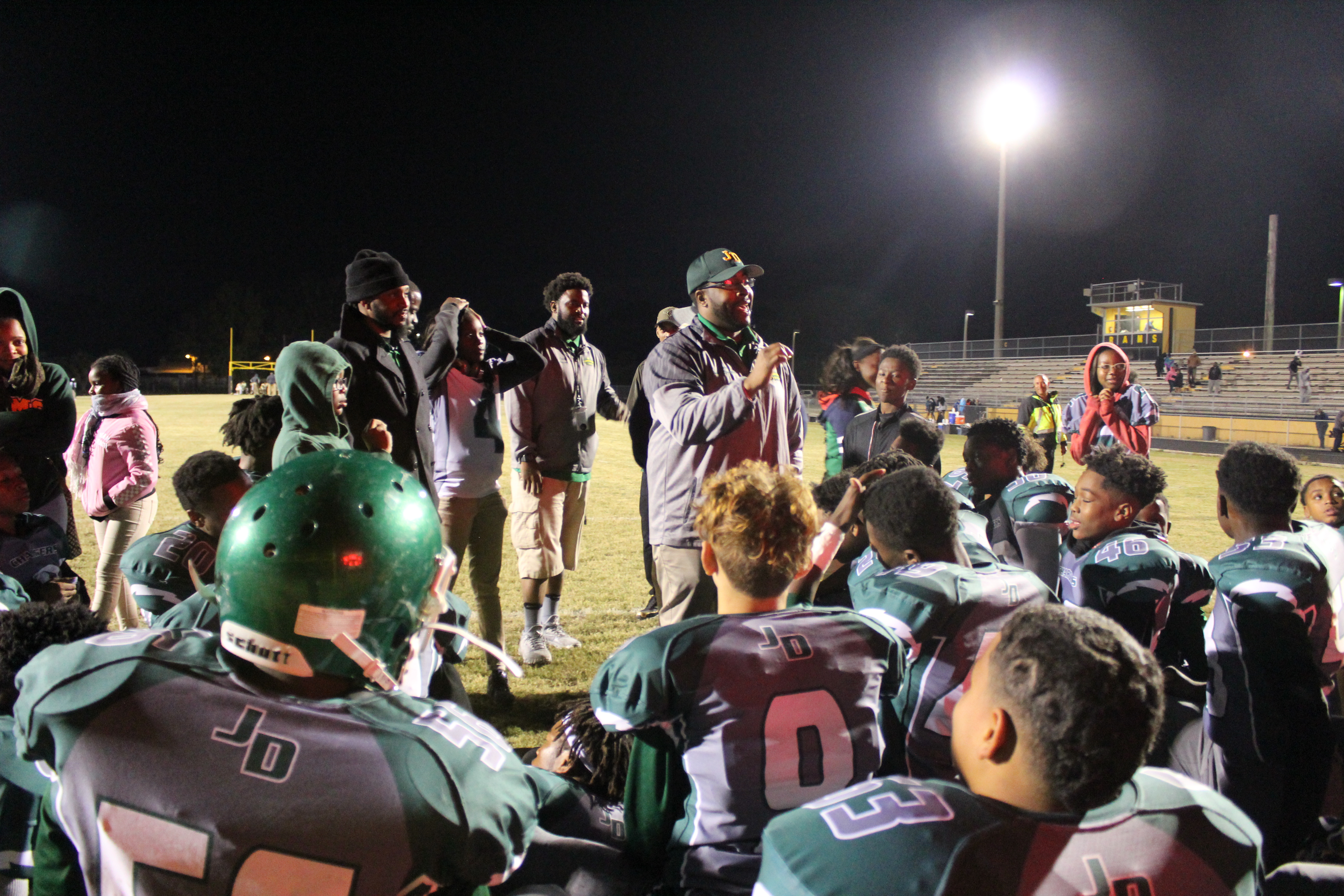 It was a bad dream for the Dragons that would quickly turn into a nightmare on their next possession. Dupont failed to get anything going on offense, and was forced to punt on fourth down. The Chargers executed a block punt and it was recovered by #1 Savion Wells who raced to the end zone to the disbelief of the crowd as Jeff Davis took a commanding 20-0 lead with four minutes left in the first quarter. A stunned Dupont sideline searched for answers, but there would be none on this night. Dupont, who had navigated an undefeated season, and possessed one of the more talented rosters in the city looked completely over matched, and they were. Even though Dupont possessed more size and length, Jeff Davis played faster, were more physical, and extremely confident, a true testament to Head Coach Reynolds and his coaching staff. Said Reynolds after the game. ” If you thought this game was physical you should see our practices. We get after it, so the players are eager to hit someone else”. This strategy seemed to work as Jeff Davis completely overwhelmed Dupont from the trenches to the secondary.