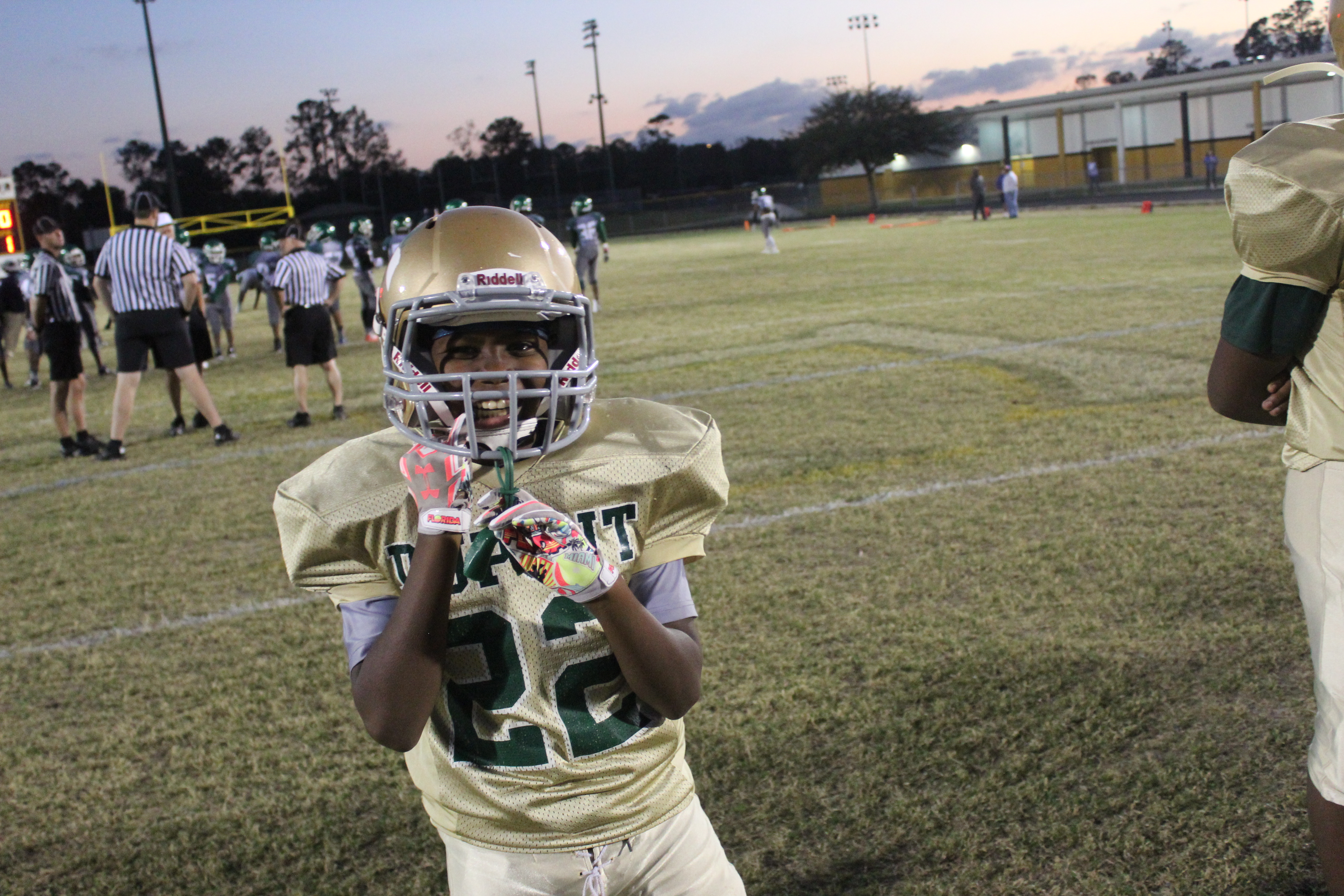 #23 Robert Bryant made several tackles all over the field in the second half refusing to go down without a fight. Defensive back #21 Kysaun Jones made perhaps the play of the night, as he guarded Jeff Davis Wide receiver Charles Thompson. Thompson leaped high in the air in an attempt to catch the touchdown pass late in the third quarter, but Jones skied with him and somehow made a spectacular one-handed interception snatching it away from Thomas. Efforts like that on defense by the Dragons showed why they were one of the city’s best teams, but Jeff Davis Keloun Walker reiterated to everyone in attendance why the Chargers are not just one of the best, they are the best. With another off tackle touchdown run in the second half, Walker put the team on his back and carried them to a 32-0 victory in the semifinal round of the Duval County Middle School Playoffs. Walker has a saying to his team every time they assemble ” Who’s got my back?” the eighth grader asks his team. After the game Walker expounded on what that meant. ” These are my brothers, we’ve been riding for a long time and we’re not going to let no one stop us”.