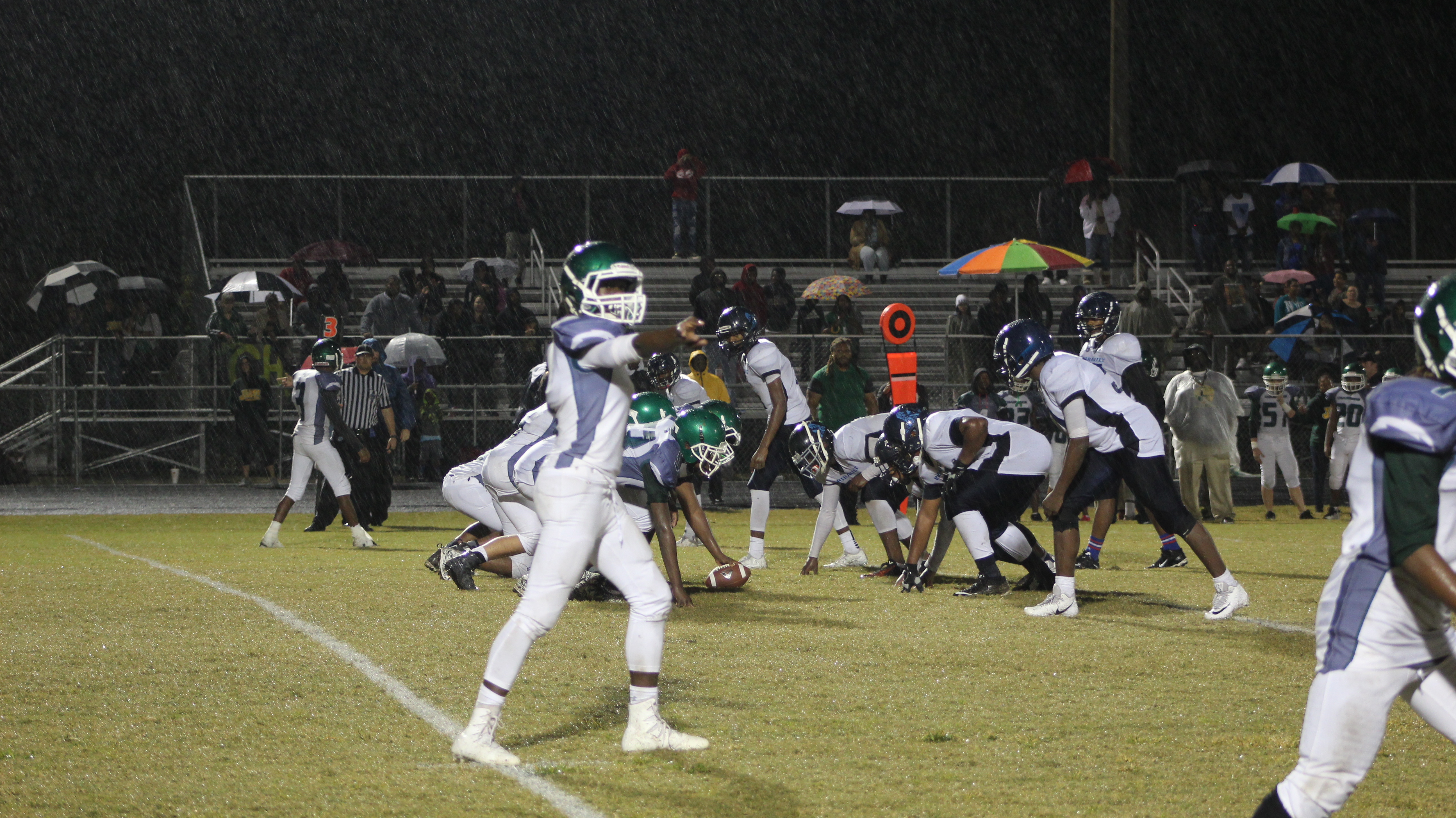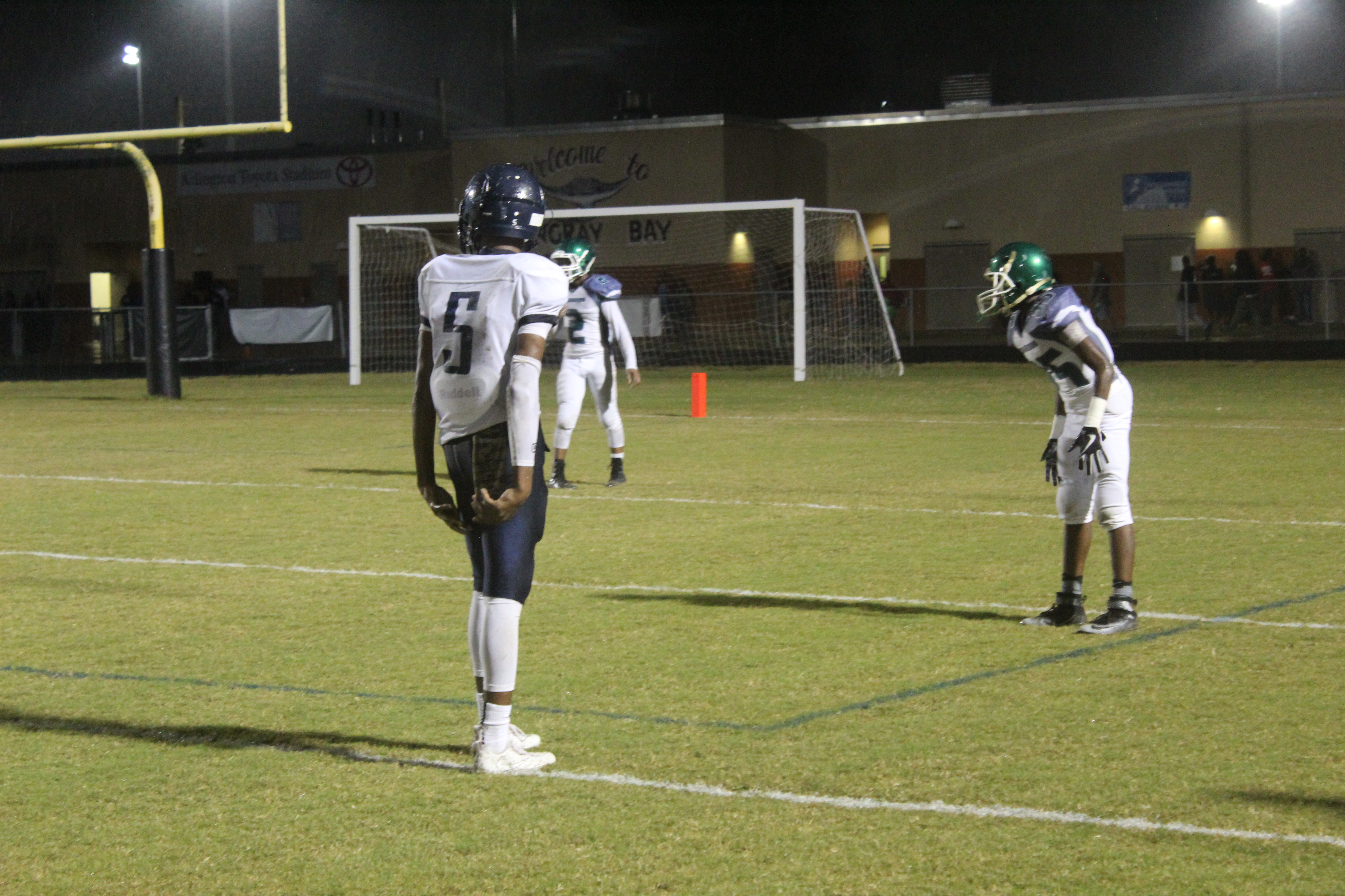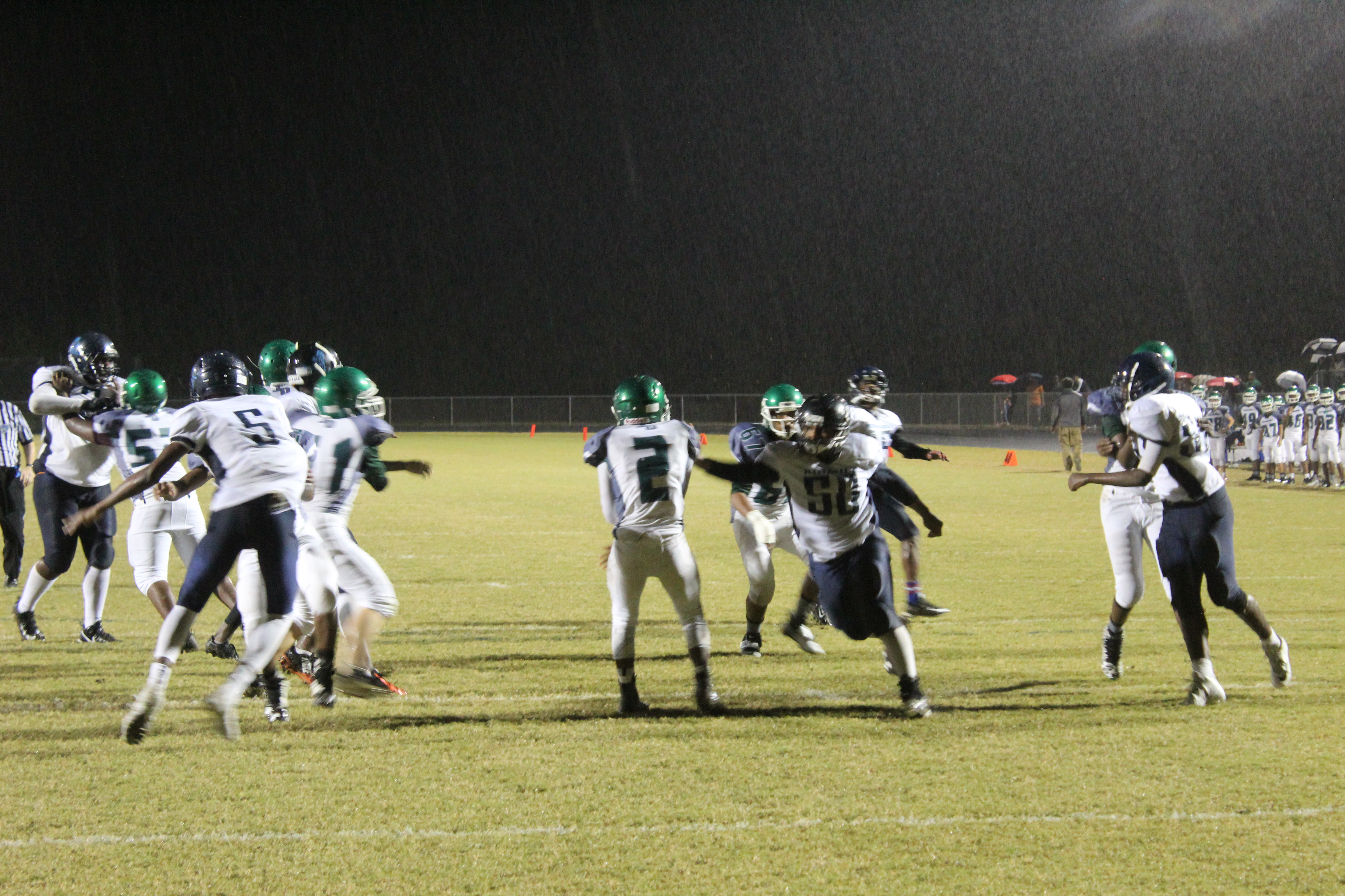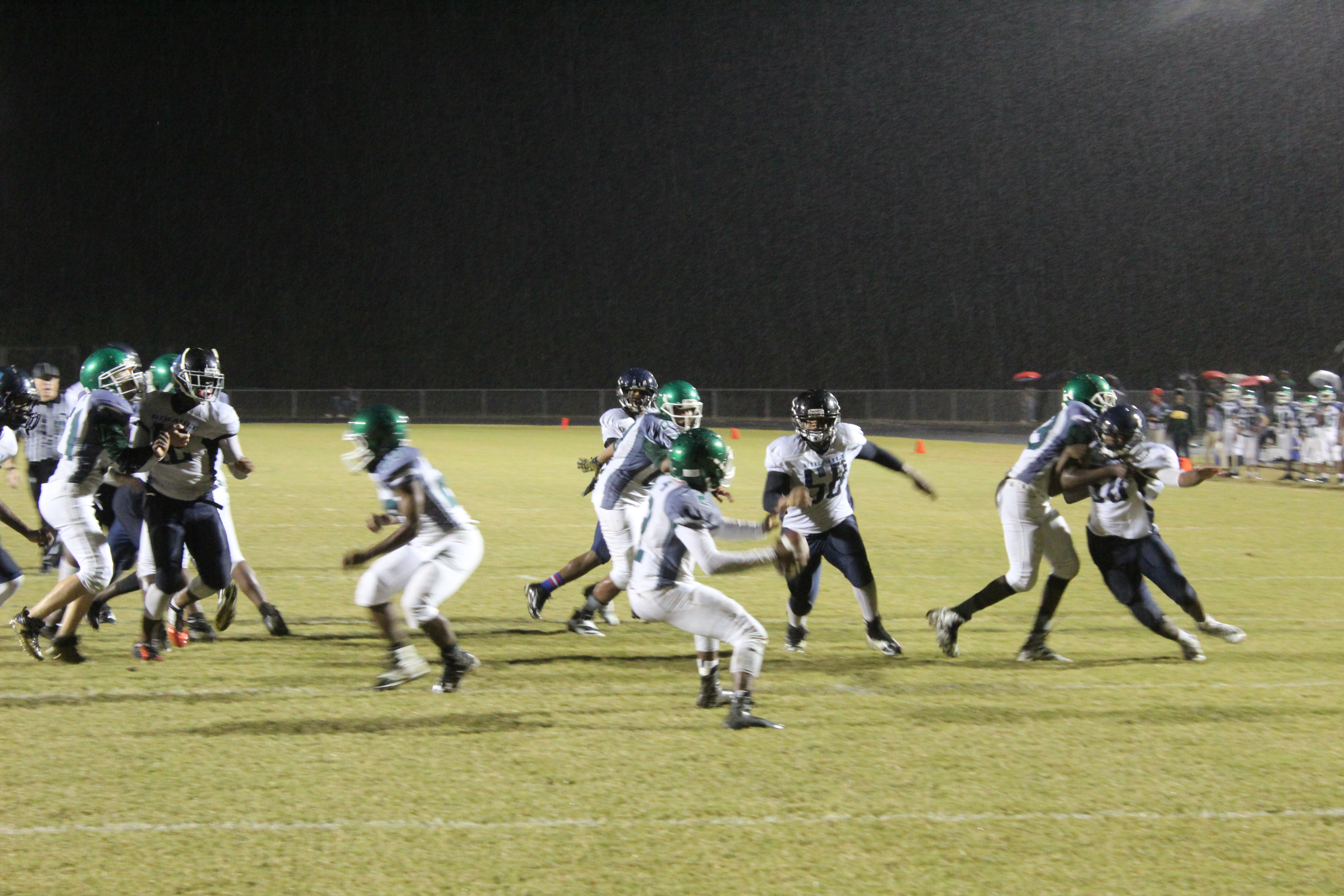 The high powered Ribault offense was held in check by Jeff Davis for most of the game. Quarterback Chris Calhoun hooked up with wide receiver Freddie Manning for a 35 yard reception, their longest hook up of the game. However the rest of the night saw Calhoun unable to elude the Charger rush with his scrambling. The Colts were also unable to run the ball effectively against the Jeff Davis stunting defenders. Kaloun Walker knifed in from his linebacker position to stop #2 Javari Williams.