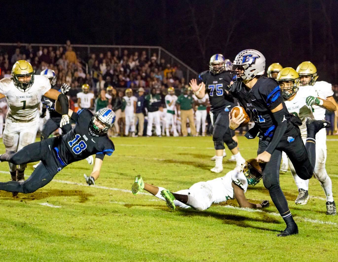 Bartram Trail- It was a rematch from the regular season, a playoff game between two teams very familiar with each other. In rematches, the team that won the initial game sometimes can run into trouble in the rematch. However that wasn’t the case when Bartram Trail hosted Fleming Island Friday night. The Bears, who won the regular season contest 32-16, completely dominated the Golden Eagles from start to finish in the rematch winning the game 38-13. The win guaranteed Bartram a spot in the state semifinals next week, but the Bears would have to wait to see who and where they would play. When the smoke finally cleared, it was revealed that Bartram Trail would face Plant at home for the chance to go to Orlando to play for a state title.