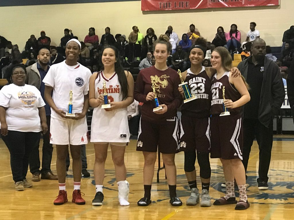 Palatka FL-The St. Augustine High School girls basketball team defeated Monsignor Edward Pace HS in the finals of the Jarvis Williams Holiday Tournament 70-44 to win the tournament. After going 3-0 during the 3 days of competition, the Jackets defeated University Christian (49-38) and Pedro Menendez HS (61-50) to advance to the finals. Jackets players Brooke Reed, Brianna Green and Kyra Stauble earned “All-Tournament” honors for the Jackets (below). Green scored a game high 21 points, and Reed added 17 points as the top scorers of the championship game. The Jackets improved their overall record on the season to 12-4 after the victory.