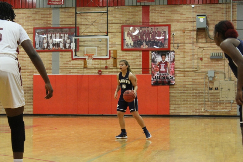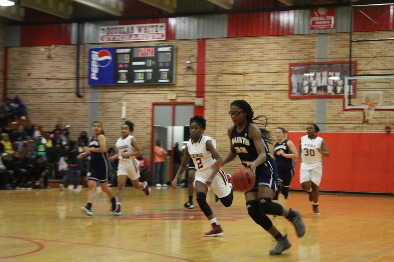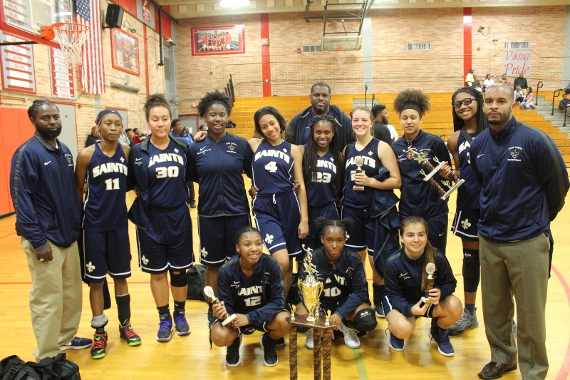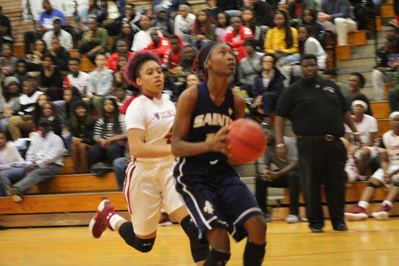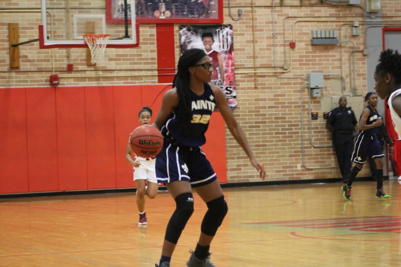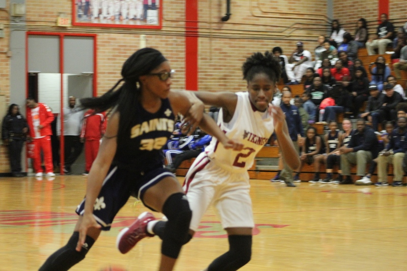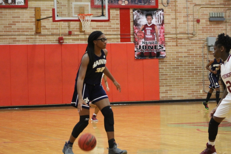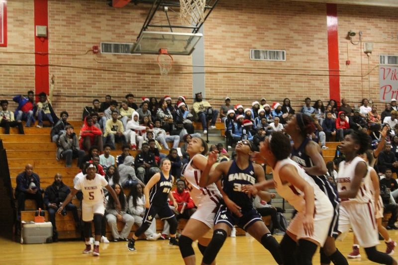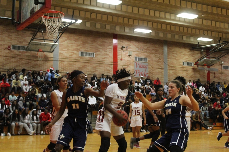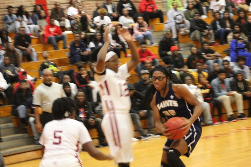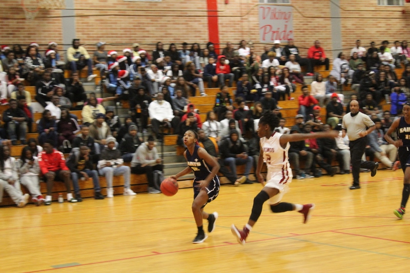 Raines HS– Sandalwood jumped out to a 5-0 lead in the Raines Christmas tournament and never looked back defeating the host Vikings 60 to 31 on Friday night. Sandalwood was led by Auriyah Stewart who had 17 points. Sandalwood had the decisive height advantage which played an important role in the game. The Saints were able to gain second chance points with offensive rebounds, and contest Vikings shots. Lauran Alvarez used her skills to score 13 points for the Saints. They moved the ball extremely well, finding open players to score the basketball. #5 Maria Torres pushed the ball up court and distributed the basketball effectively, while Stewart hit many open shots in the game.