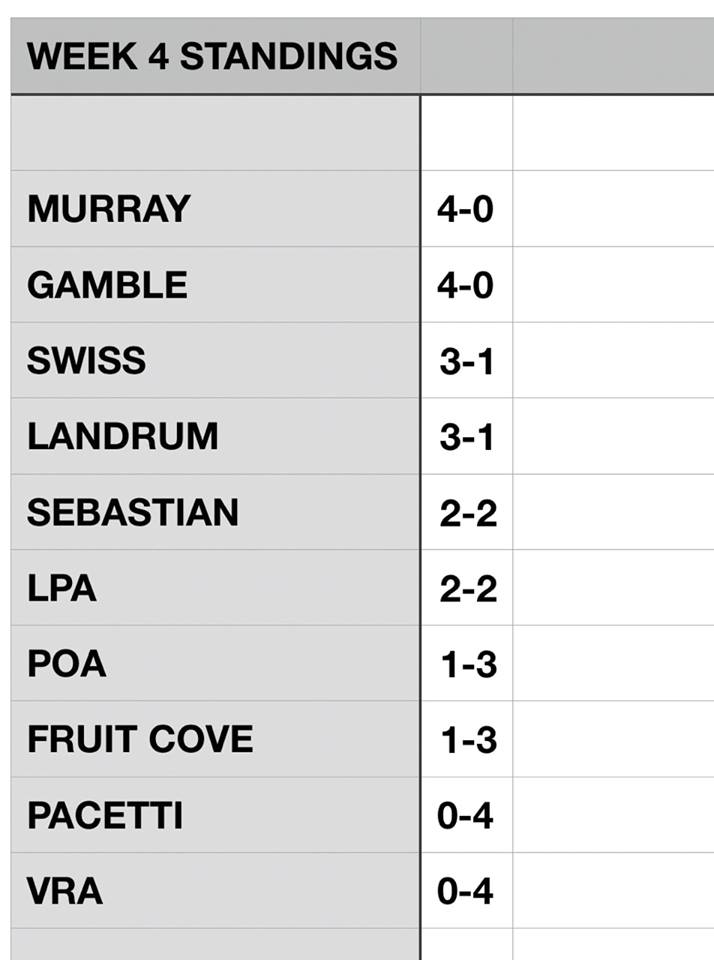 Gamble Rogers (4-0) takes on Swiss Point (3-1) next week at Plantation Park in a rematch of the 2017 St. Johns County Middle School Athletic Association championship game won by the Stingrays.