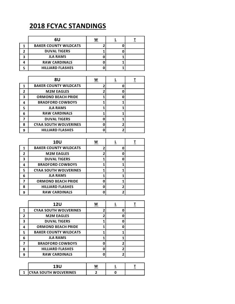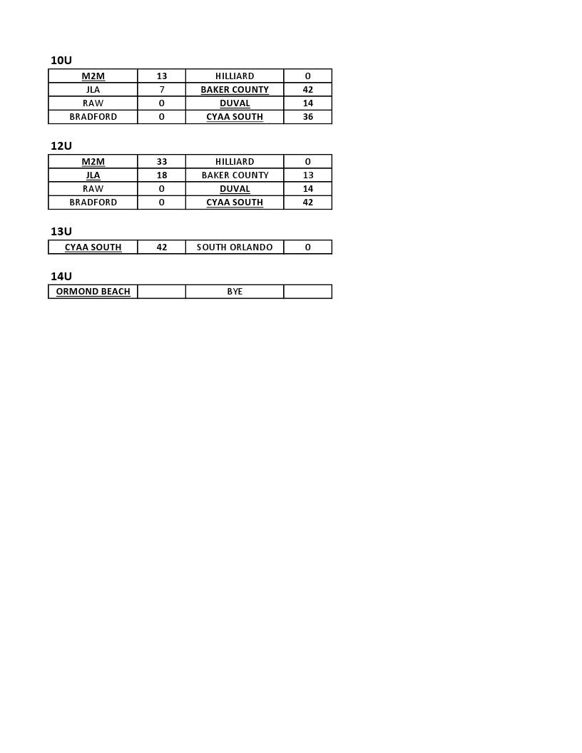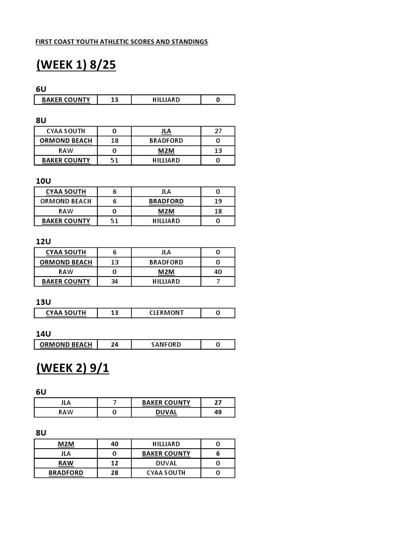 With two weeks under their belt some teams have established themselves as clear favorites. Baker County 6U is 2-0 on the year after beating JLA and Hilliard. The young Wildcats are rolling right now! In 8U action, look out for M2M ( Mentor 2 Mentee) who are 2-0 after beating Raw and Hilliard. In 10U action, the Duval Tigers started 1-0 joining Baker County and M2M! That division is going to be a battle royal! The 12U division features CYAA South the park that went all the way to the AYF Nationals last year has two associations now (double trouble). They are 2-0 and looking to keep up their winning ways. Ormond Beach is a park that finds itself undefeated along with M2M and Duval Tigers in 12U as well. Finally in 14U Ormond Beach is undefeated as they look to represent the FCYA in that division against the best in the country!