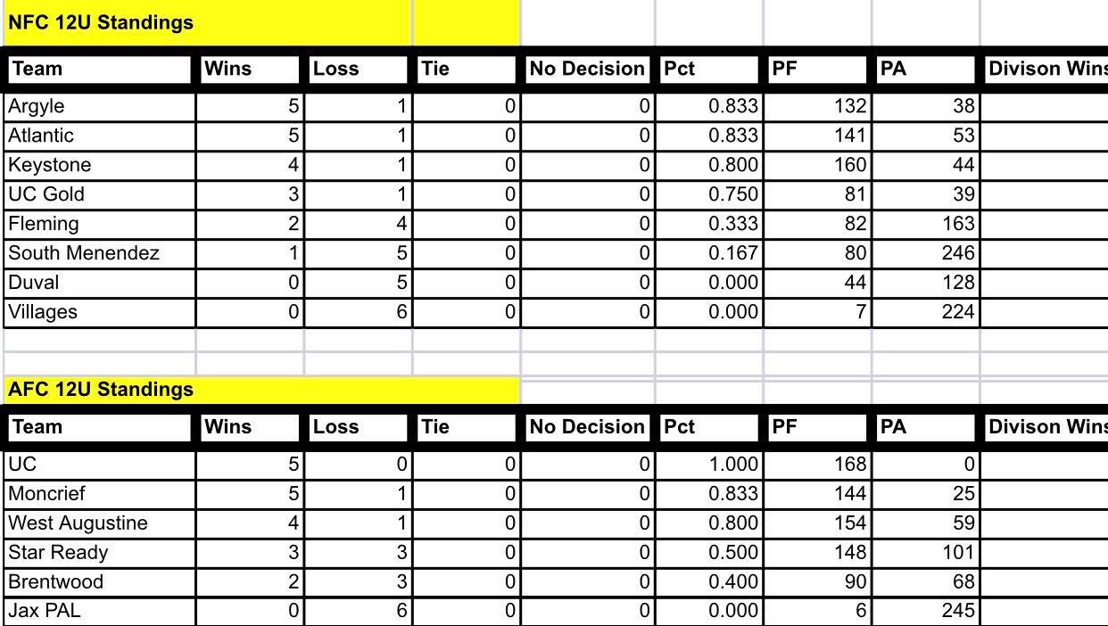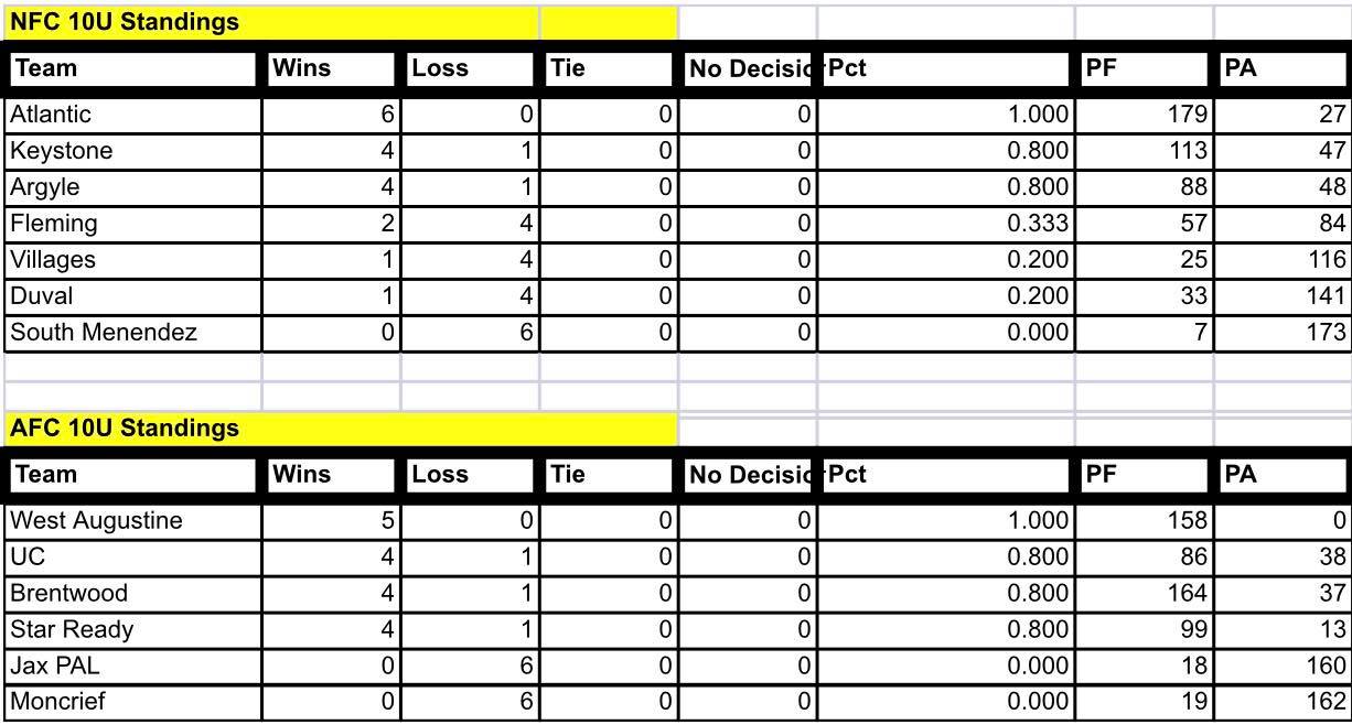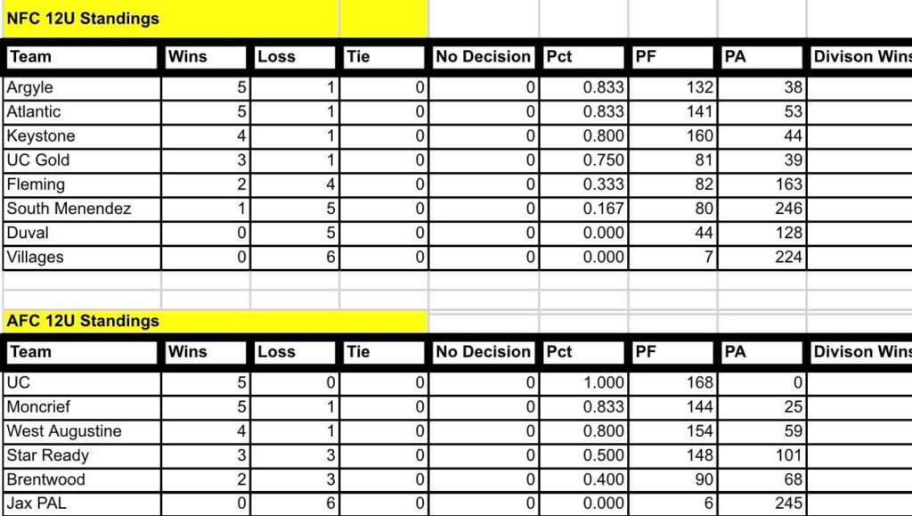 As the youth football season keeps rolling along, the SJRYFC is featuring several teams who are making their mark this year. One team that is doing very good is the Argyle Spartans 12U team. At 5-1 on the season, the Spartans are conquering many that come in their path. The Argyle park is doing well overall. The 10U team is 4-1, 6U team is 3-2, and the 8U team is 2-3 before heading into week #7. Check out the scores and standings from Week #6 as the Conference rolls into week #7.
