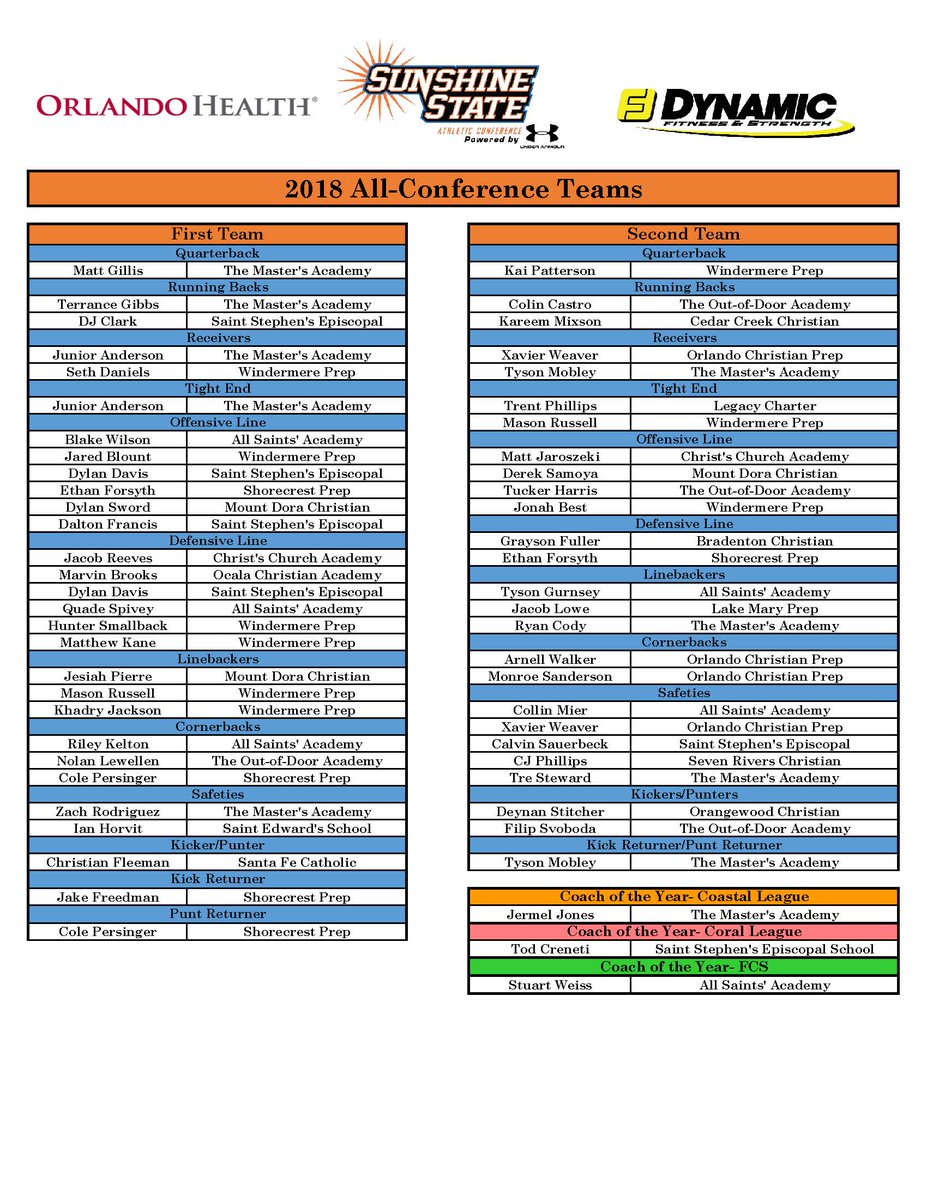 Cedar Creek, coached by Jamie Gamel, playing in its first year in the league and won the First Coast Division was represented by senior tailback Kareem Mixson on the second team offense.