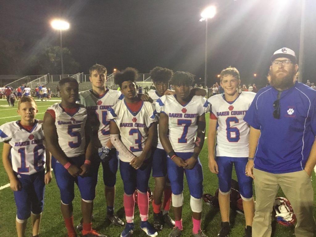 With just 2:34 remaining in the game, #10 Chason Clark caught a pass from Da’Jon Shanks for the go ahead Bradford touchdown! An incredible 2-point conversion was good by Shanks to give Bradford the 22 to 15 lead over Baker County. On the final play of the game, Bradford’s defensive end Dayton Roberts sacked Baker’s quarterback as time expired giving Bradford the hard fought win.