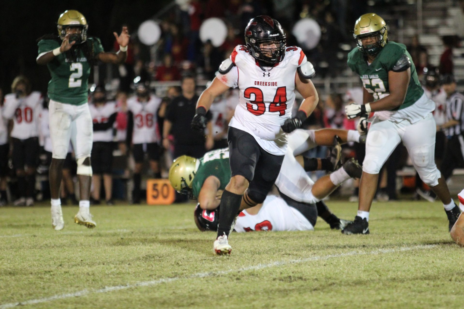 Quarterback Wilson Edwards ran for an early score, and also tossed a late touchdown to wide receiver Ashton Reynolds with :34 seconds to play to lift Creekside over Fleming Island. Fleming Island’s Cibastian Broughton tossed three touchdowns, two of them to running back Sam Singleton in the loss.
