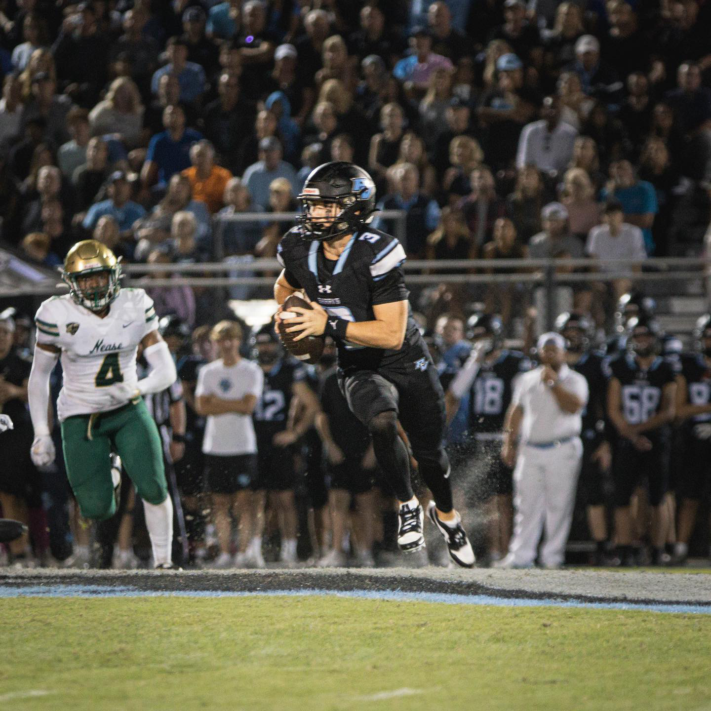 Nease jumped out of the gate quick, and that’s no surprise at all. Quarterback Bryce Frick is quite possibly the hottest quarterback in the area right now The quarterback has put up some great numbers passing for 1,169 yards, 14 TDs, 2 Ints in just 6 games played. He’s also run for 208 yards and 2 scores with a very hard schedule. On his very first drive, he hit wide receiver Maddox Spencer for a score. He’d finish with 250 yards passing, 2 touchdowns and 2 interceptions. He also added 65 yards on the ground and a decisive touchdown run with a minute left in the game.