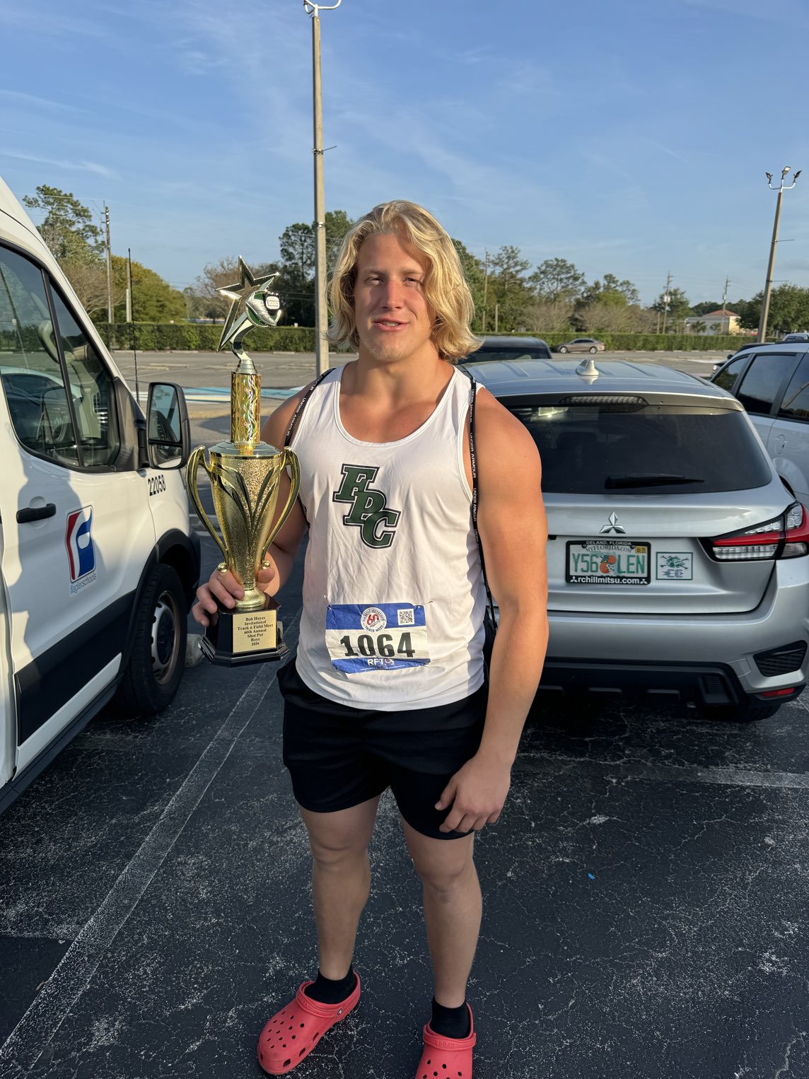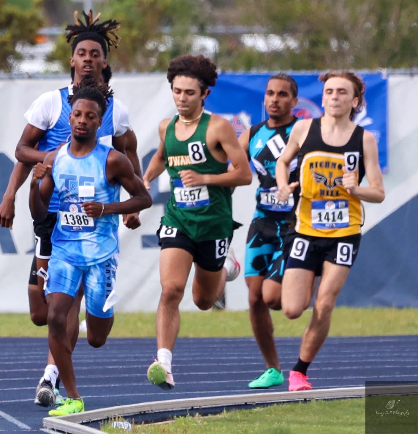 Another top team was Bishop Kenny where Emily Wheldon‘s11:18.29 and Davis Johnson (11:43.59) came in first and second in the girls 3200M. Ezra Huber cleared 14′ 2.5″ in the boys pole vault for first place. Zyaire Thomas (Fletcher) ran a 55.03 in the girls 400m for the win. Takoda Brown (Oakleaf) went 47′ 3.75″ as the Triple Jump champion. Colby Cronk of Flagler Palm Coast was the shot put champion throwing a 38′ 5″. The Boys 1600M invite was won by Andrew Morello of Wolfson who ran a 4:19.14.