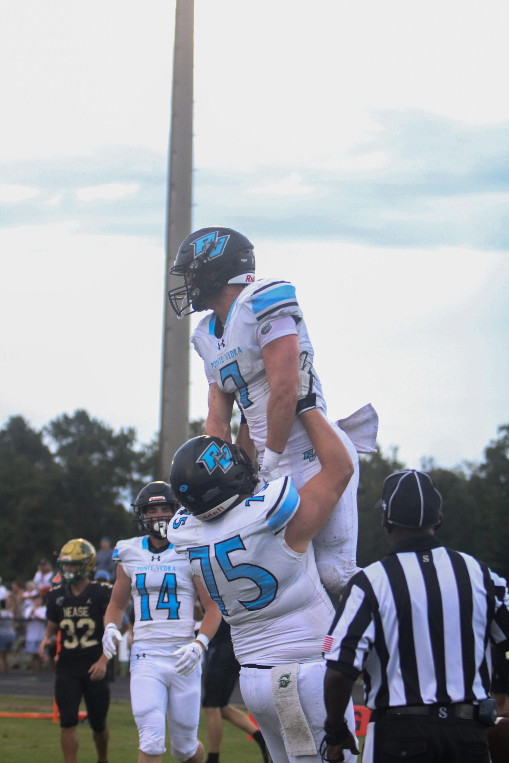 Tied 7-7, and as the first quarter came to a close, Nease’s Brayden Felder restored the Panther’s lead with a diving catch in the end zone, sparking momentum for the rest of the game. Felder wasn’t finished yet, scoring his second touchdown just before halftime, increasing Nease’s advantage to 21-7. It was a “Felder’s Choice” in the first half as the junior wide-out capitalized on matchups to make Ponte Vedra’s defense pay.
