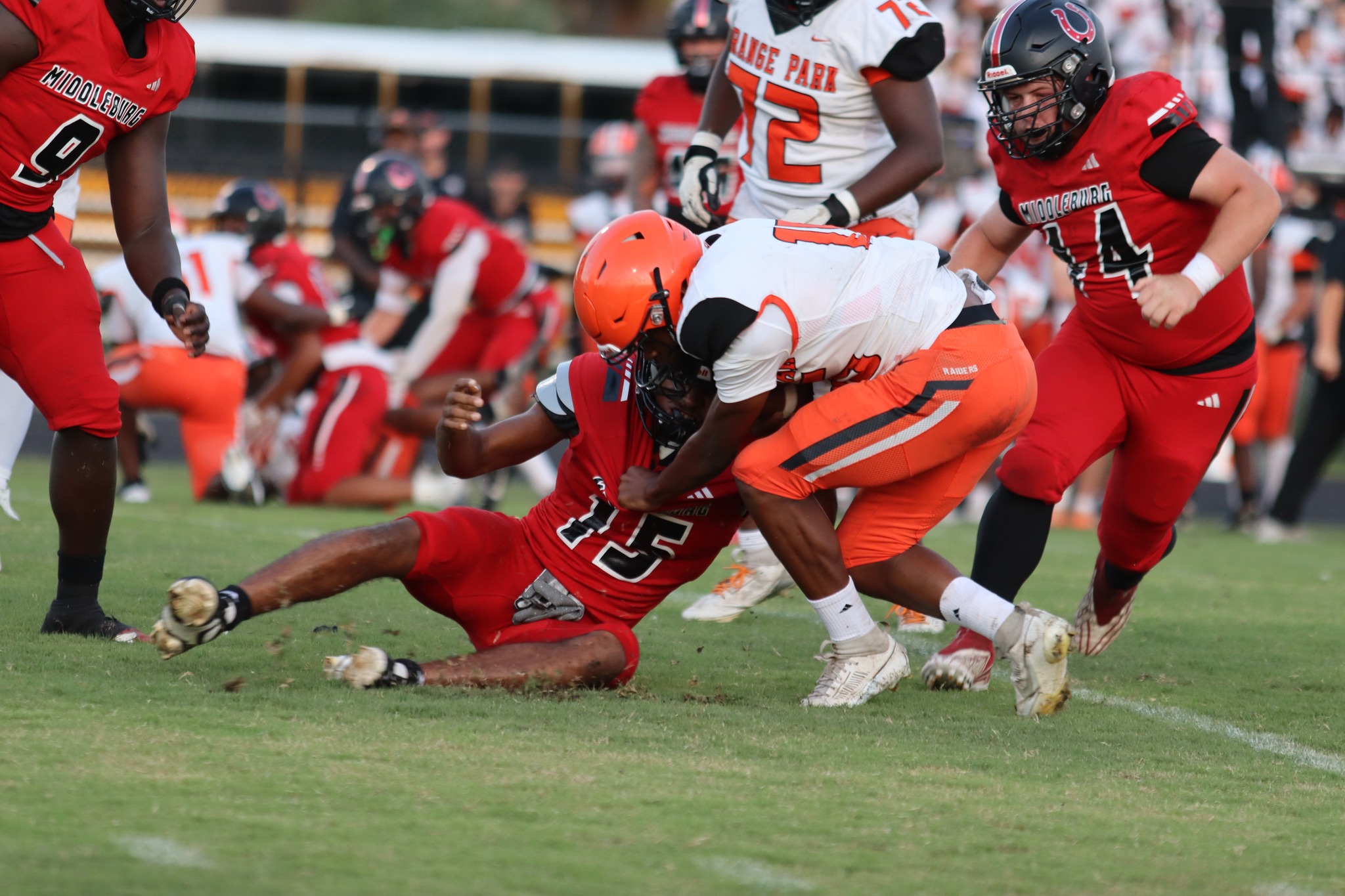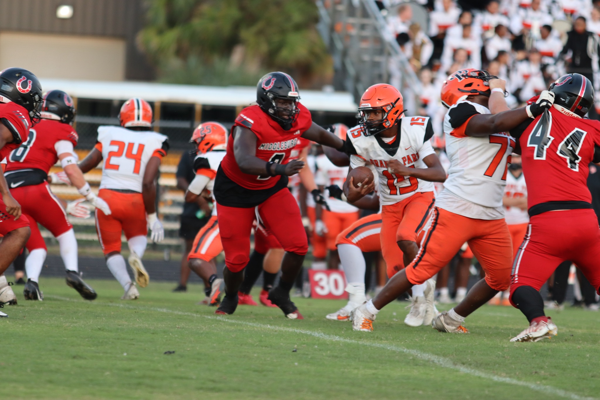 Middleburg Fl- After jumping out to a 10-0 lead Friday night, Middleburg (6-0) found themselves in a storm with rival Orange Park (1-5) as the Raiders scored 14 unanswered points to take the lead 14-10 at the beginning of the third quarter.