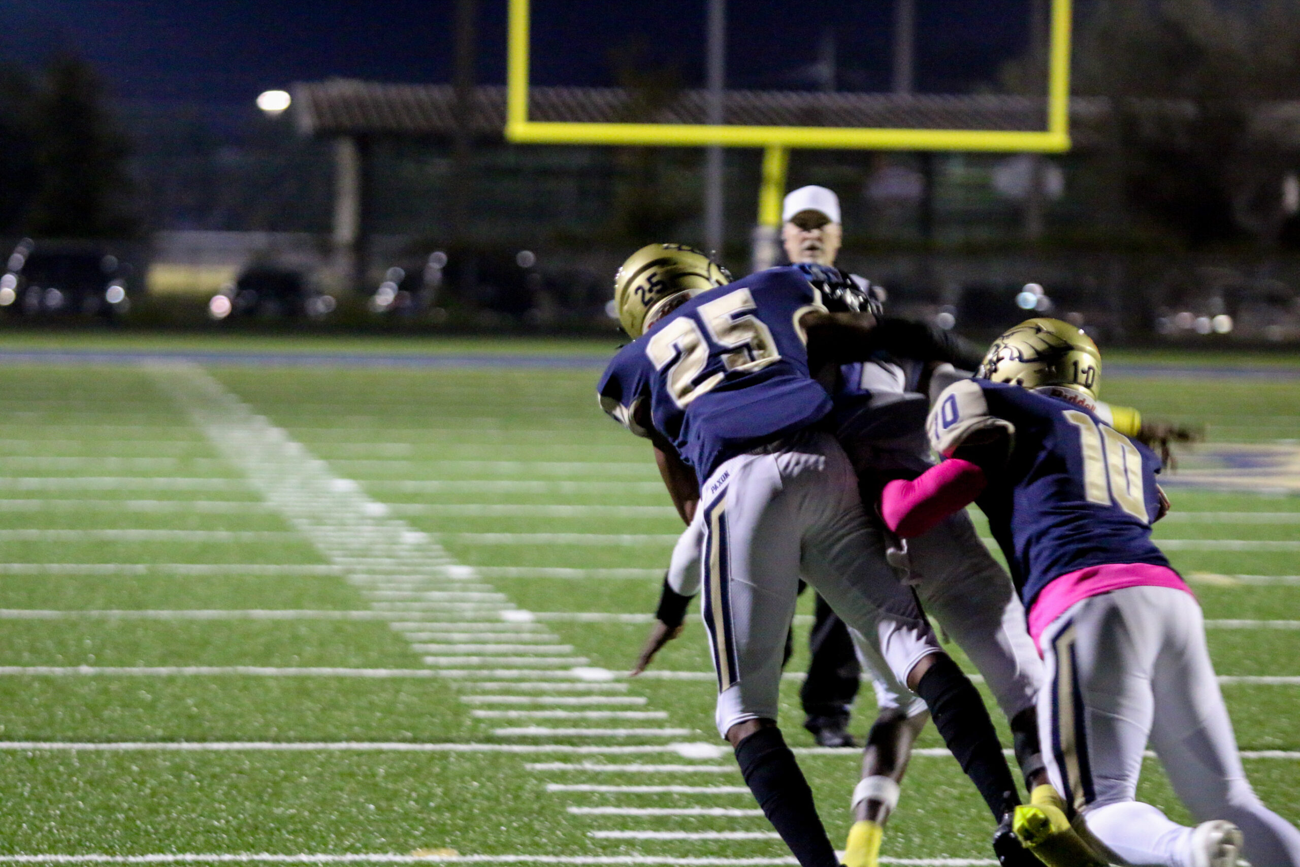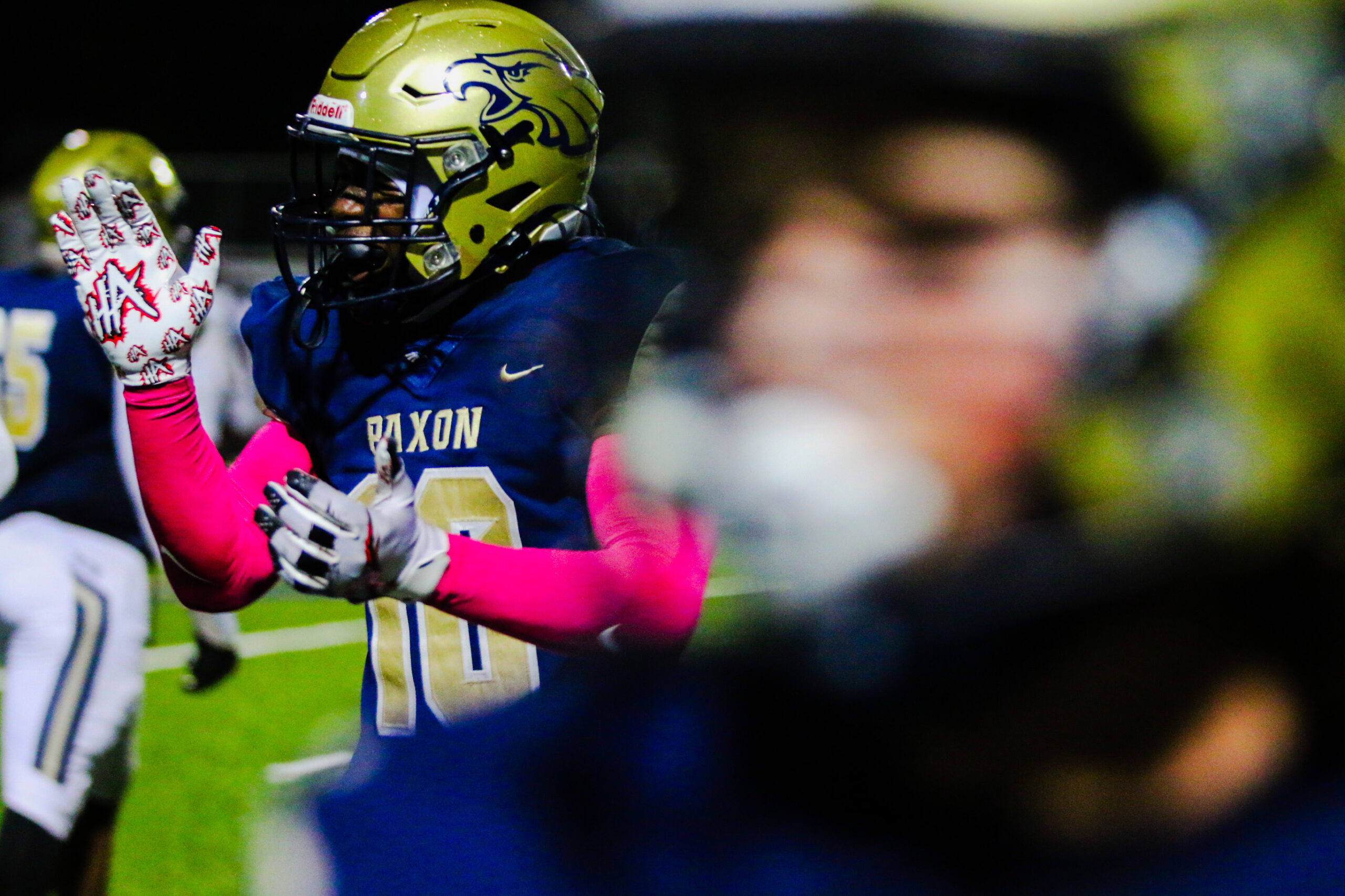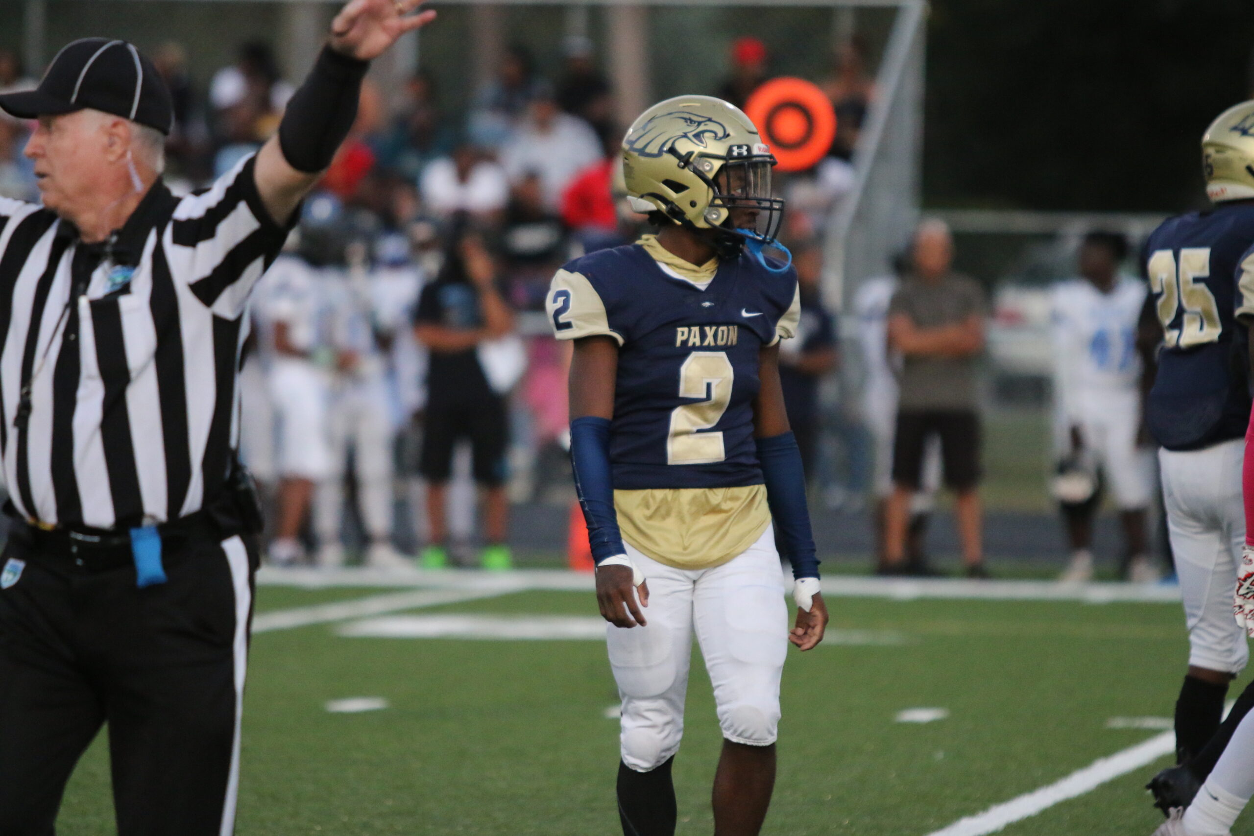 It was a defensive battle all game, and Paxon’s defense stood up big on several occasions. In the second quarter, Ribault threatened to score from the Paxon 1-yard line, yet the Golden Eagle defense stuffed Ribault four times. Ke’shaun Pinkney-Rogers flew up from his defensive back position to provide pivotal run support. He made a touchdown saving tackle at the one yard line to stop Ribault’s Jaylen Francis from scoring.