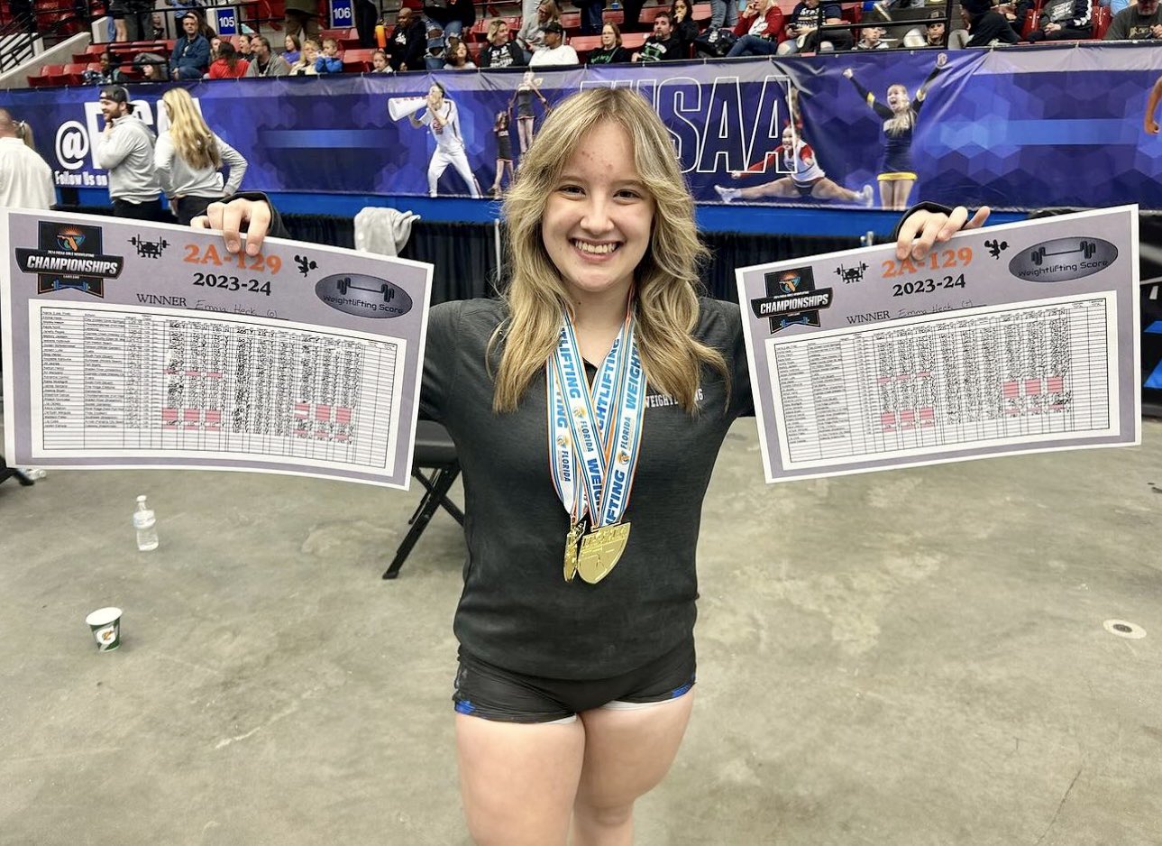 She is the record holder in Snatch and Clean & Jerk her Freshman through Junior years, then bumped up in weight class as a senior setting a new state record in the Snatch.