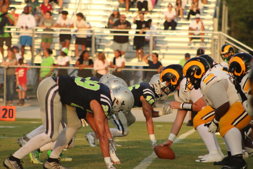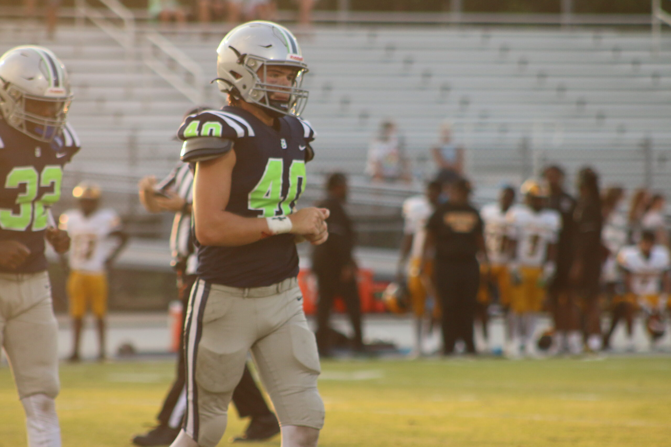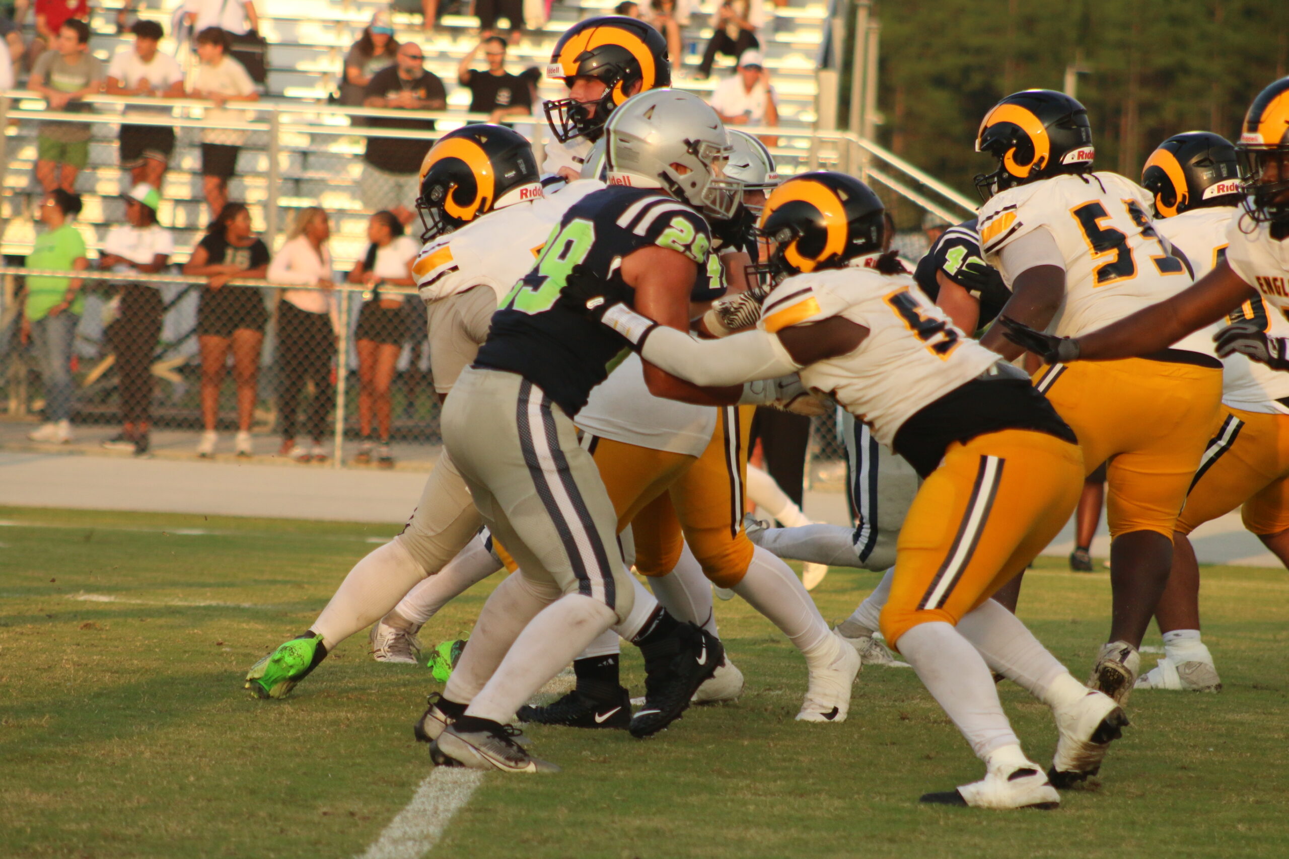 The tone was set right away. After Beachside won the toss and deferred, kicker Owen Carey boomed the opening kickoff through the end zone. On Englewood’s first possession, disaster struck—the Rams fumbled, cause by Andrew Crews and Jameson Sells pounced on it to give the Barracudas prime field position.