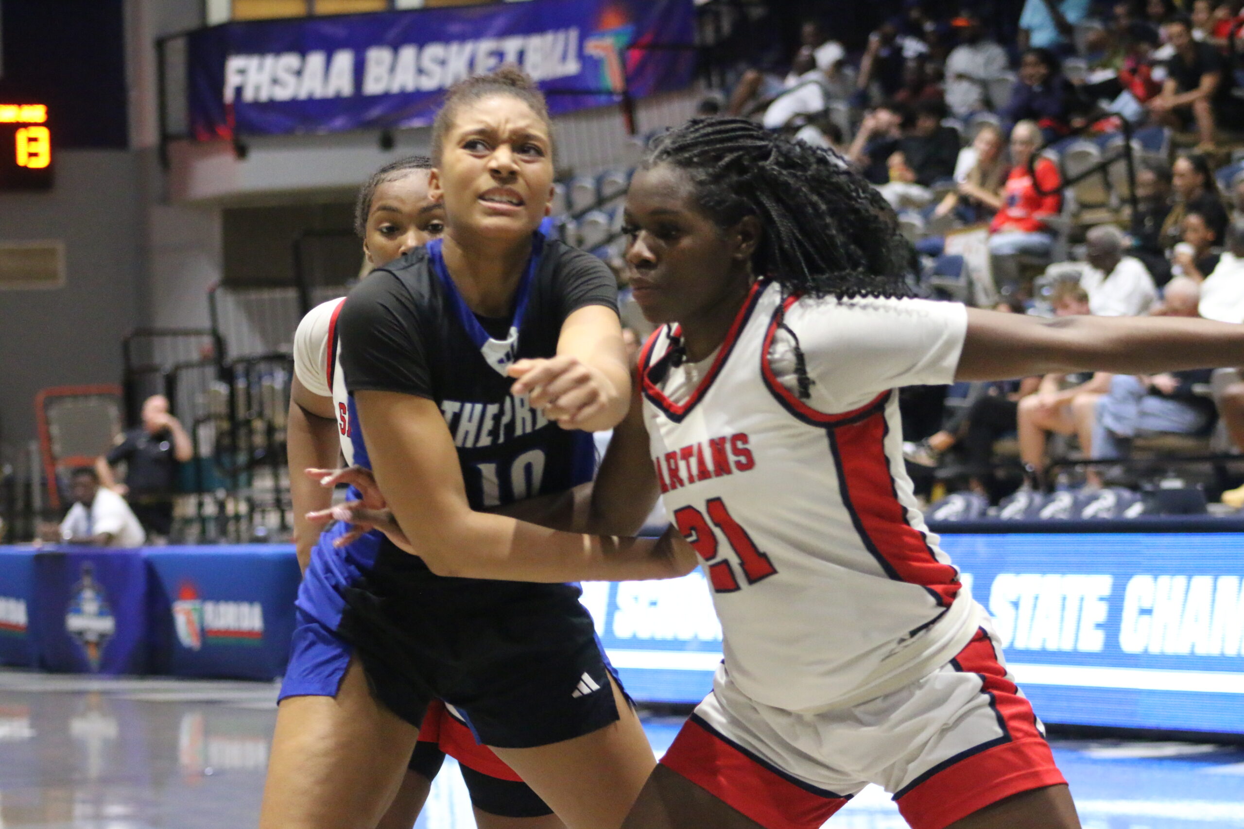 San Jose Prep struck first when #10 Mia Chandler knocked down a two-point basket to give the Storm an early 2–0 lead. However, Miami Country Day quickly answered. #21 Kennedy Deal scored inside to put her team ahead, and moments later #34 Casey O’Connell buried a three-pointer to stretch the lead to 7–2.