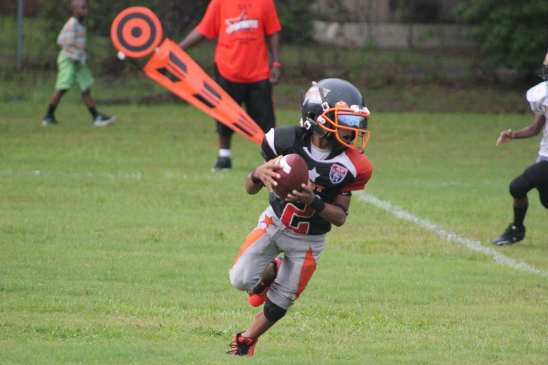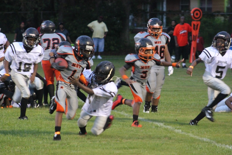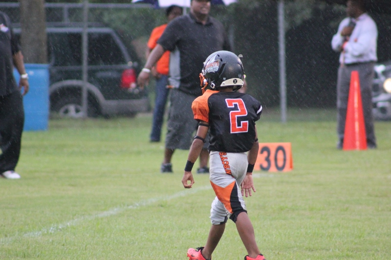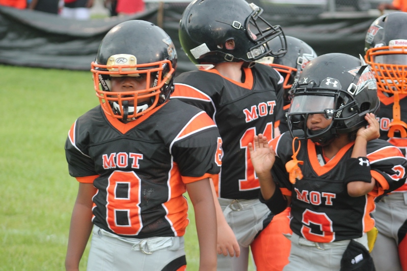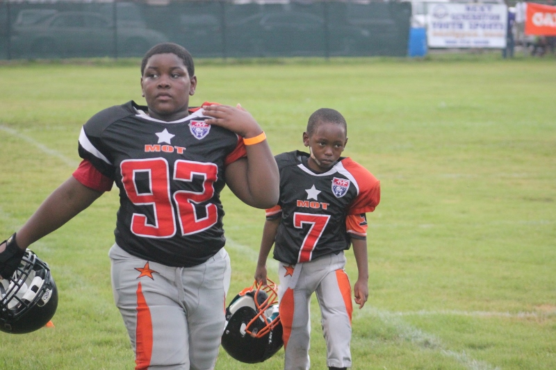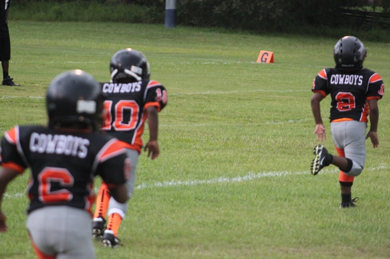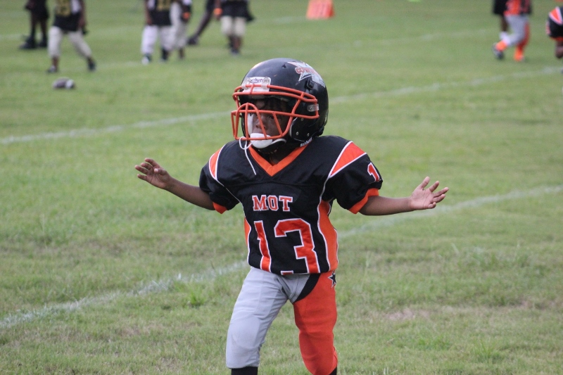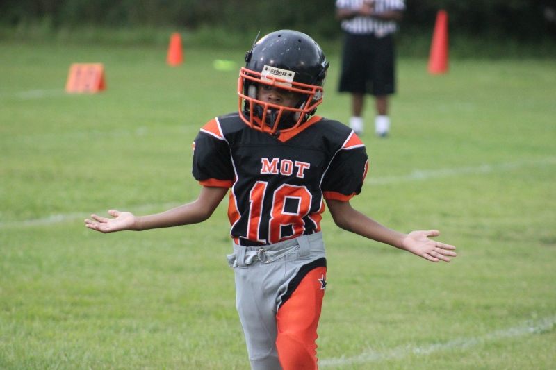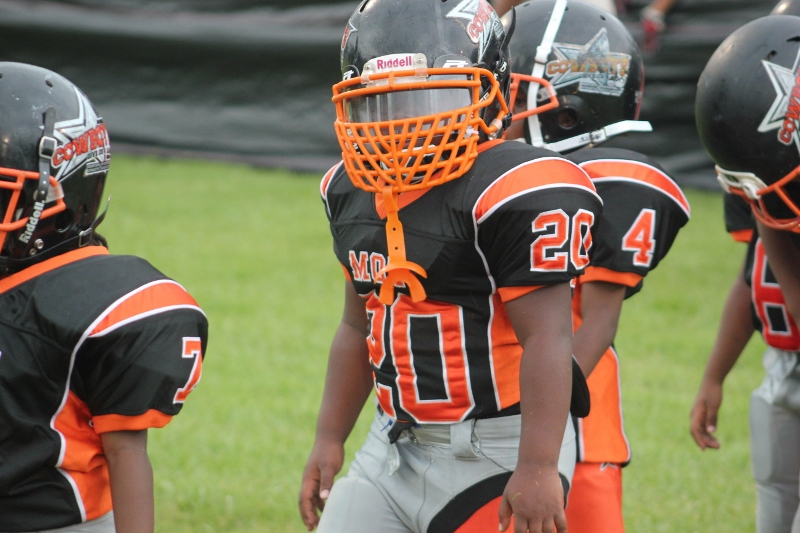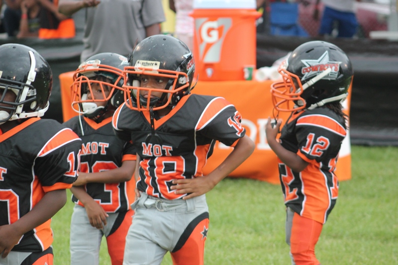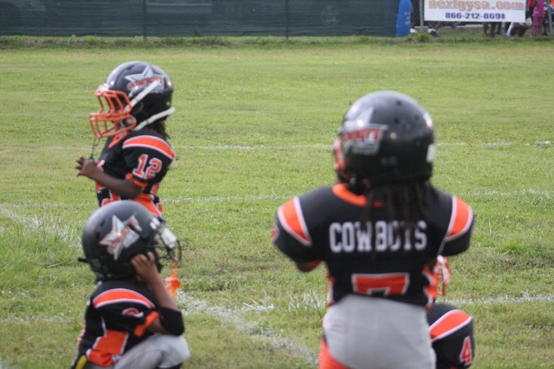 The youngsters got out there and ran around a bit, as the 6U Cowboys defeated the 6u Saints 28-7. The cowboys used a ground attack that featured their power back #20. The Saints kept it competitive but could not keep up with their opponents. In the end M.O.T, it was MOT that marched to victory not the saints. Both teams seemed to have fun however, and at this level that’s what its all about. Charis Stubbs who’s son Ta’Shaun Houston (RB) plays for the Saints, says her son was very excited to play his first year of football. When asked why she signed him up for football this year she replied ” this is his passion”. Tanya Cullum, mother of 6U Tyson Callum agreed. “He’s always wanted to play (football).” She noted that she observes Tyson getting “very focused on game days”. Maybe this is why Tyson says that his favorite part of playing Center and Defensive End is hitting!