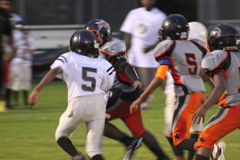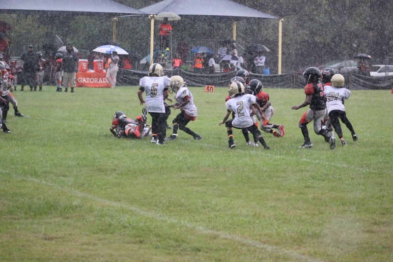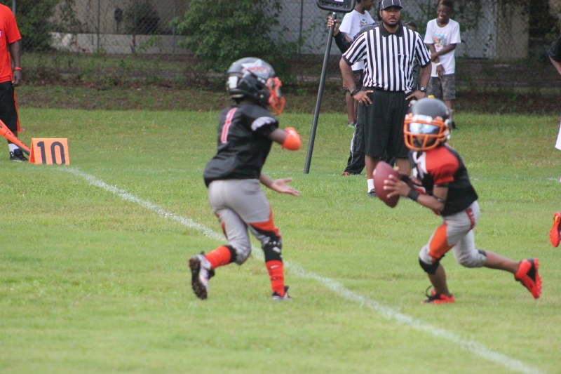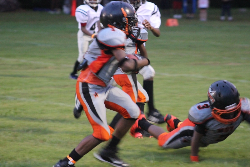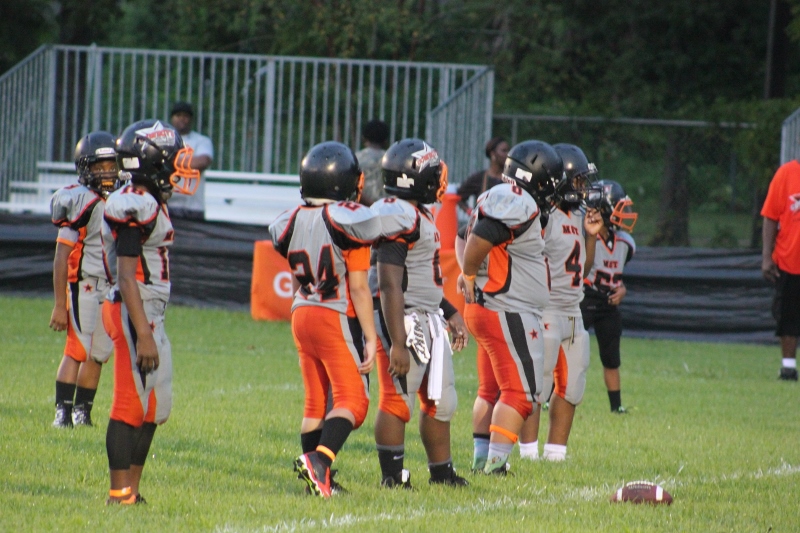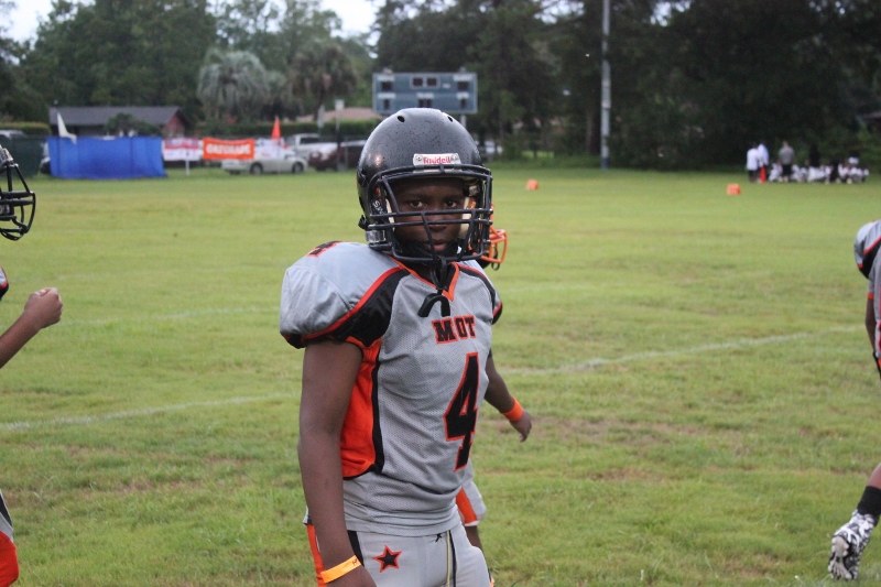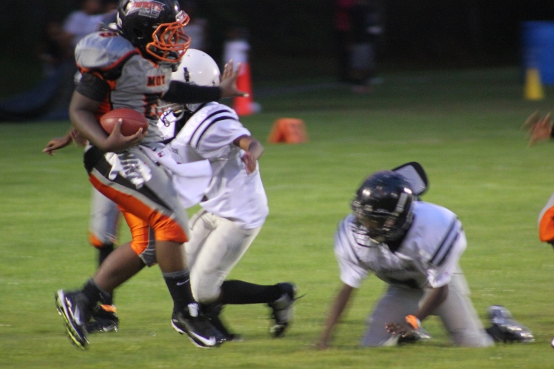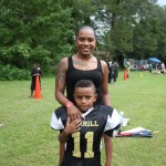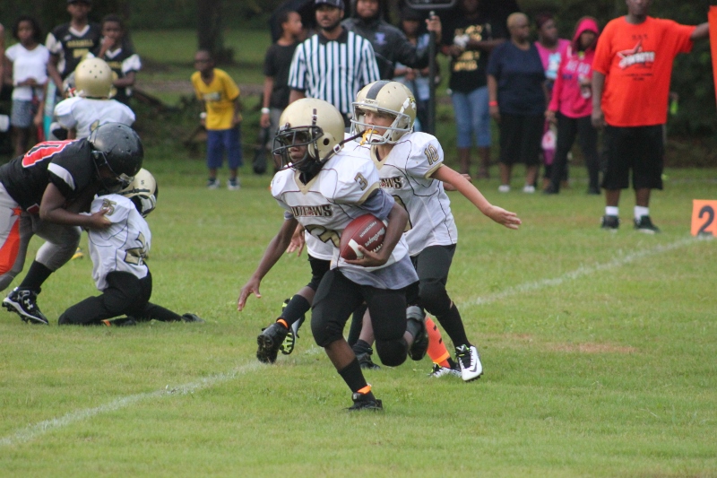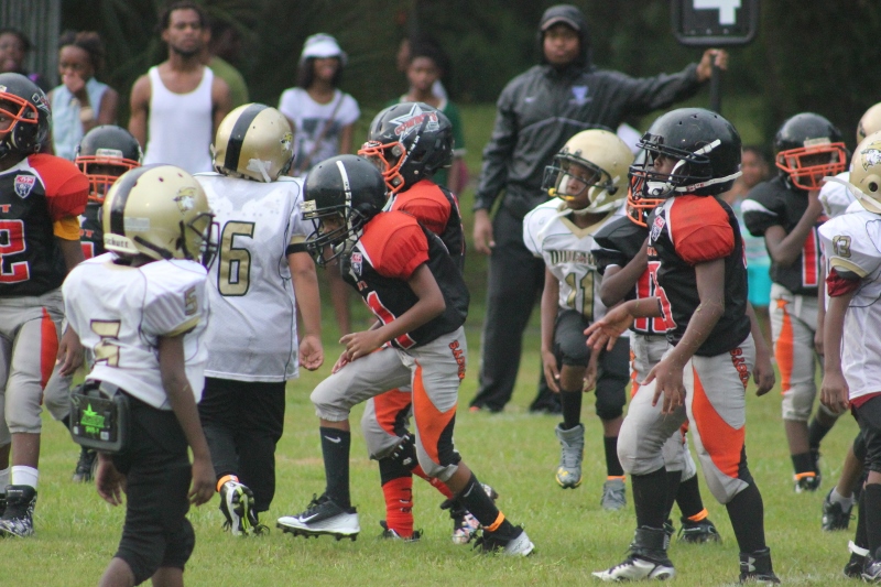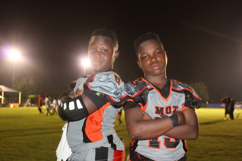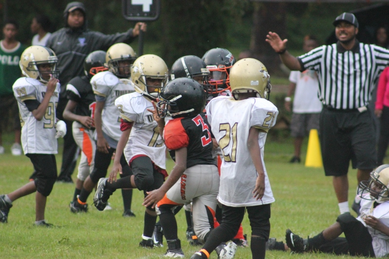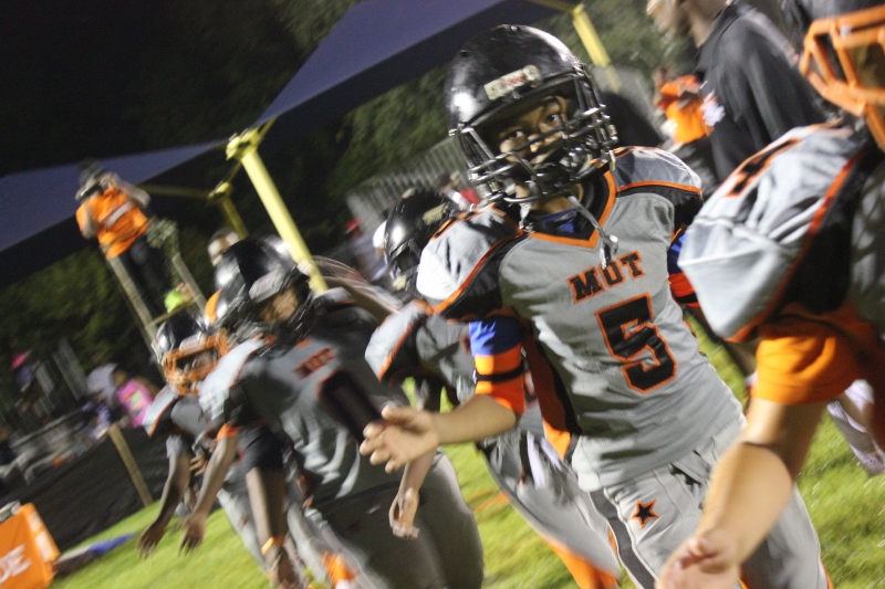 The youngsters got out there and ran around a bit, as the 6U Cowboys defeated the 6u Saints 28-7. The cowboys used a ground attack that featured their power back #20. The Saints kept it competitive but could not keep up with their opponents. In the end M.O.T, it was MOT that marched to victory not the saints. Both teams seemed to have fun however, and at this level that’s what its all about. Charis Stubbs who’s son Ta’Shaun Houston (RB) plays for the Saints, says her son was very excited to play his first year of football. When asked why she signed him up for football this year she replied ” this is his passion”. Tanya Cullum, mother of 6U Tyson Callum agreed. “He’s always wanted to play (football).” She noted that she observes Tyson getting “very focused on game days”. Maybe this is why Tyson says that his favorite part of playing Center and Defensive End is hitting!