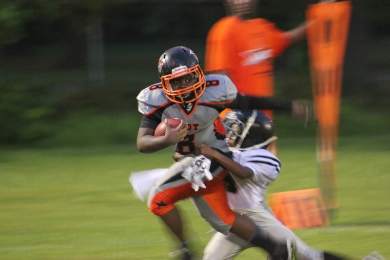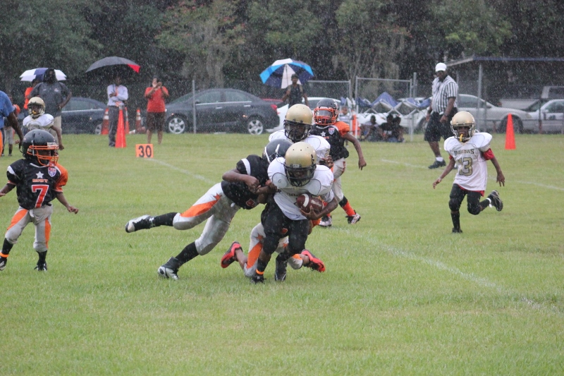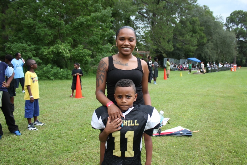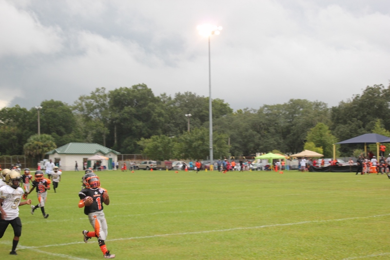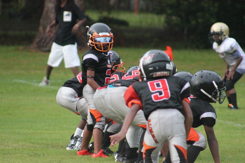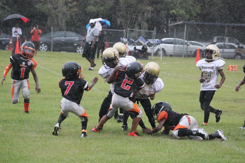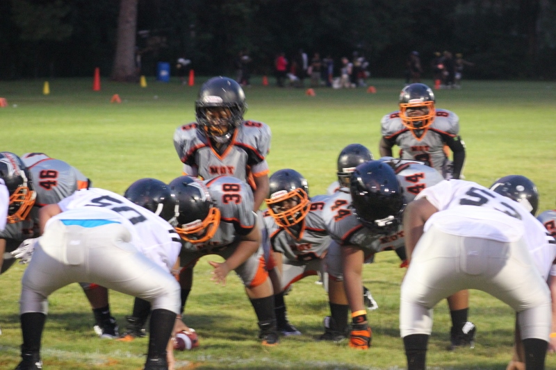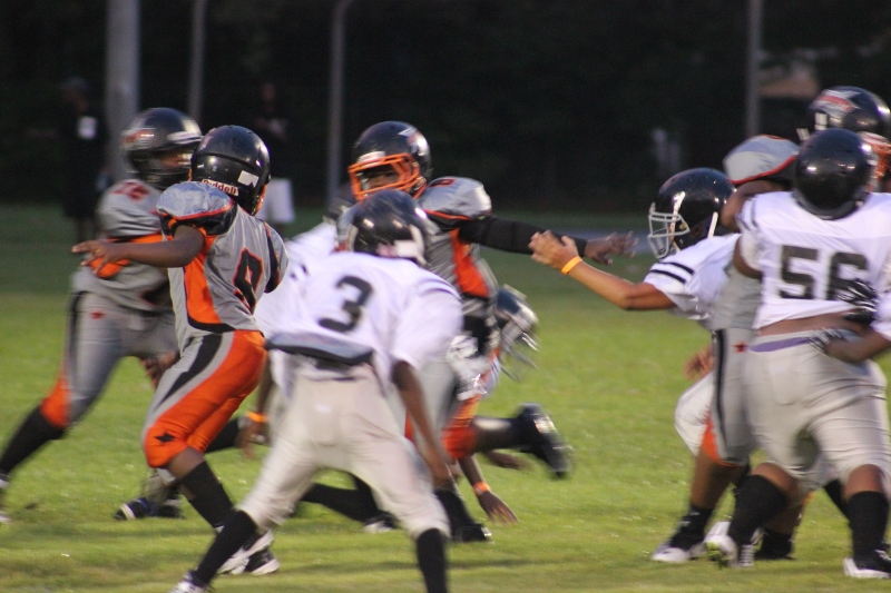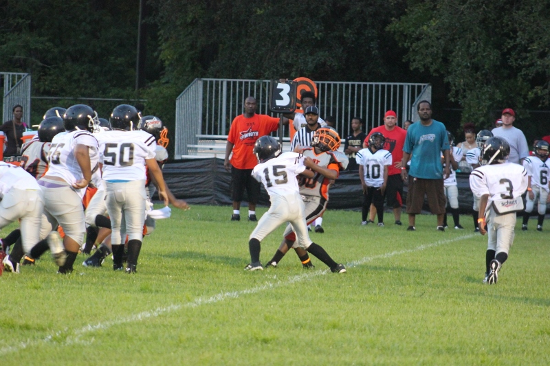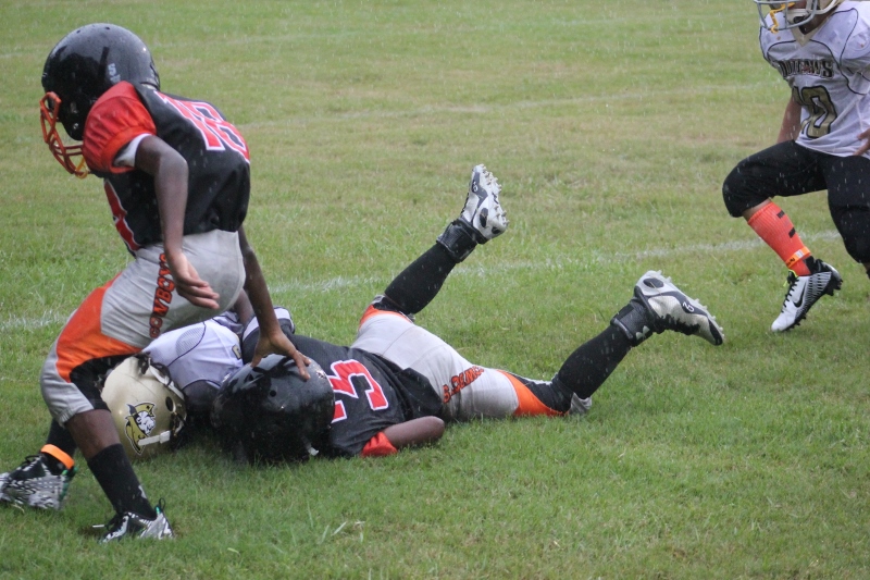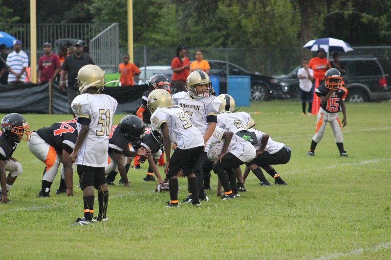 The youngsters got out there and ran around a bit, as the 6U Cowboys defeated the 6u Saints 28-7. The cowboys used a ground attack that featured their power back #20. The Saints kept it competitive but could not keep up with their opponents. In the end M.O.T, it was MOT that marched to victory not the saints. Both teams seemed to have fun however, and at this level that’s what its all about. Charis Stubbs who’s son Ta’Shaun Houston (RB) plays for the Saints, says her son was very excited to play his first year of football. When asked why she signed him up for football this year she replied ” this is his passion”. Tanya Cullum, mother of 6U Tyson Callum agreed. “He’s always wanted to play (football).” She noted that she observes Tyson getting “very focused on game days”. Maybe this is why Tyson says that his favorite part of playing Center and Defensive End is hitting!