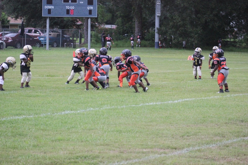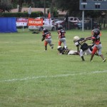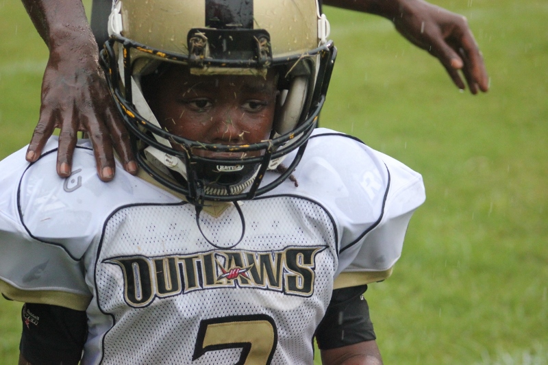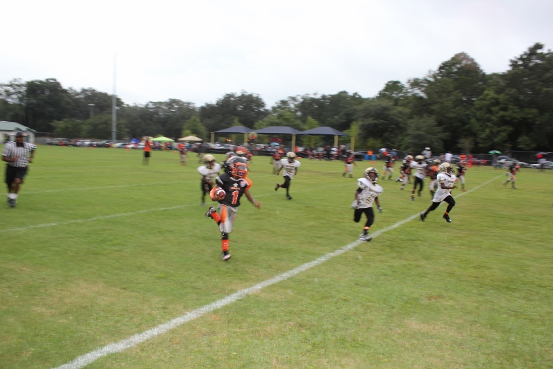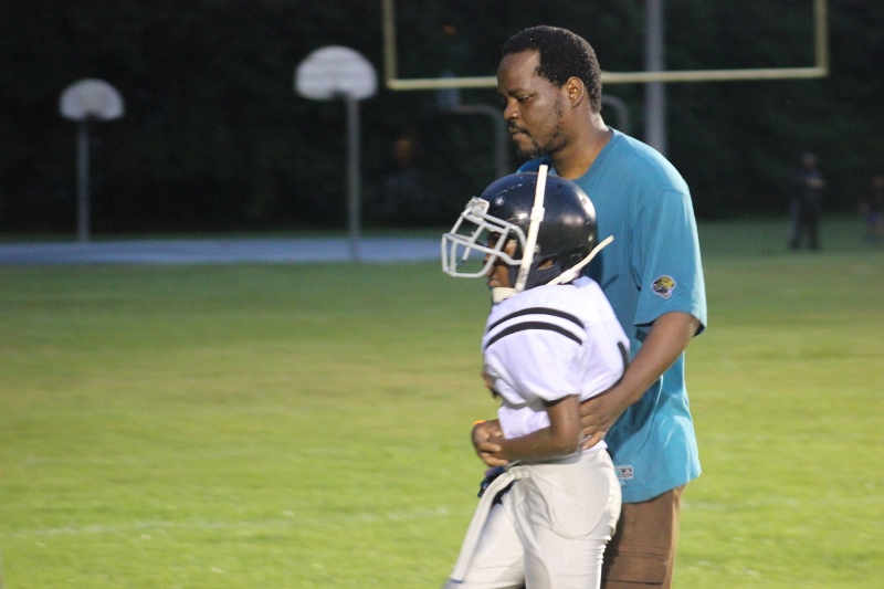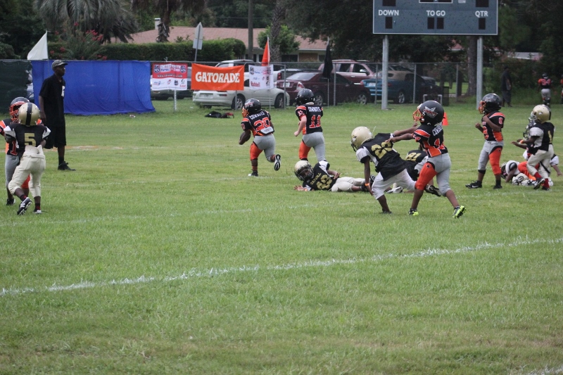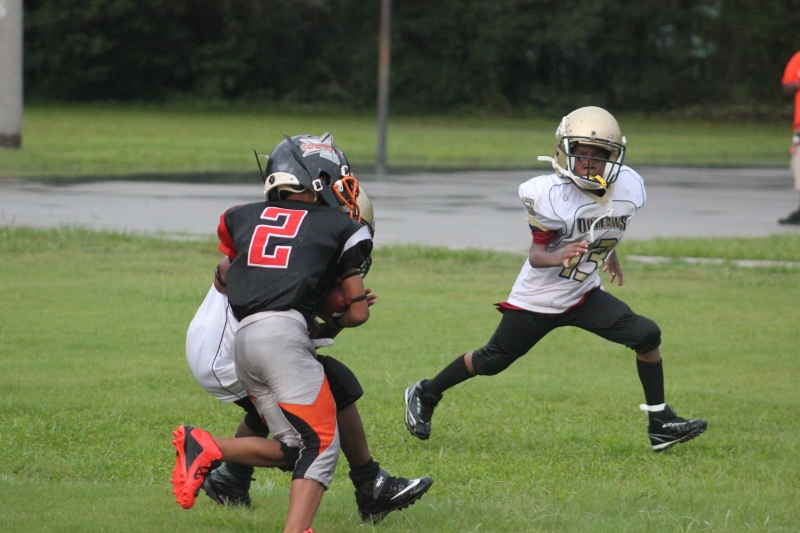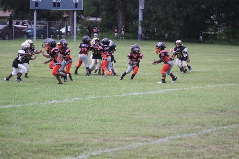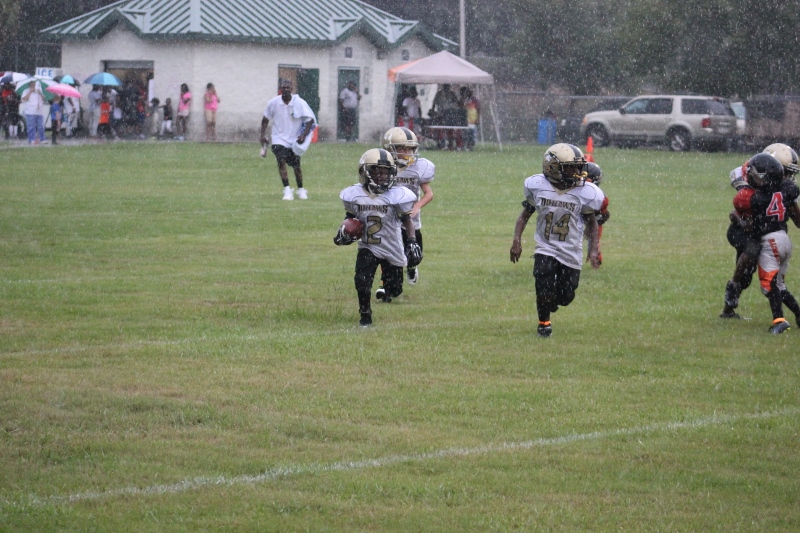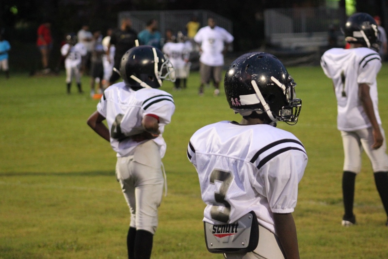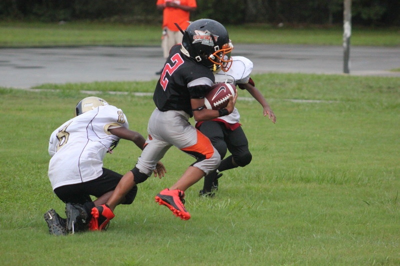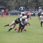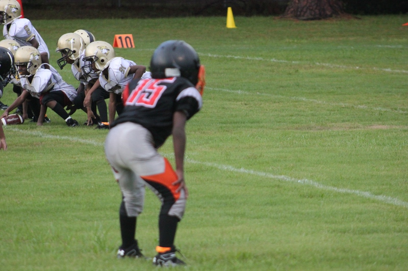 The youngsters got out there and ran around a bit, as the 6U Cowboys defeated the 6u Saints 28-7. The cowboys used a ground attack that featured their power back #20. The Saints kept it competitive but could not keep up with their opponents. In the end M.O.T, it was MOT that marched to victory not the saints. Both teams seemed to have fun however, and at this level that’s what its all about. Charis Stubbs who’s son Ta’Shaun Houston (RB) plays for the Saints, says her son was very excited to play his first year of football. When asked why she signed him up for football this year she replied ” this is his passion”. Tanya Cullum, mother of 6U Tyson Callum agreed. “He’s always wanted to play (football).” She noted that she observes Tyson getting “very focused on game days”. Maybe this is why Tyson says that his favorite part of playing Center and Defensive End is hitting!