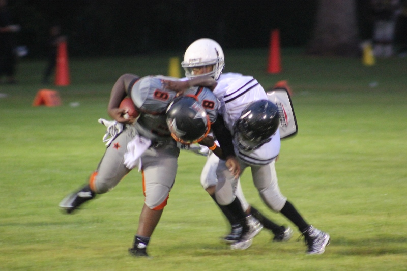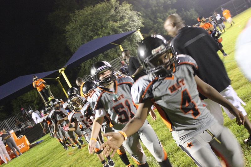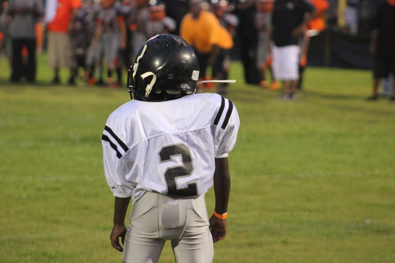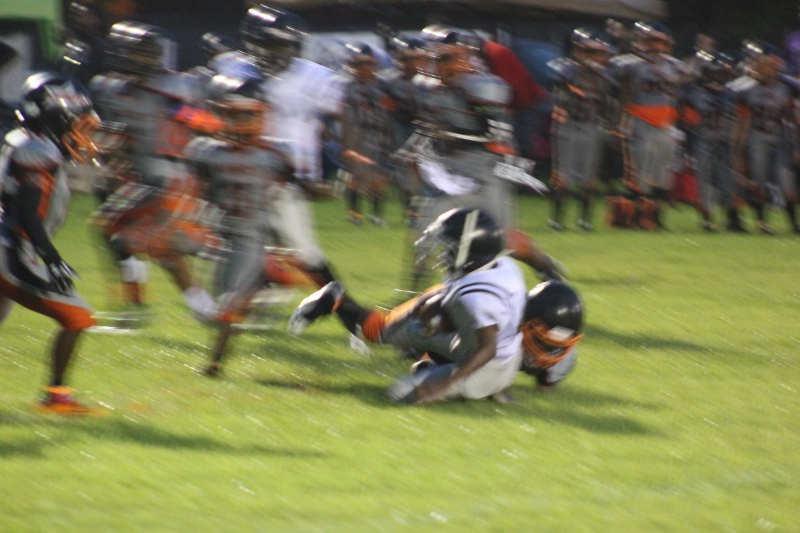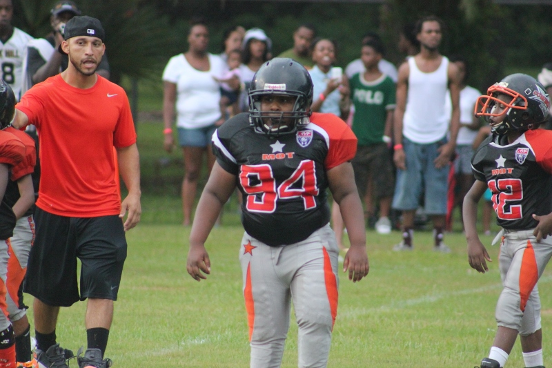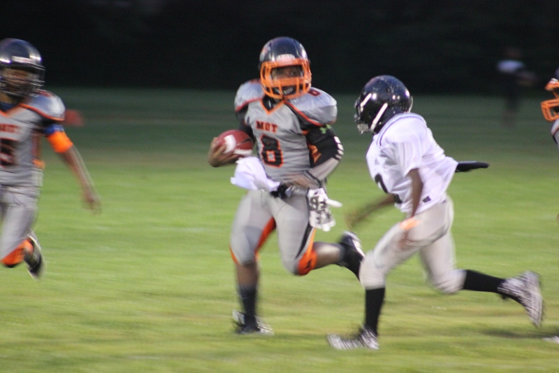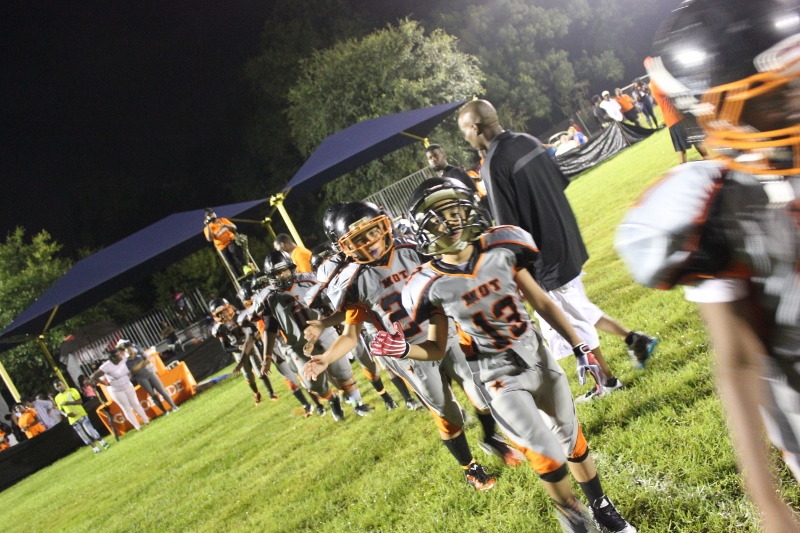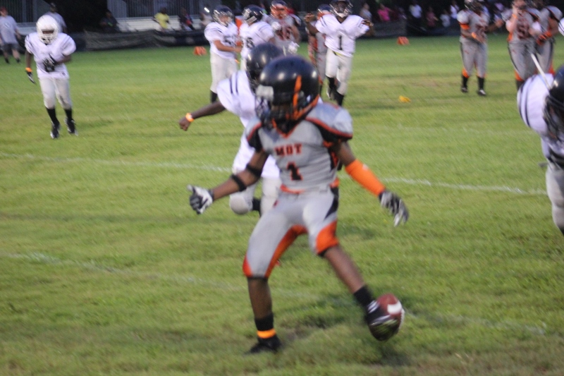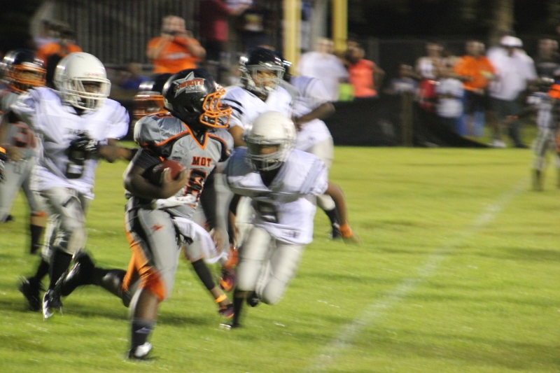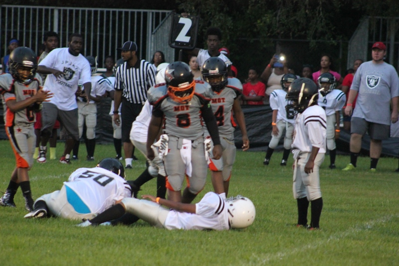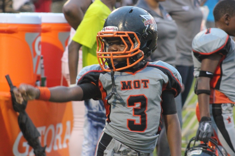 MOT’s #8 Antonian Bivens ran wild tonight for 10U as the cowboys blanked the JPJAA Raiders 31-0. Bivens, or T.O as they affectionate call him, ran for three touchdowns on the night, bulldozing his way through tacklers. The Raiders wanted no part of T.O when the ball was in his hands. He asserted his will against the defense all evening. The Cowboys defense was just as assertive as their offense. #9 Tarrance Stamper a LB for the 10U Cowboys led the defense to a shut out. Stamper undoubtedly had the hit of the night. On a kick off return by the Raiders, the returner found an opening around the left end and seemed to have the corner. When Stamper seemingly came out of nowhere and delivered a bone crushing hit.